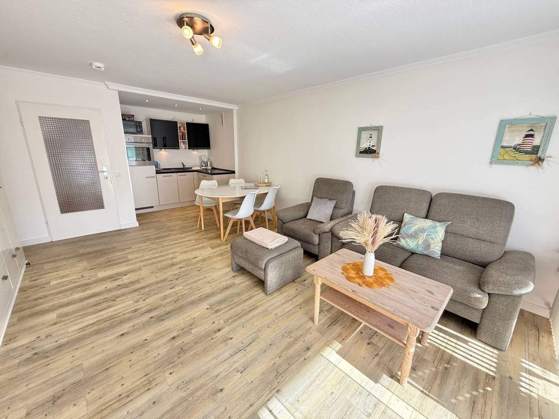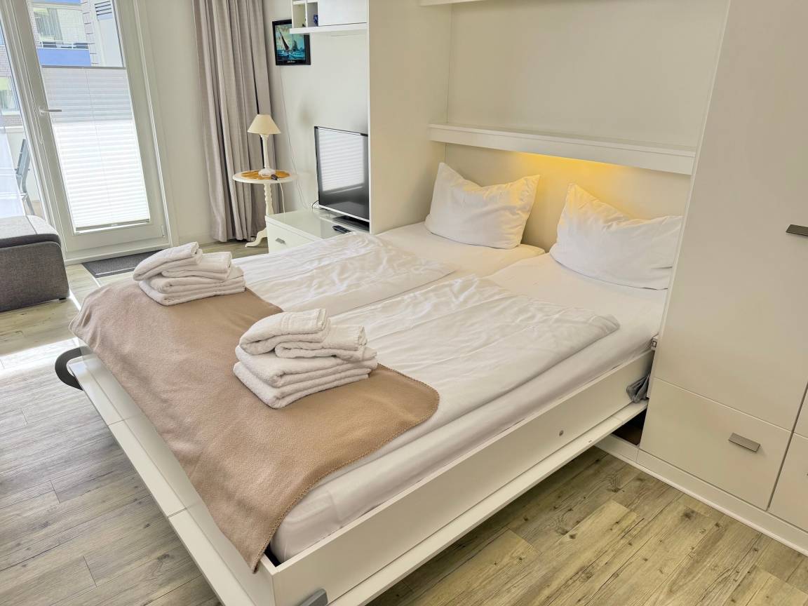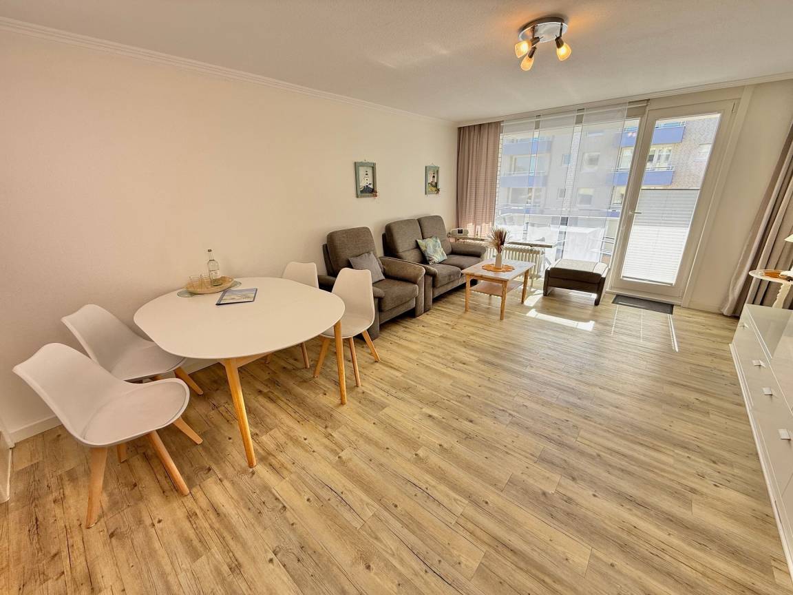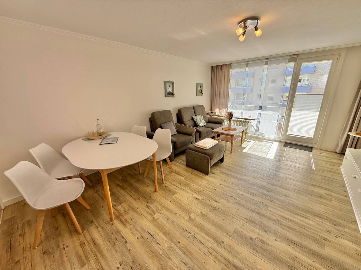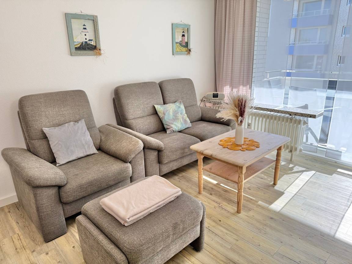 Im Wohnzimmer erwarten Sie eine gemütliche Sitzecke mit 2-Sitzer-Sofa und Sessel, ein Essplatz sowie ein bequemes Doppelschrankbett (ausklappbar, mit getrennten Matratzen). Für Unterhaltung sorgen Sat-TV und Radio. Der angrenzende Südbalkon lädt mit bequemen Balkonmöbeln und Auflagen zu sonnigen Stunden ein.