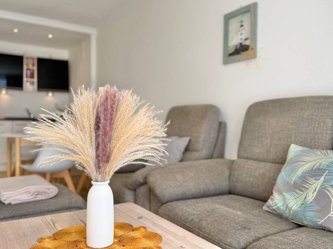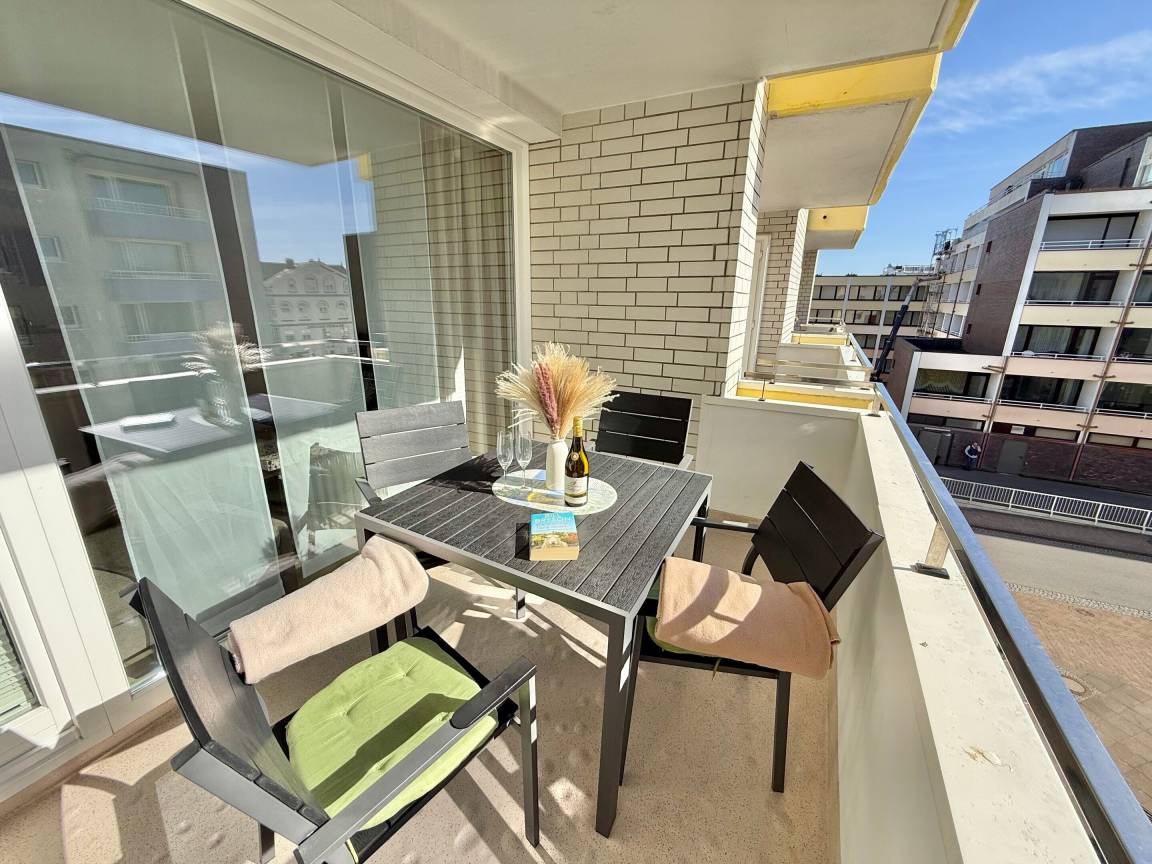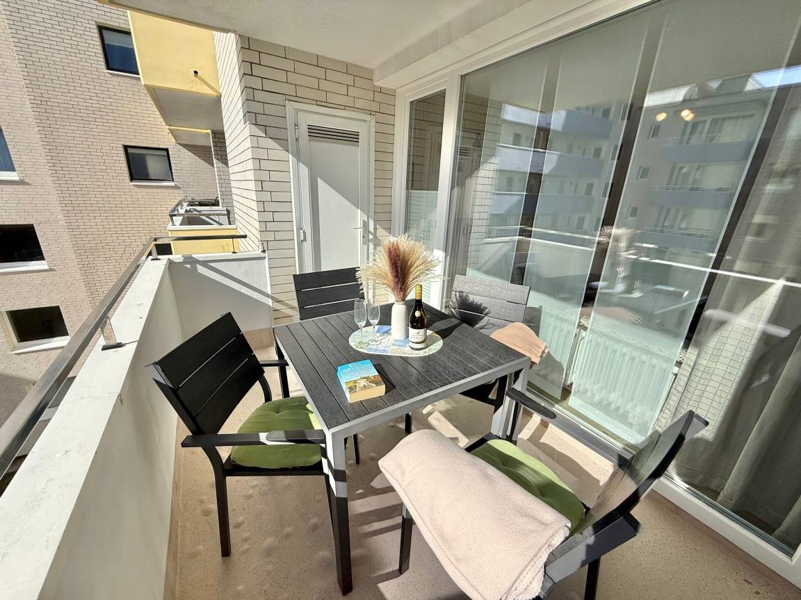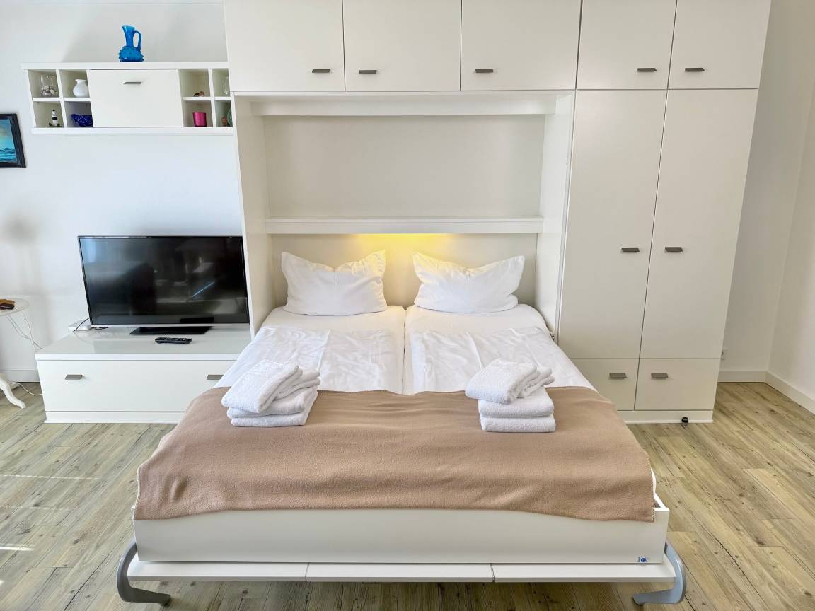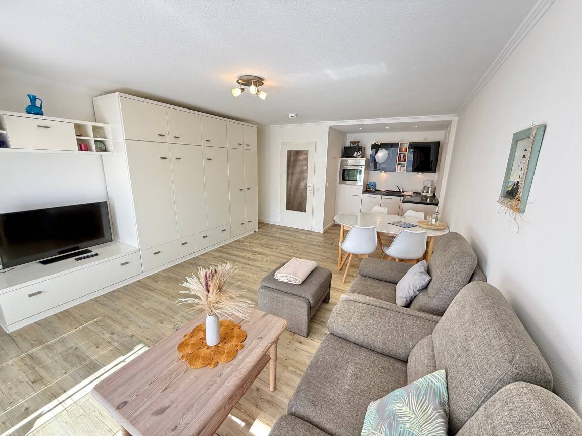 Im Wohnzimmer erwarten Sie eine gemütliche Sitzecke mit 2-Sitzer-Sofa und Sessel, ein Essplatz sowie ein bequemes Doppelschrankbett (ausklappbar, mit getrennten Matratzen). Für Unterhaltung sorgen Sat-TV und Radio. Der angrenzende Südbalkon lädt mit bequemen Balkonmöbeln und Auflagen zu sonnigen Stunden ein.