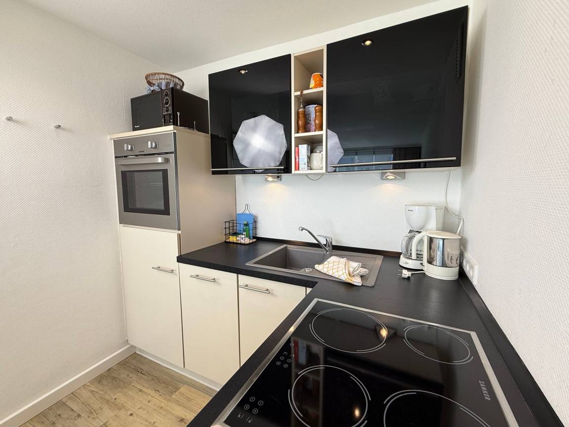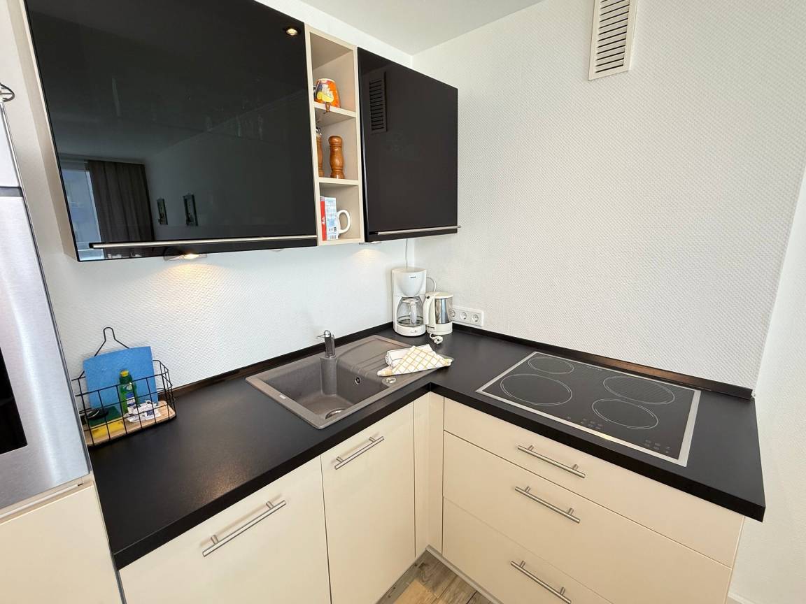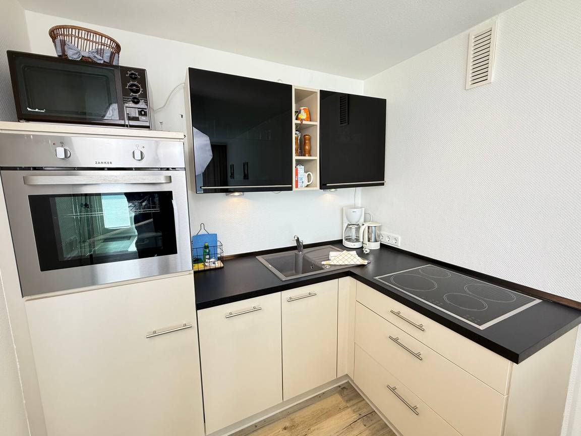 Die offene Küchenzeile ist gut ausgestattet: Geschirrspüler, Mikrowelle, Ceranfeld mit 2 Kochzonen, Kühlschrank mit 3*-Gefrierfach, Kaffeemaschine, Wasserkocher und Toaster stehen bereit.