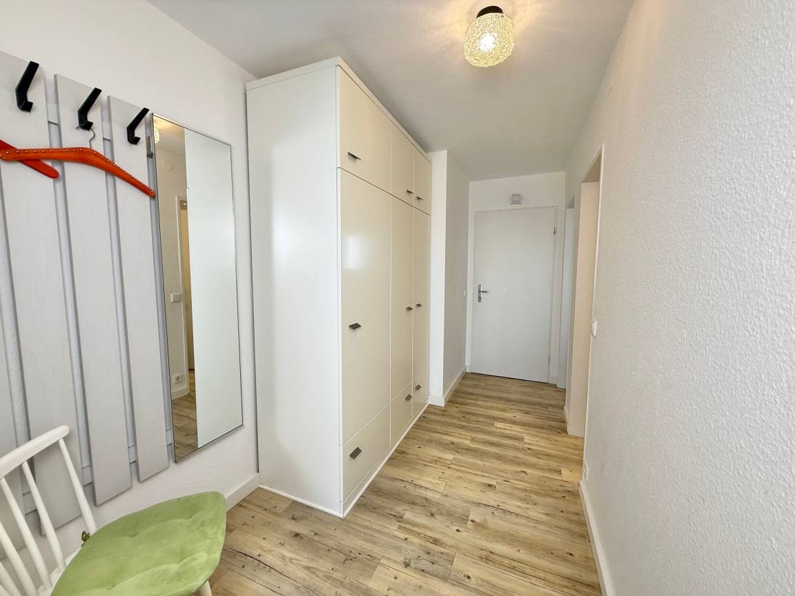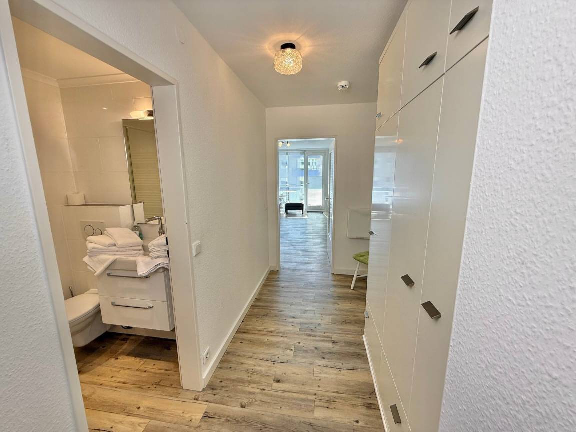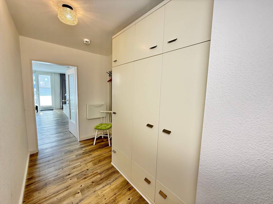 Diese helle 2-Zimmer-Nichtraucher-Ferienwohnung (ca. 48 m²) in der 3. Etage bietet Platz für bis zu 4 Personen und begeistert durch ihre sonnige Ausrichtung zur Südseite. Ideal für alle, die zentral wohnen und ihren Urlaub komfortabel gestalten möchten. Vom Flur mit Garderobe und praktischen Einbauschränken gelangen Sie in das Wohnzimmer mit Zugang zum Südbalkon, die offene Küchenzeile, das Schlafzimmer sowie in das Duschbad/WC.