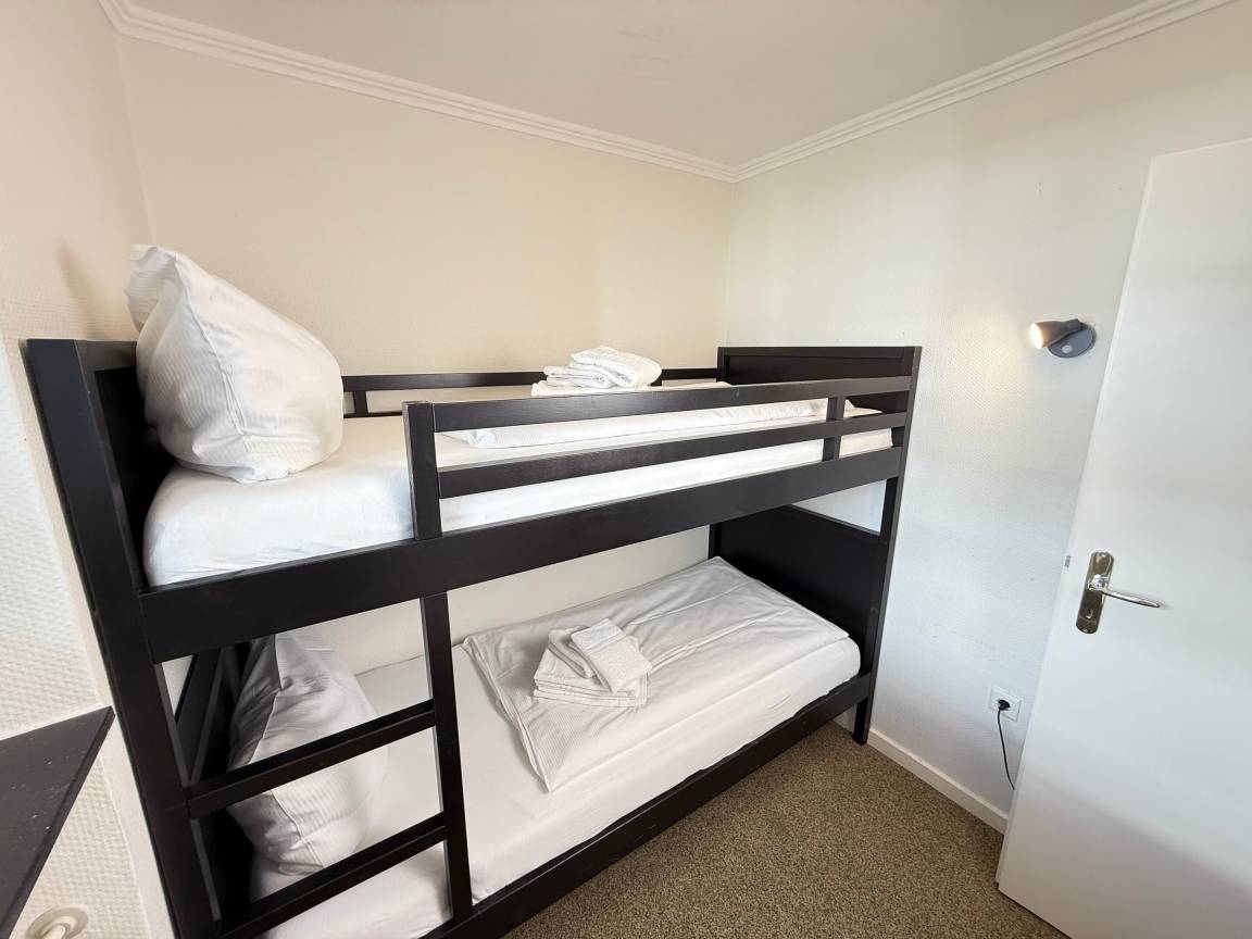 Im separaten Schlafzimmer befindet sich ein Etagenbett, ideal für Kinder oder Mitreisende. Das helle Badezimmer ist mit Dusche, WC und Waschtisch ausgestattet.