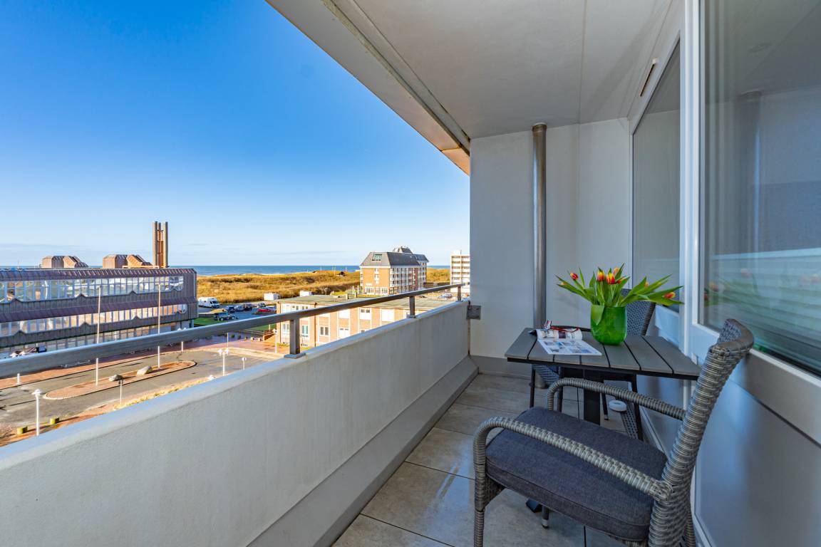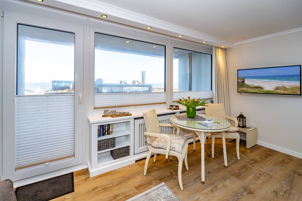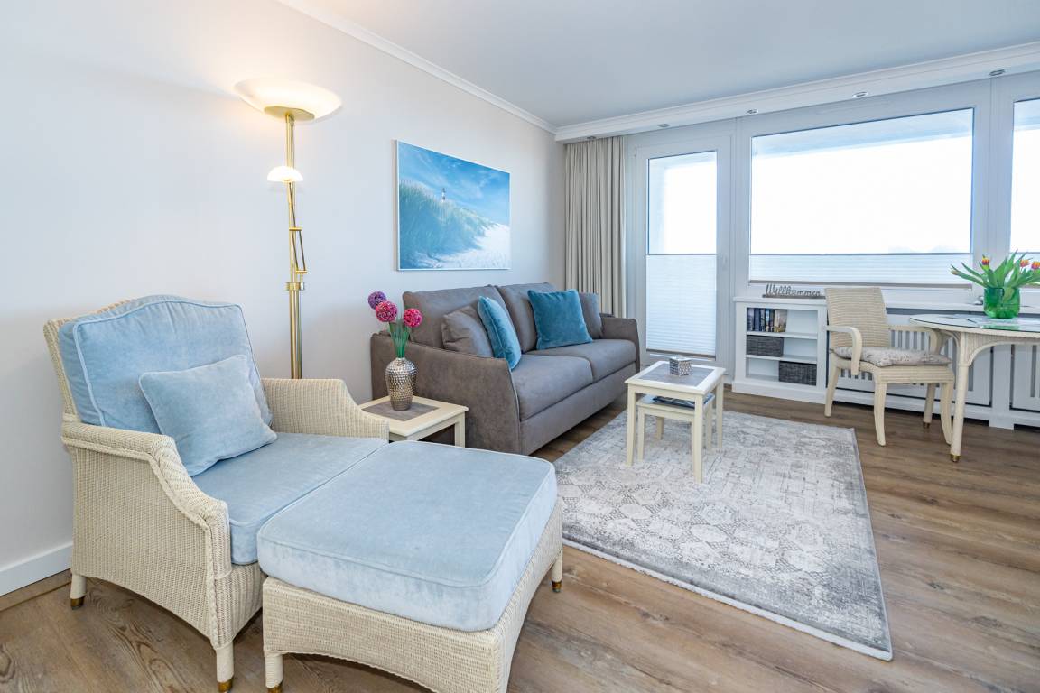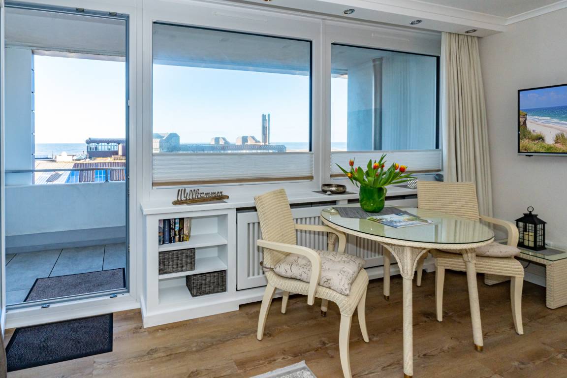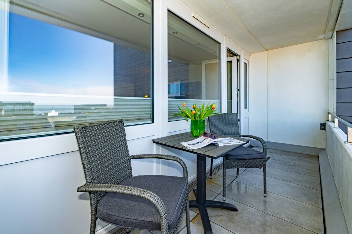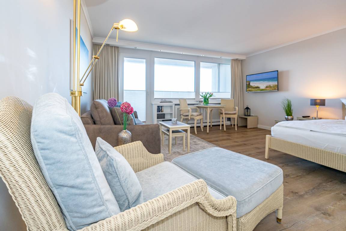 Geschmackvoll ausgestattete 1-Zimmer-Nichtraucher-Ferienwohnung (ca. 40 qm) mit Laminatboden in der 4. Etage zur Seeseite mit schönem Meerblick und Westloggia (Nachmittagssonne, mit Balkonmöbeln und Auflagen).