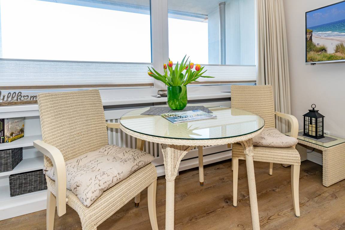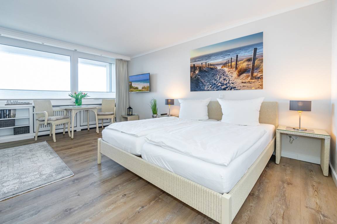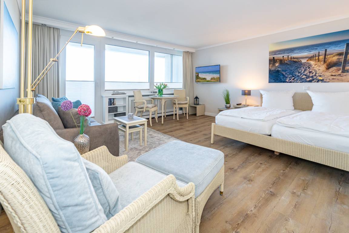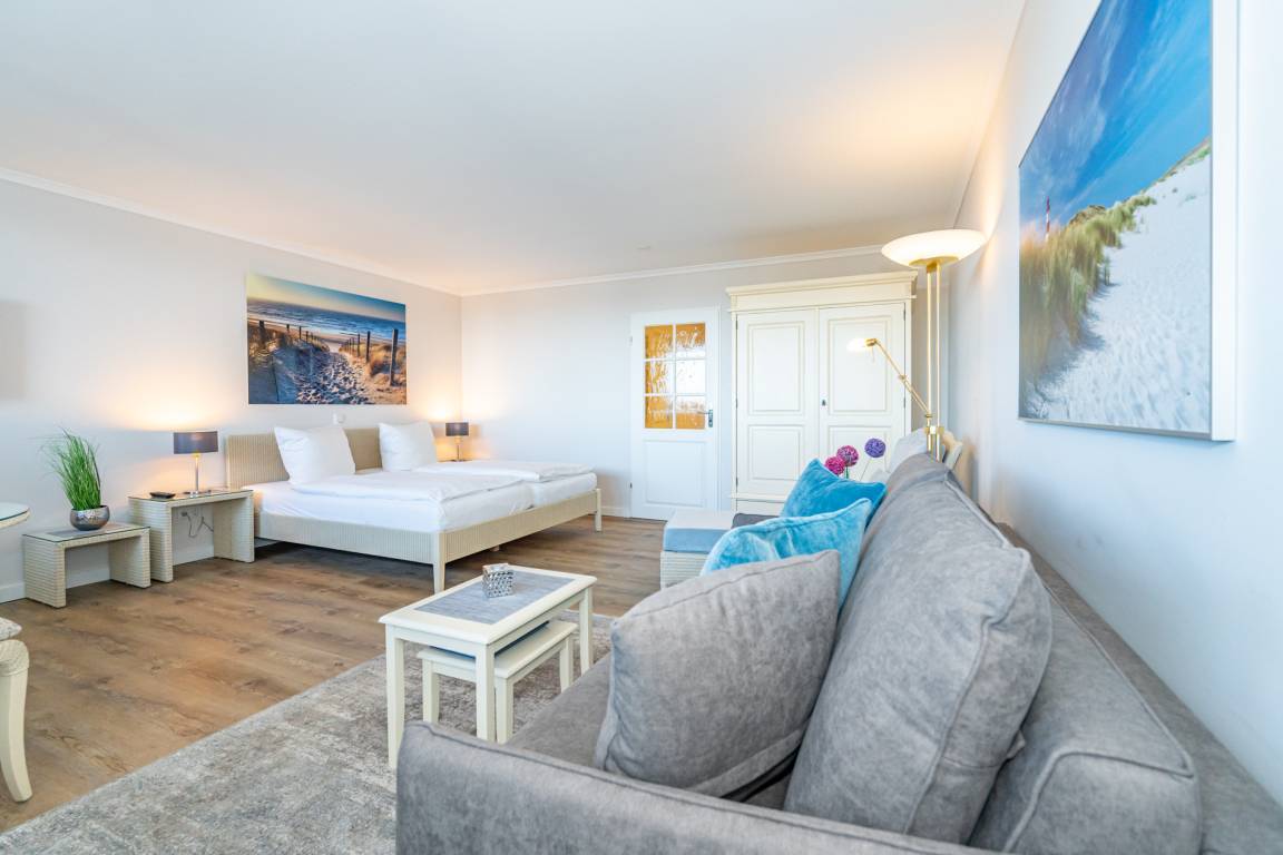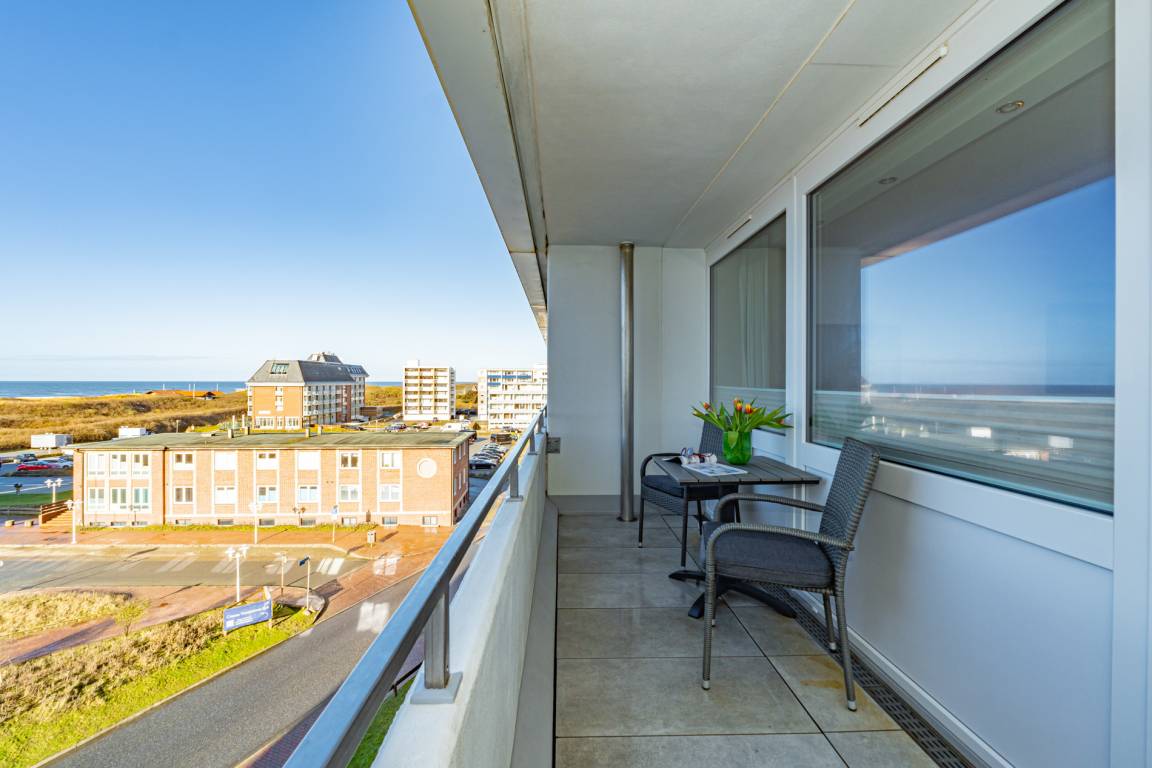 Geschmackvoll ausgestattete 1-Zimmer-Nichtraucher-Ferienwohnung (ca. 40 qm) mit Laminatboden in der 4. Etage zur Seeseite mit schönem Meerblick und Westloggia (Nachmittagssonne, mit Balkonmöbeln und Auflagen).