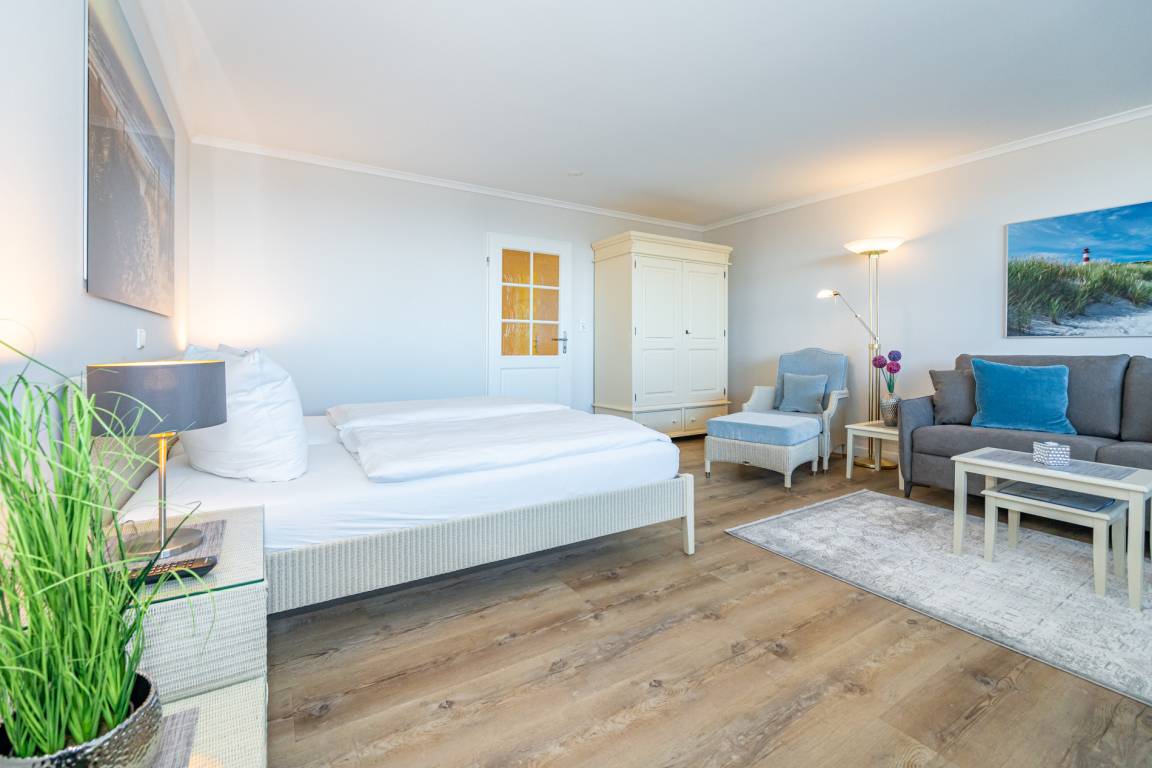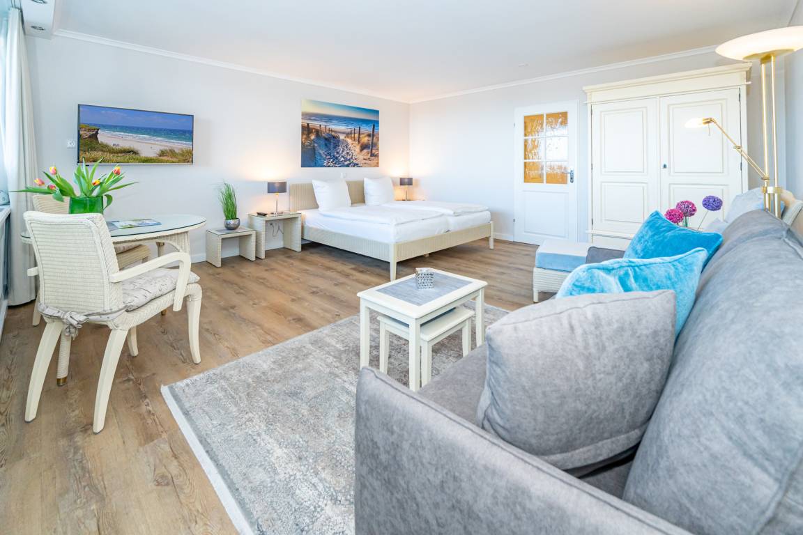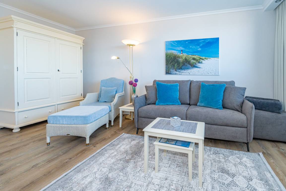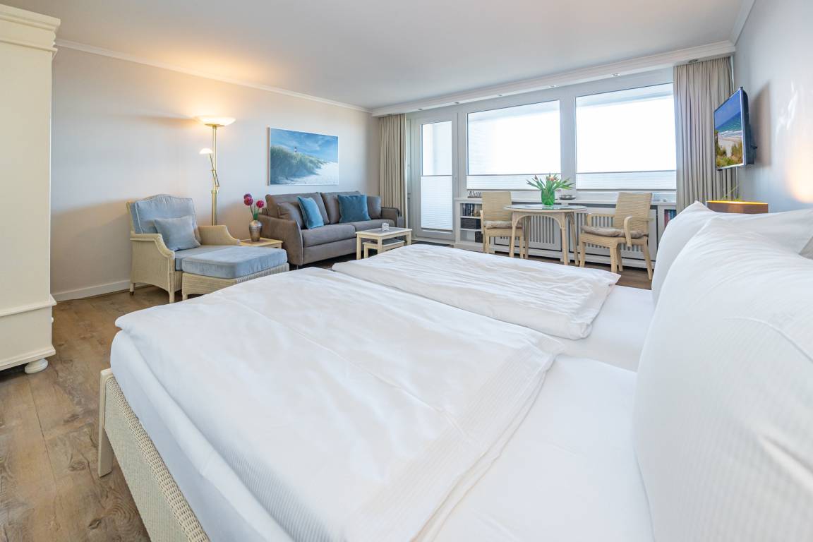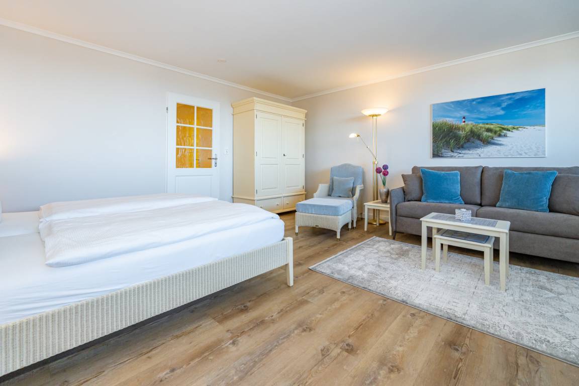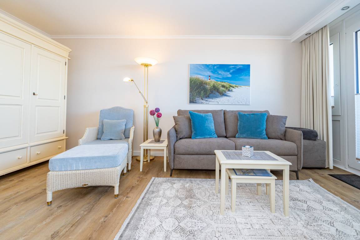 Geschmackvoll ausgestattete 1-Zimmer-Nichtraucher-Ferienwohnung (ca. 40 qm) mit Laminatboden in der 4. Etage zur Seeseite mit schönem Meerblick und Westloggia (Nachmittagssonne, mit Balkonmöbeln und Auflagen).