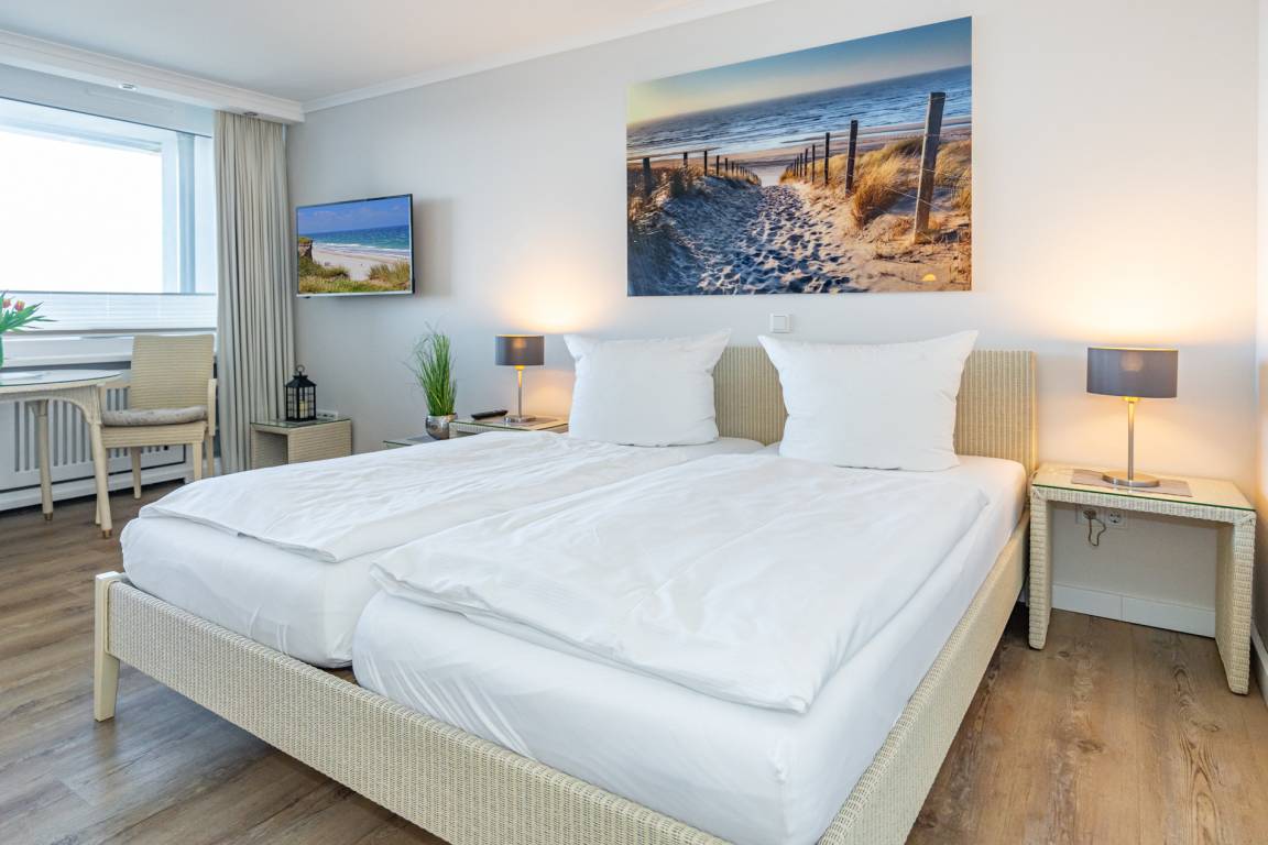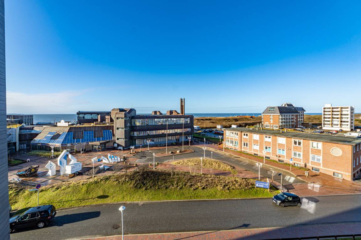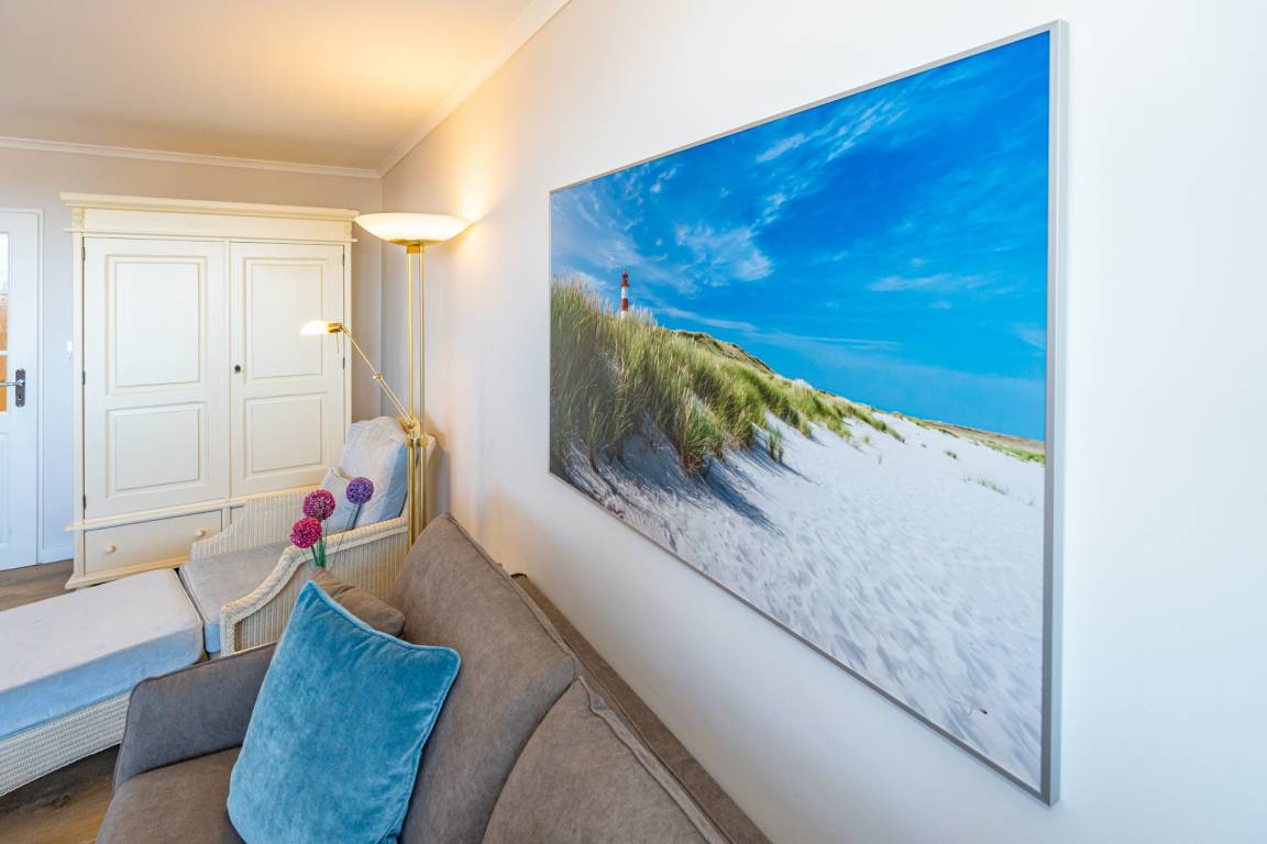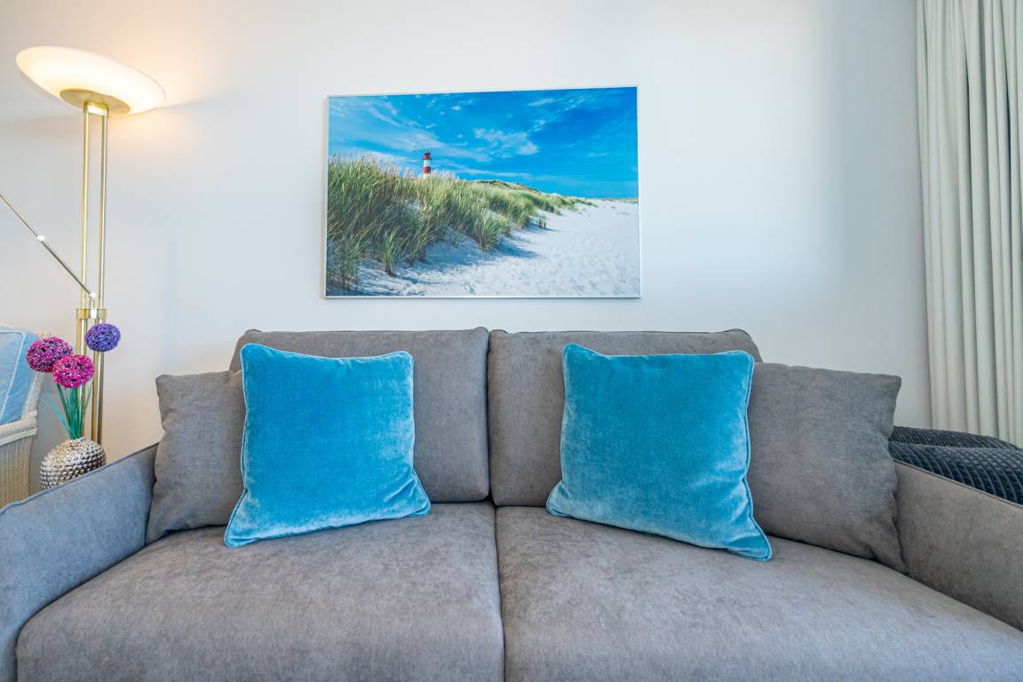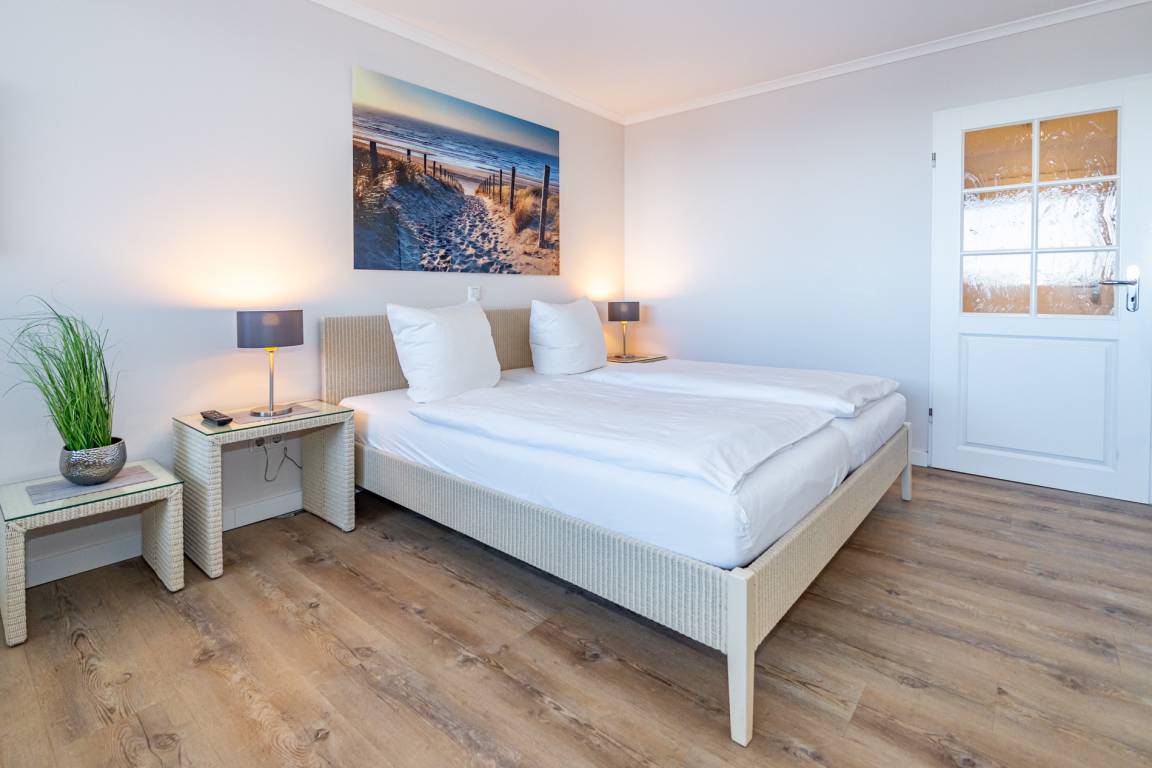 Geschmackvoll ausgestattete 1-Zimmer-Nichtraucher-Ferienwohnung (ca. 40 qm) mit Laminatboden in der 4. Etage zur Seeseite mit schönem Meerblick und Westloggia (Nachmittagssonne, mit Balkonmöbeln und Auflagen).