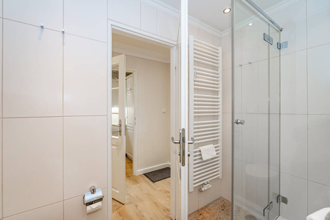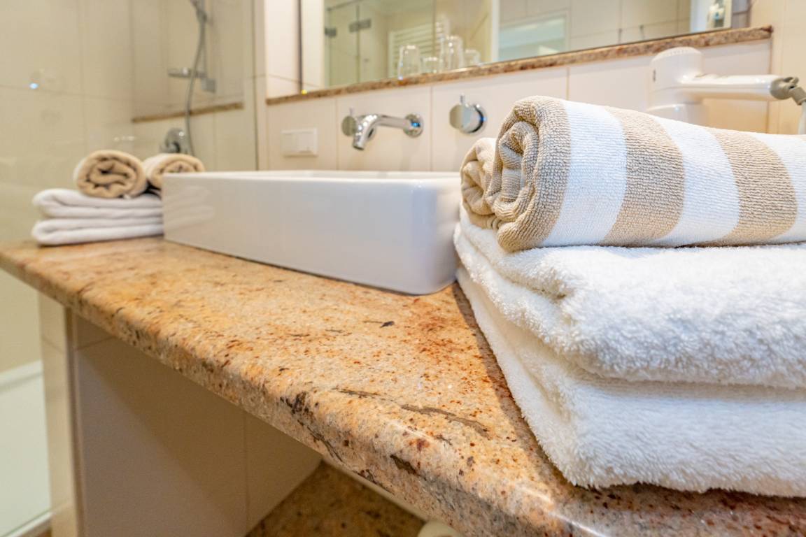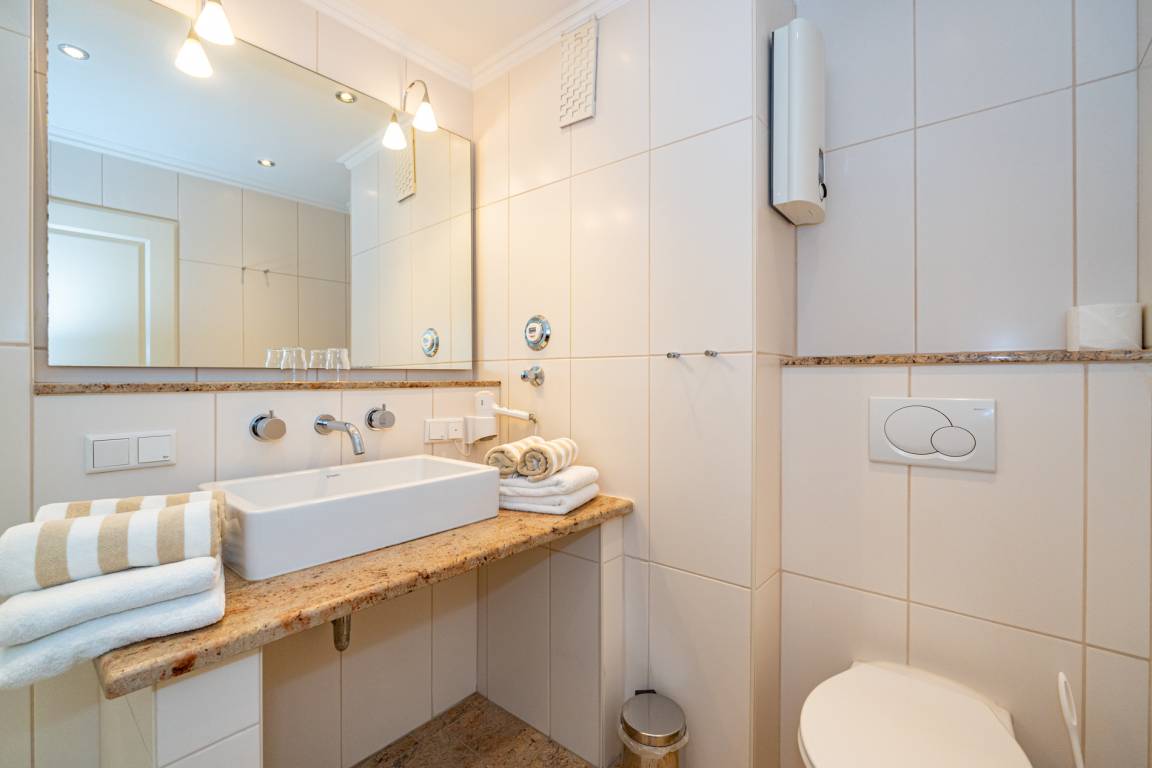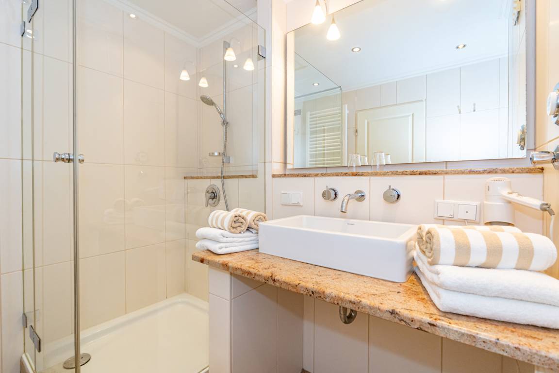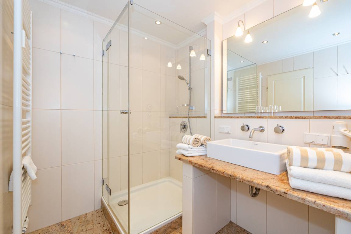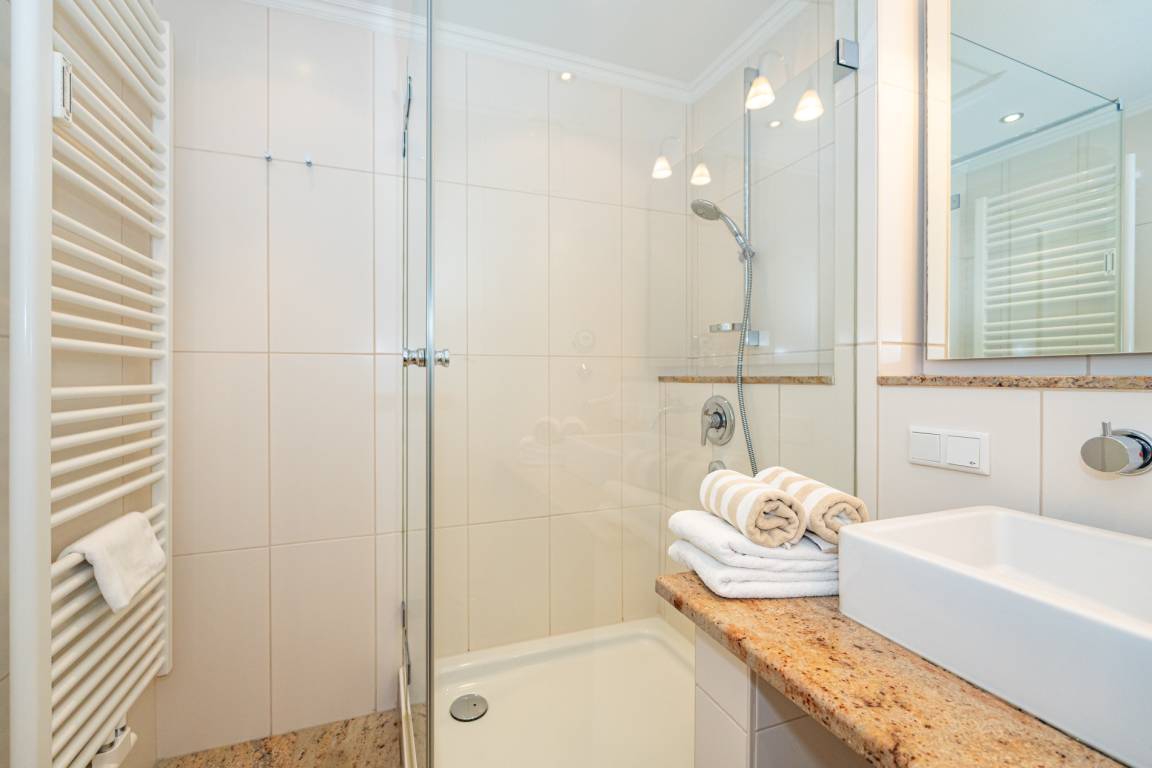 Im neuen, modernen Bad befinden sich eine Dusche, ein WC, ein Waschtisch, ein Handtuchtrockner und ein Fön.