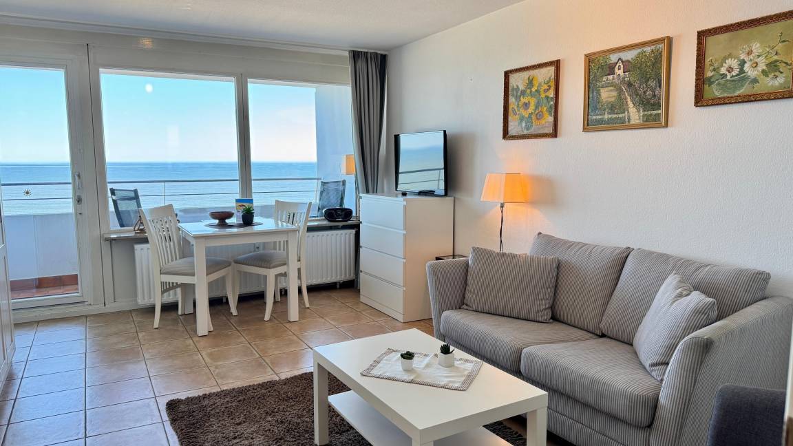 Im gefliesten Wohnraum steht Ihnen eine weiße Appartementwand mit Einzelbetten zur Verfügung. Der Essbereich mit Blick auf die Nordsee ist mit einem weißen Esstisch und 2 Stühlen ausgestattet. Eine hochwertige Couch, ein Clubsessel und ein Tischchen, sowie ein neuer Flachbildfernseher (an der Wand hängend) runden das Bild ab. Im Duschbad befindet sich eine Runddusche und eine Handtuchheizung. Es ist hell gefliest. Im Flurbereich steht Ihnen eine voll ausgestattete Küchenzeile mit 4-Platten-Ceranfeld, Mikrowelle und Geschirrspüler zur Verfügung. Der große Westbalkon lädt zum Sonnenbaden ein und bietet einen herrlichen Seeblick.