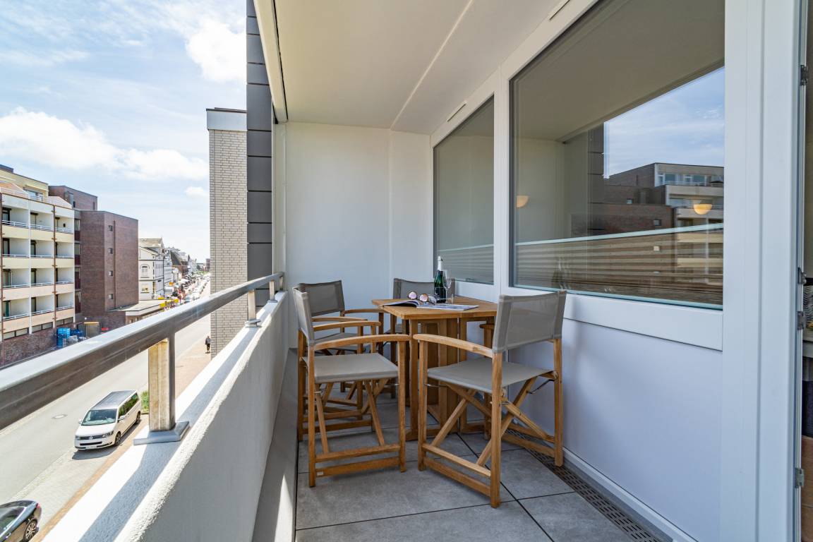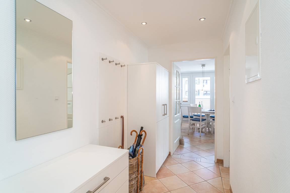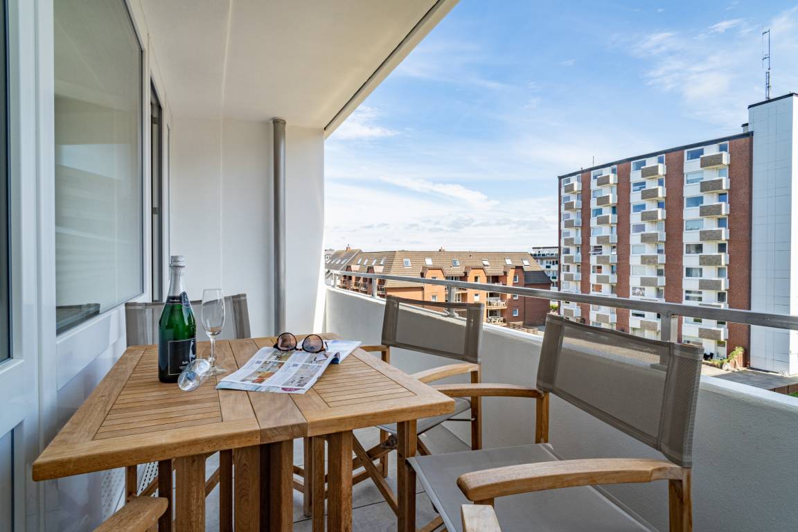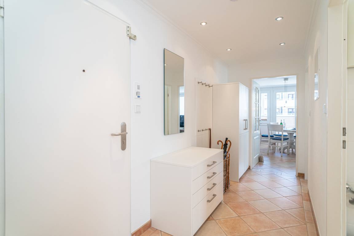 Schicke, komplett mit Fliesen ausgelegte 3-Zimmer-Ferienwohnung (ca. 63 qm) in der 3. Etage zur Landseite mit Ostloggia (Morgensonne, mit Balkonmöbeln und Auflagen) für max. 4 Personen.
