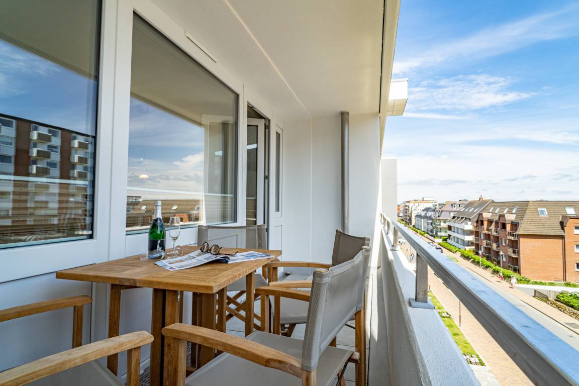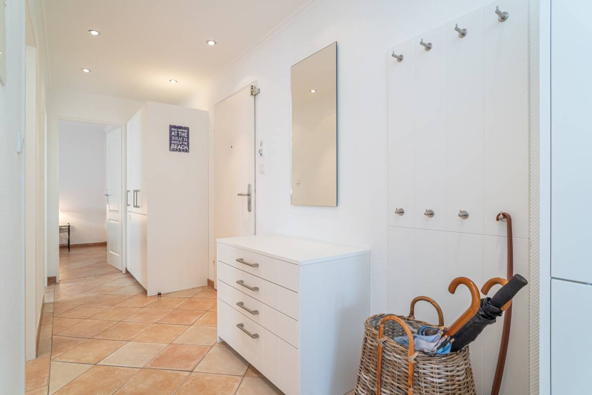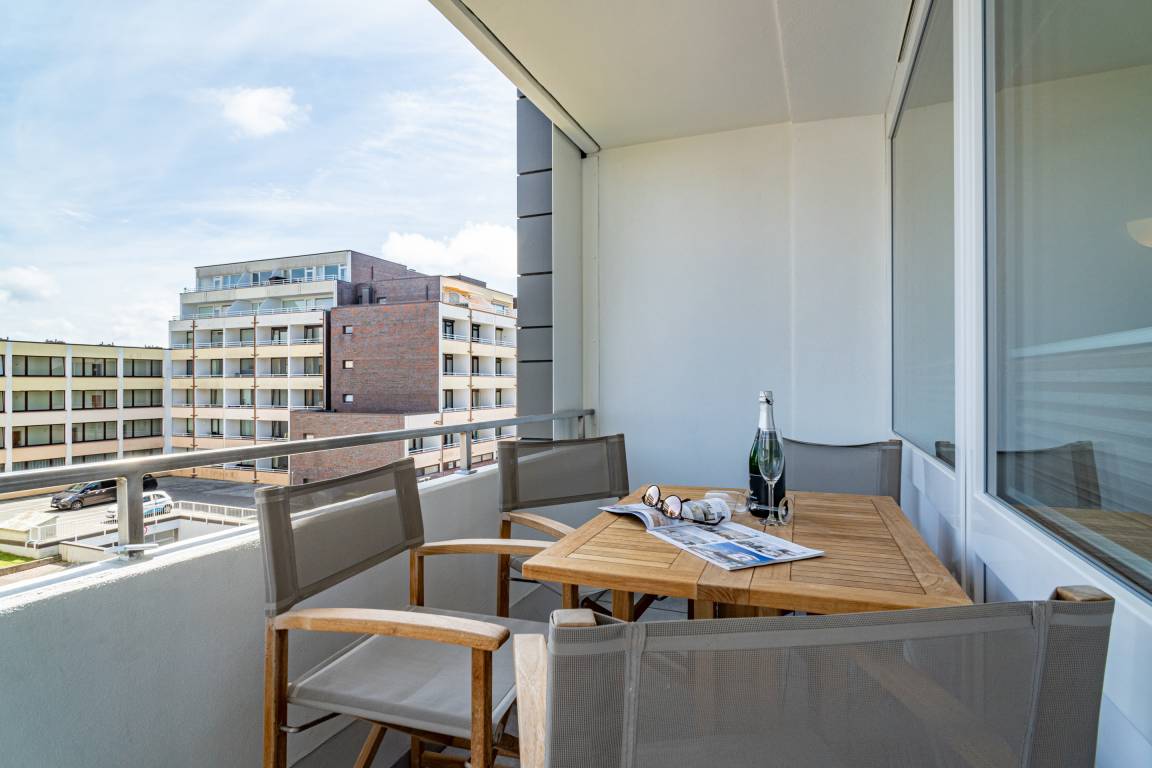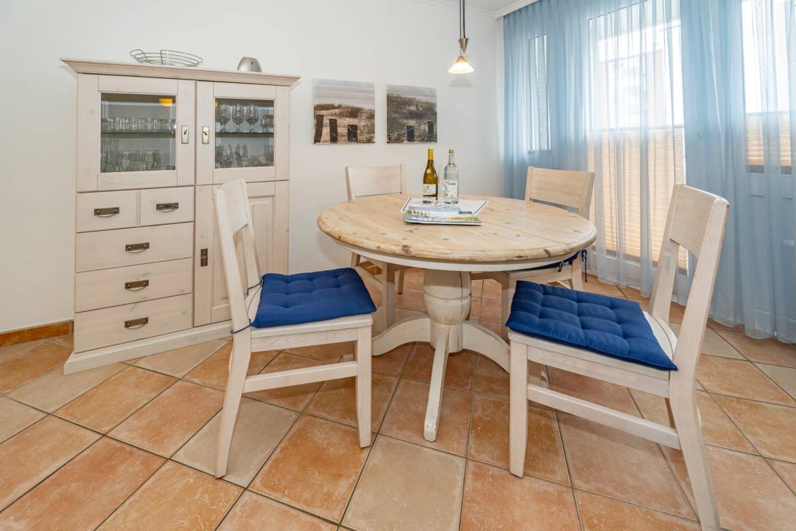 Schicke, komplett mit Fliesen ausgelegte 3-Zimmer-Ferienwohnung (ca. 63 qm) in der 3. Etage zur Landseite mit Ostloggia (Morgensonne, mit Balkonmöbeln und Auflagen) für max. 4 Personen.