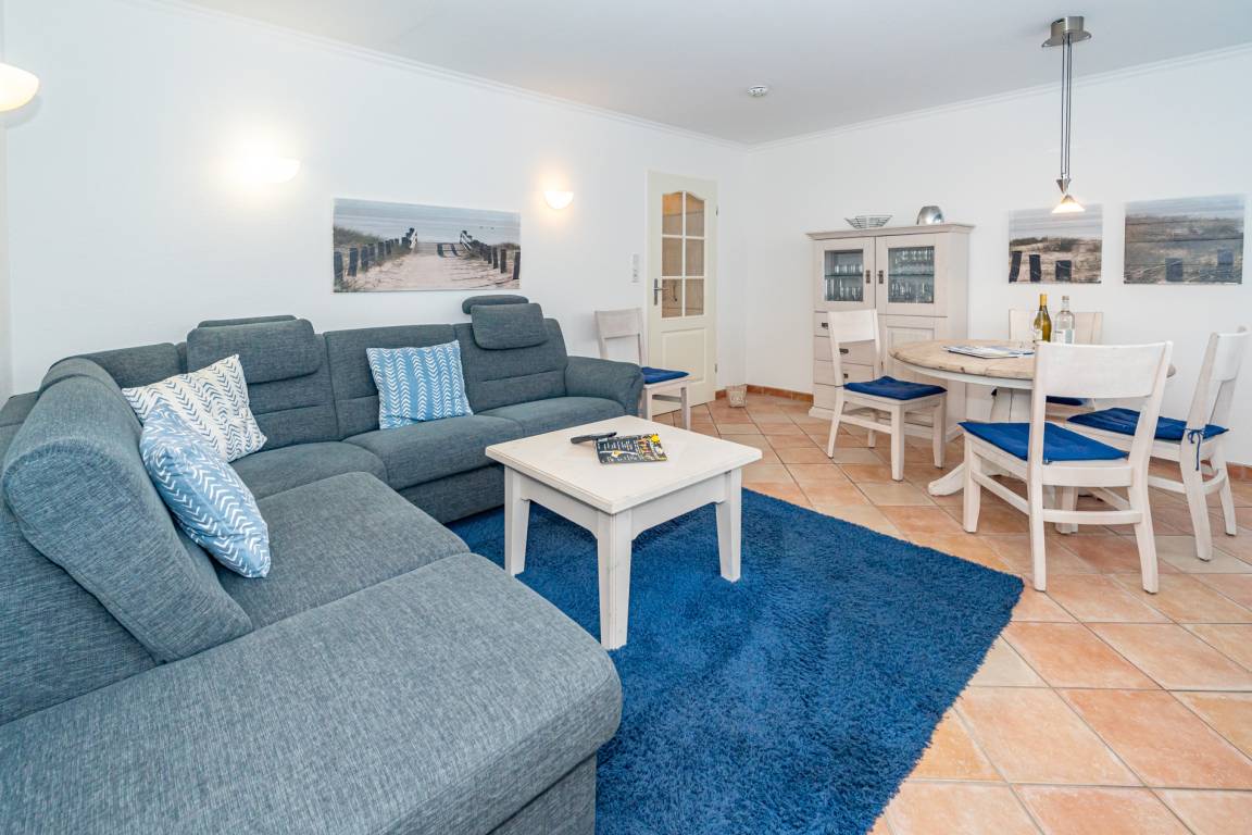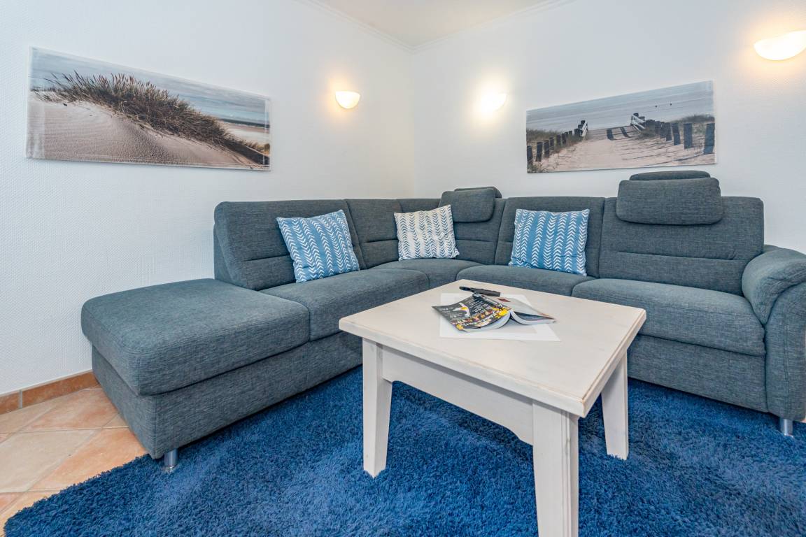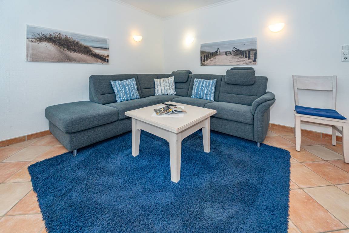Der Wohnraum besteht aus einer bequemen Sitzgarnitur (große Eck-Couch ohne Schlaffunktion), einem Essplatz, Kabel-Flachbild-TV, Telefon.