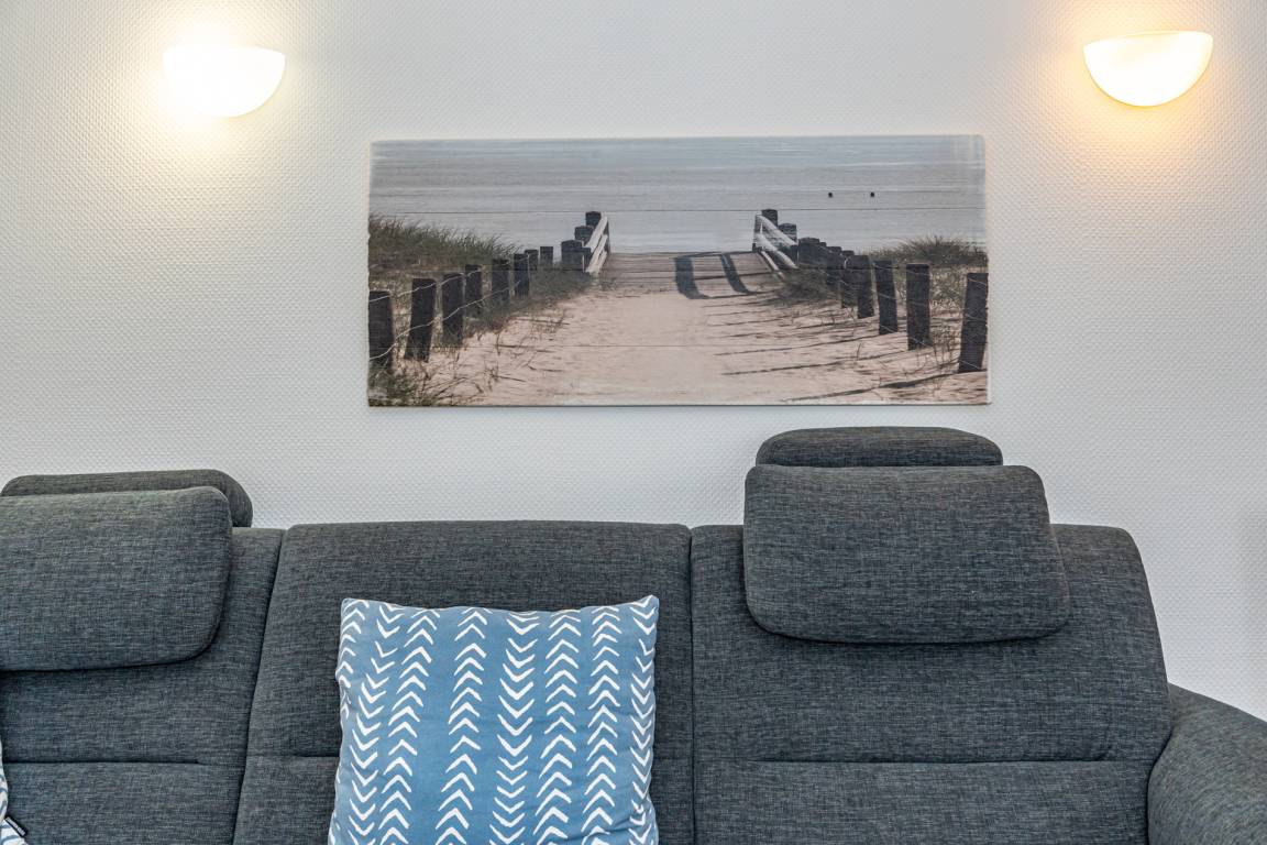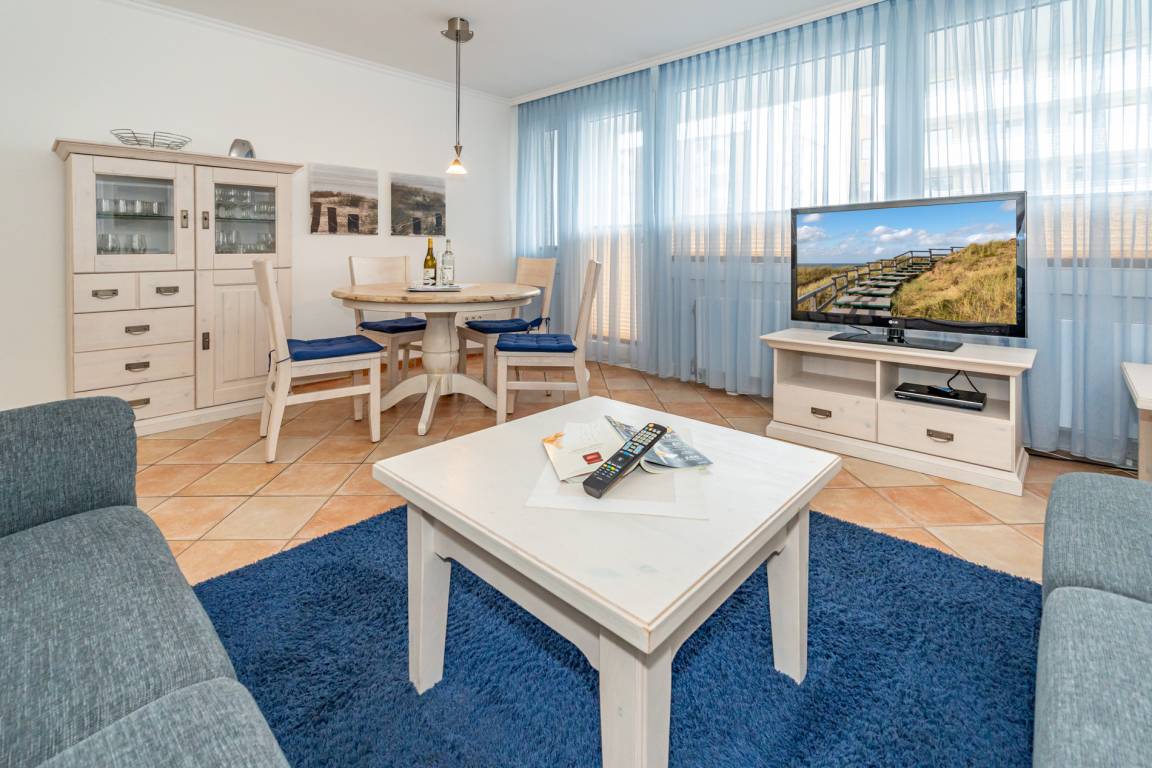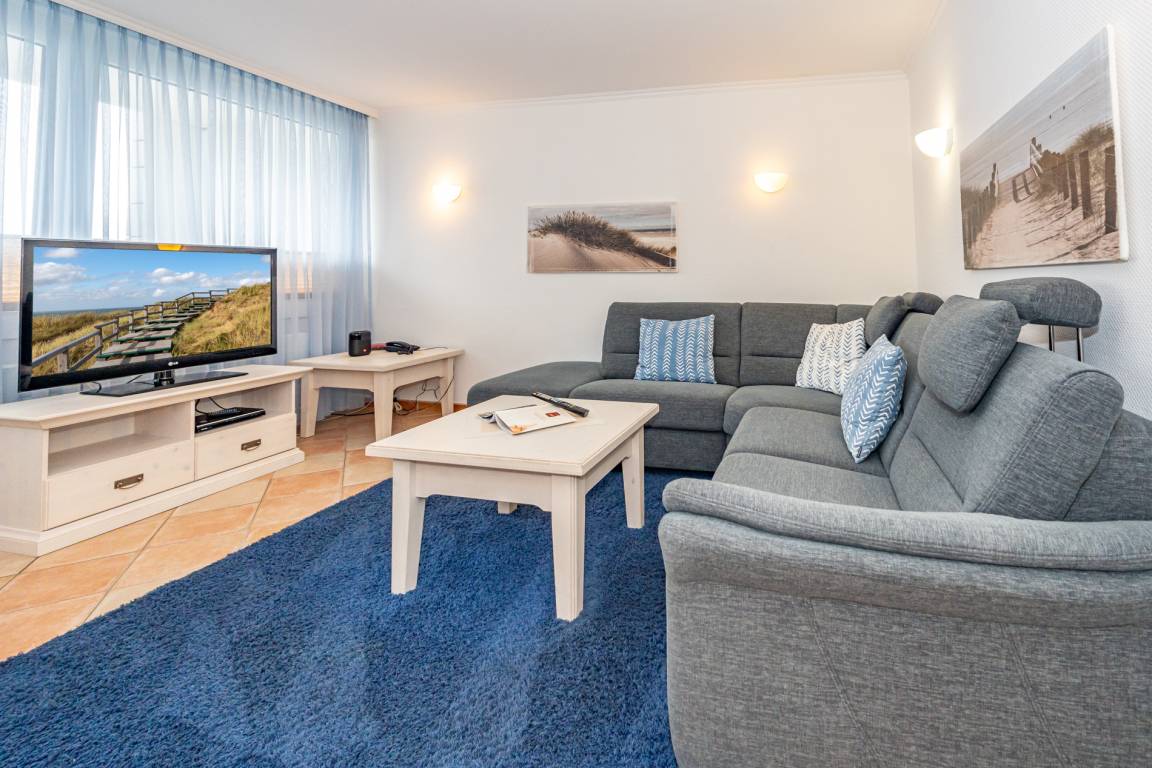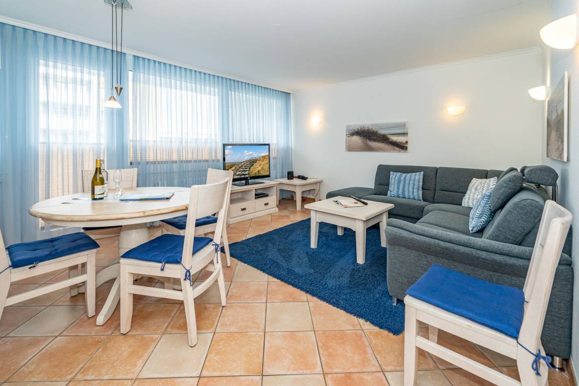 Der Wohnraum besteht aus einer bequemen Sitzgarnitur (große Eck-Couch ohne Schlaffunktion), einem Essplatz, Kabel-Flachbild-TV, Telefon.