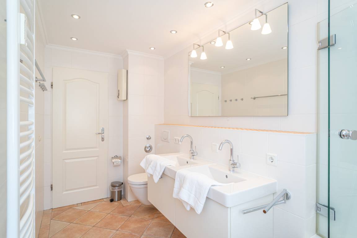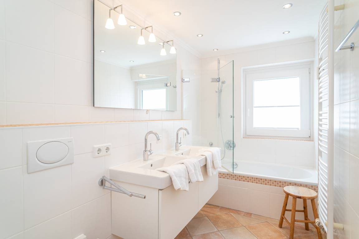 Das neue, großzügige Bad hat eine Wanne mit Duschmöglichkeit und Glastrennwand, ein WC, einen Doppelwaschtisch, einen Handtuchtrockner und ein Fenster.