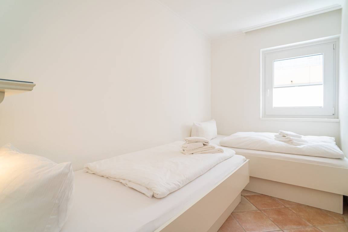 Das große Schlafzimmer ist mit einem bequemen Doppelboxspringbett (200x200cm, Einzelmatratzen mit durgehendem Topper) und das kleine Schlafzimmer mit zwei über Eck stehenden Einzelbetten ausgestattet.