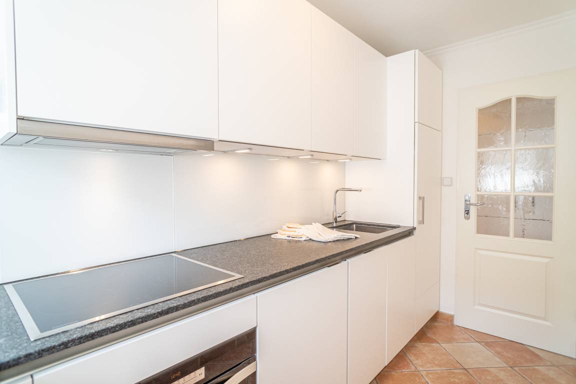 Die separate Küche hat einen Geschirrspüler, Herd mit Backofen und Cerankochfeld, eine Mikrowelle, einen Kühlschrank mit 3-Sterne-Gefrierfach und ein Fenster. Kaffeemaschine, Wasserkocher und Toaster gehören zur Grundausstattung.
