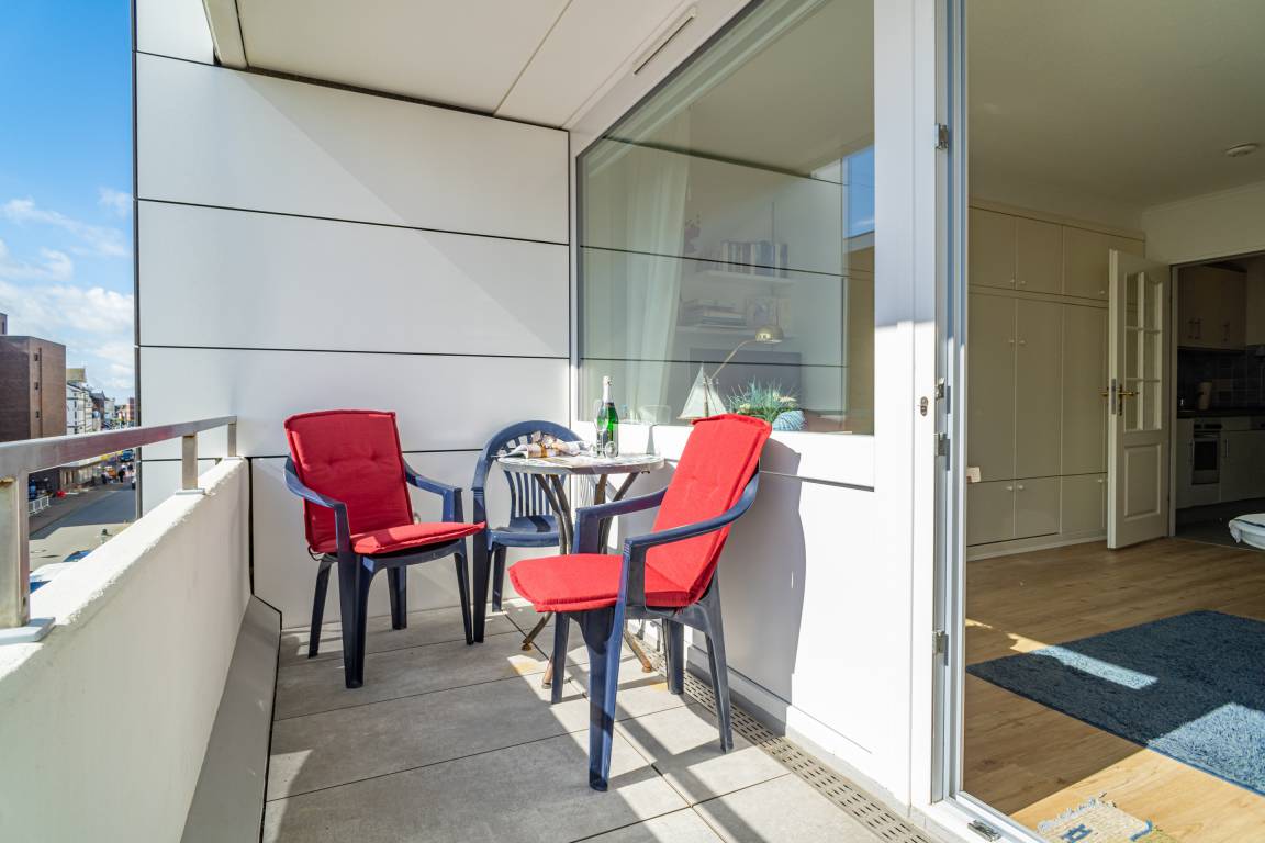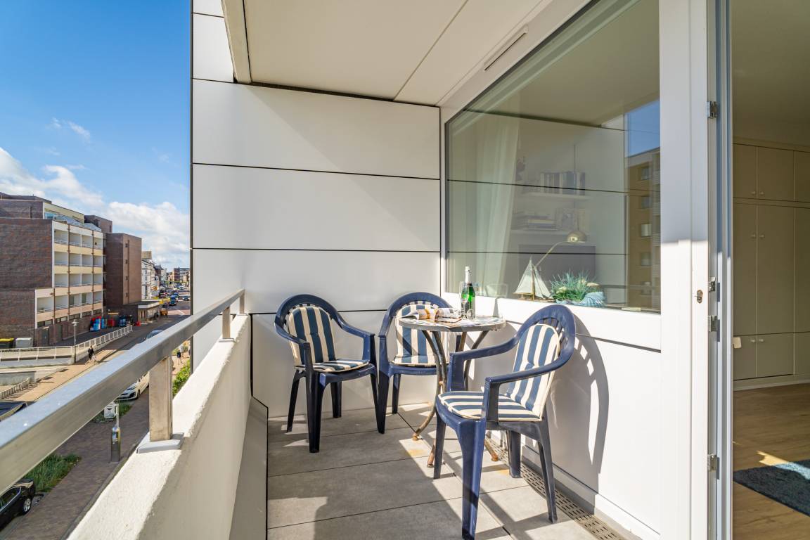 Hochwertig und schick eingerichtete 1-Zimmer-Nichtraucher-Ferienwohnung, ca. 28 m², in der 3. Etage, mit Ostloggia (Morgensonne, mit Balkonmöbeln und Auflagen) für max. 2 Personen.