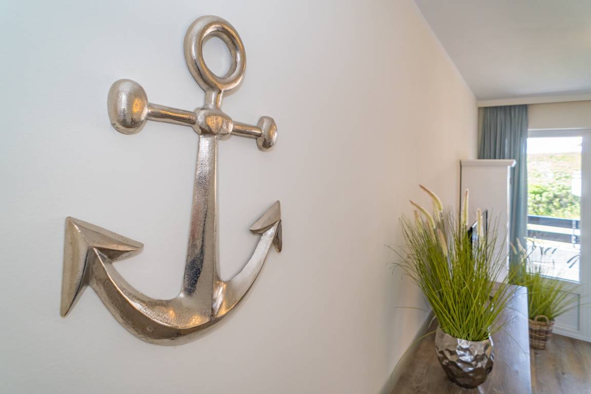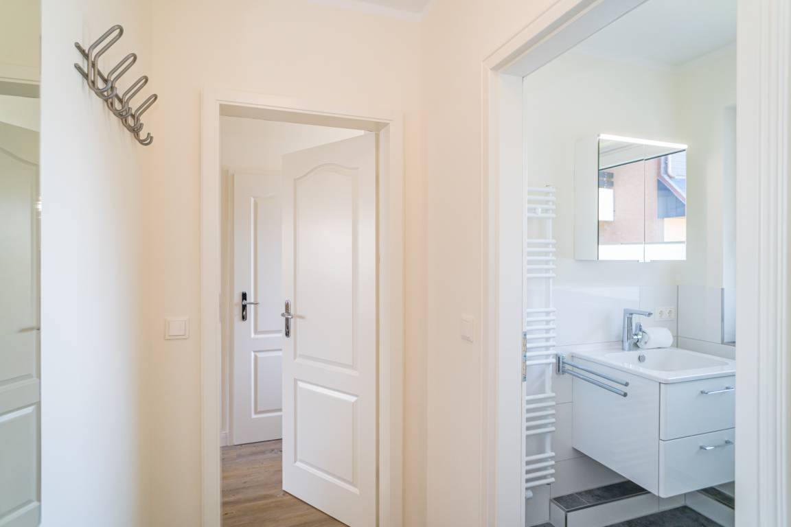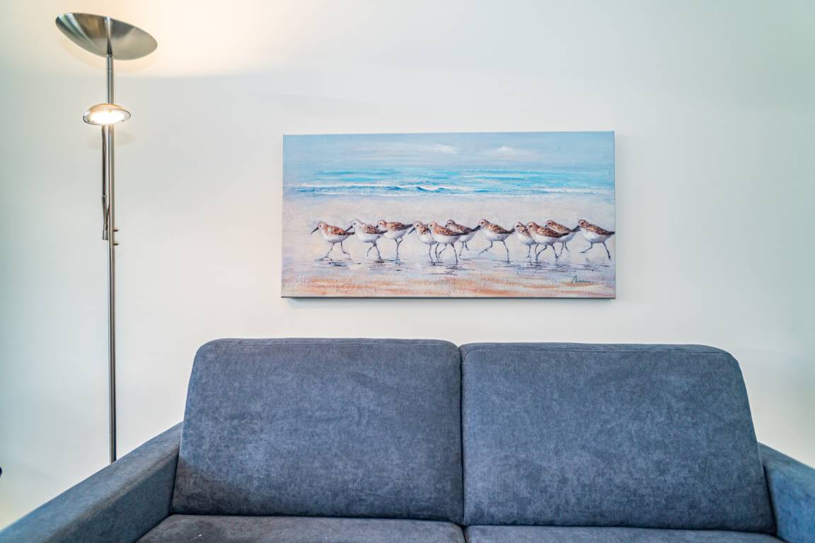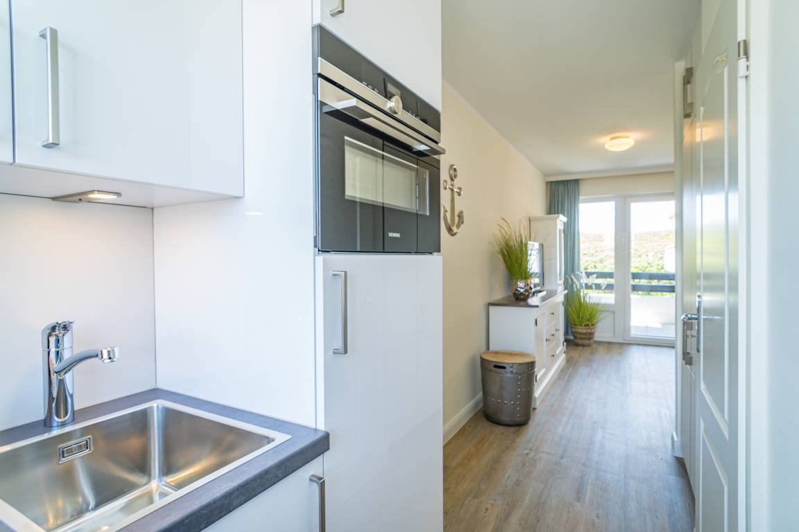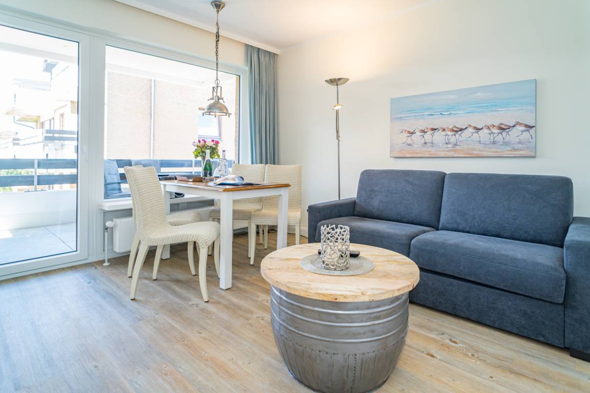 Beim Betreten der Wohnung gelangen Sie über den einladenden Vorflur mit Garderobe in den offenen Wohnbereich, der sich harmonisch in Wohn-, Schlaf- und Küchenbereich gliedert, sowie in das helle Duschbad/WC. Der Wohnbereich besticht durch ein modernes Schlafsofa (Liegefläche 150 x 190 cm), eine elegante Vitrine, ein stilvolles Sideboard und einen bequemen Armlehnstuhl. Ein separater Esstisch mit vier Stühlen lädt zu gemeinsamen Mahlzeiten ein. Für Ihre Unterhaltung sorgen ein Stereo-Radio, ein großer Flachbild-TV, ein Telefon mit Flatrate ins deutsche Festnetz und schnelles WLAN (100.000 MBit/s, ohne Garantie). Der Zugang zum Westbalkon ermöglicht Ihnen entspannte Stunden im Freien.