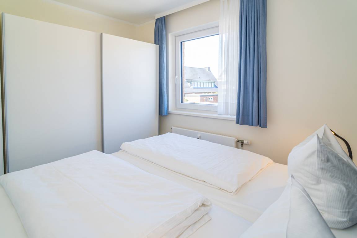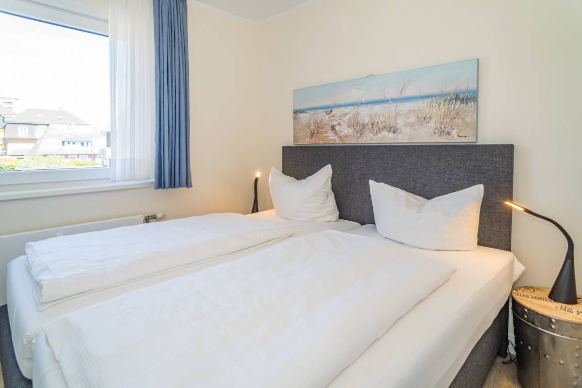 Im Schlafzimmer sorgt ein hochwertiges, neues Boxspring-Doppelbett mit Einzelmatratzen (180 x 200 cm) für optimalen Schlafkomfort. Zwei praktische Nachttische sowie ein großer Einbau-Kleiderschrank runden diesen Raum ab.