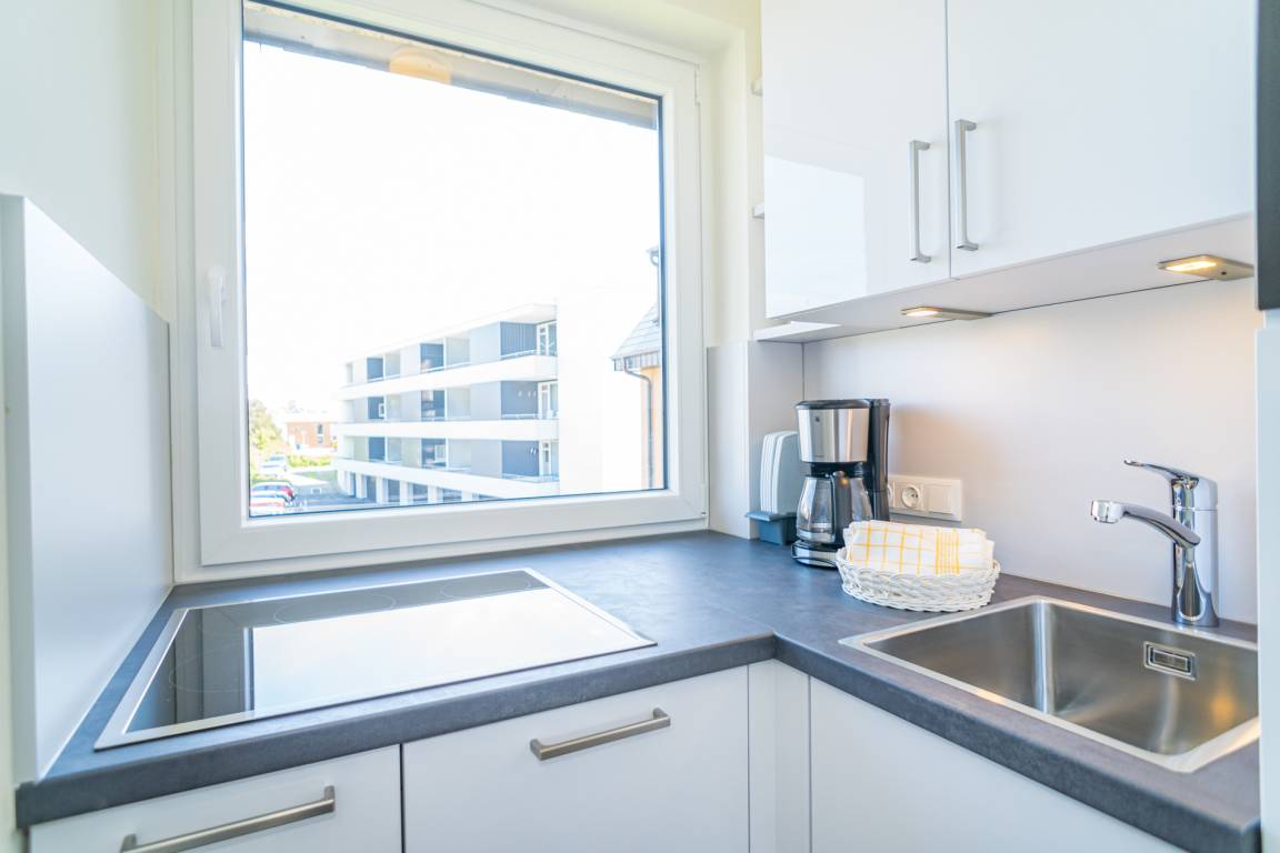 Die offene, neu gestaltete Einbauküche mit Fenster ist mit einem 4-Platten-Ceranfeld, einer Backofen-Mikrowellen-Kombi, einem großzügigen Kühlschrank mit 3-Sterne-Gefrierfach und einer Geschirrspülmaschine ausgestattet. Zur Grundausstattung zählen zudem eine Kaffeemaschine (auch für Kaffeepads geeignet), ein Wasserkocher, ein Toaster und sämtliches Küchenzubehör.