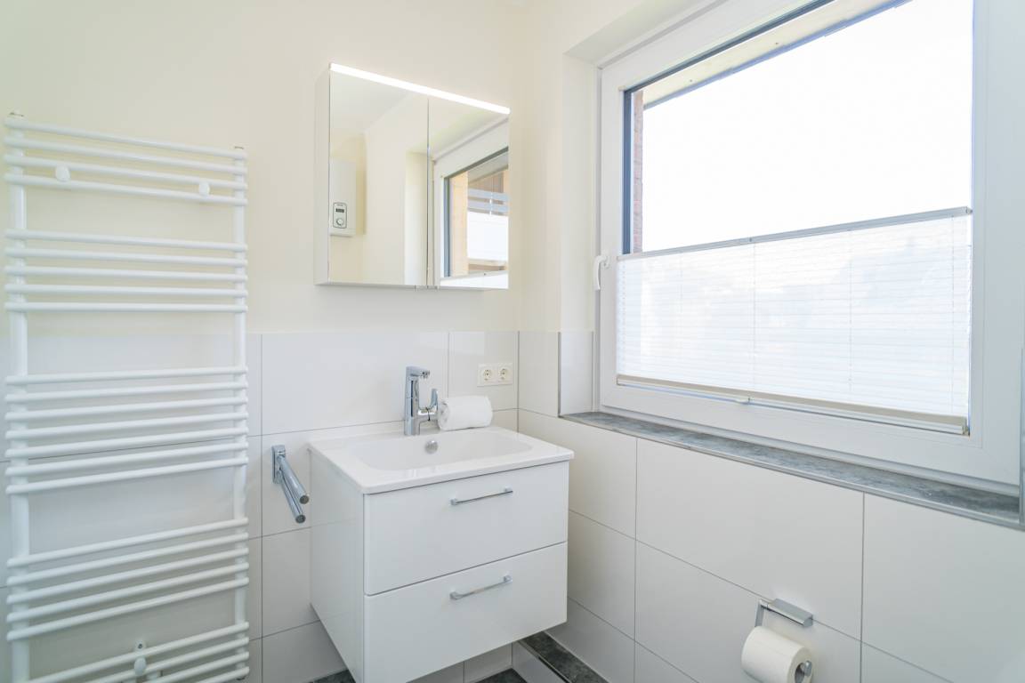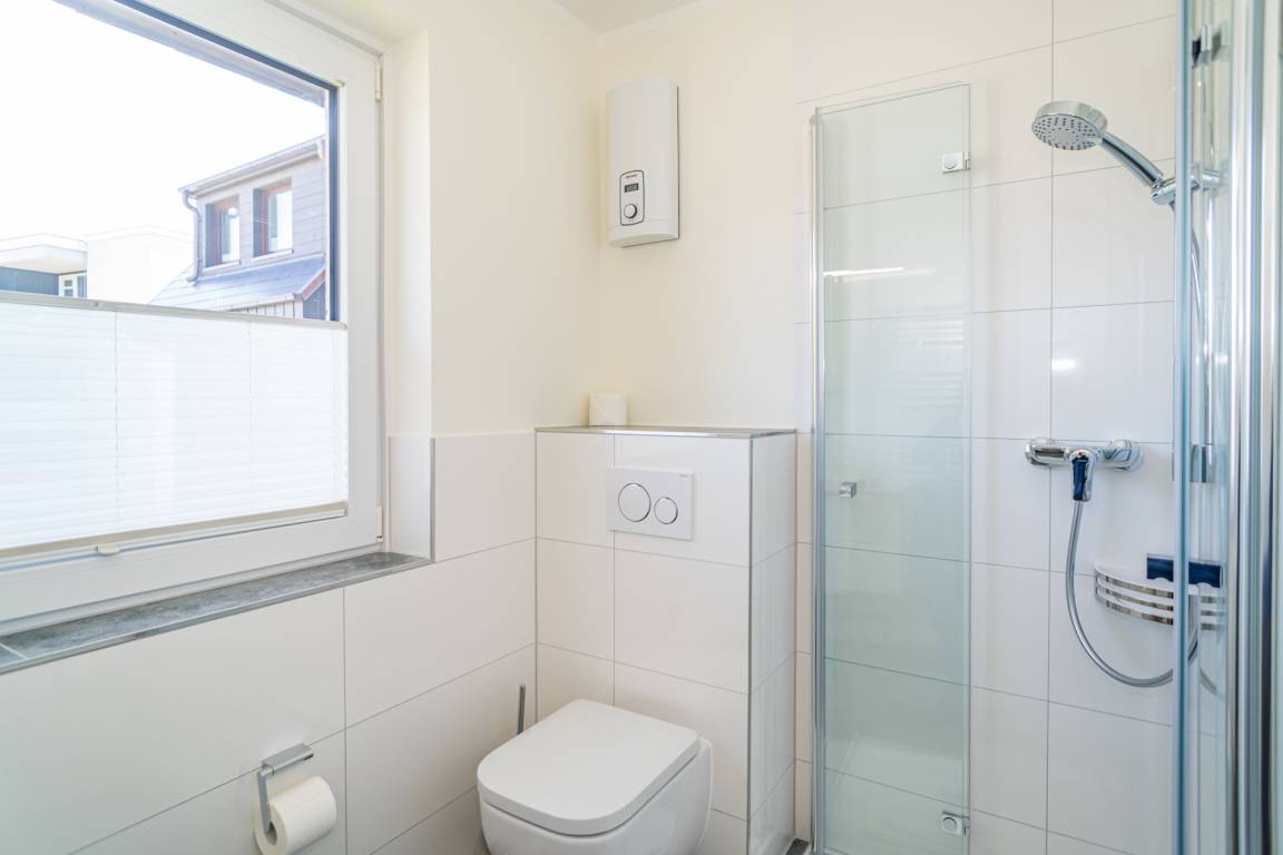 Das moderne Badezimmer mit Fenster verfügt über eine Dusche, ein WC, einen Waschtisch, einen Handtuchtrockner und einen Fön.