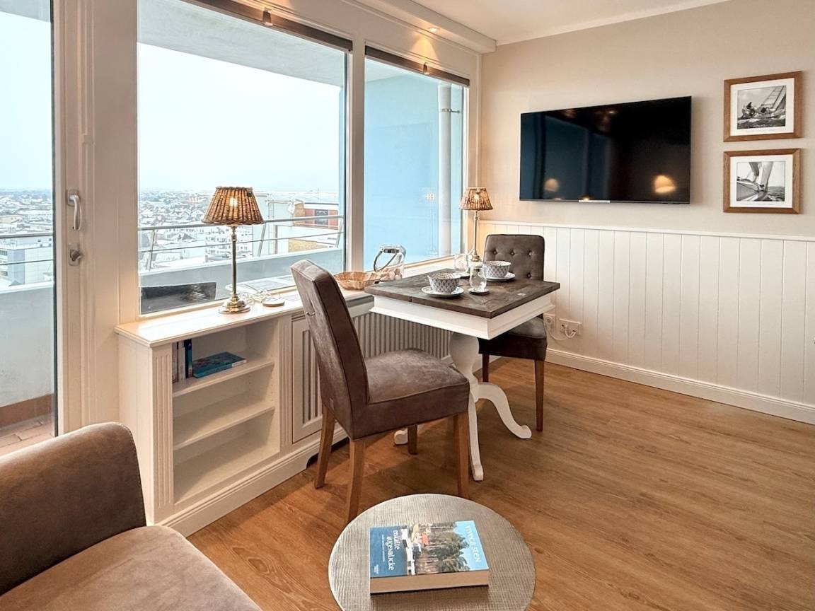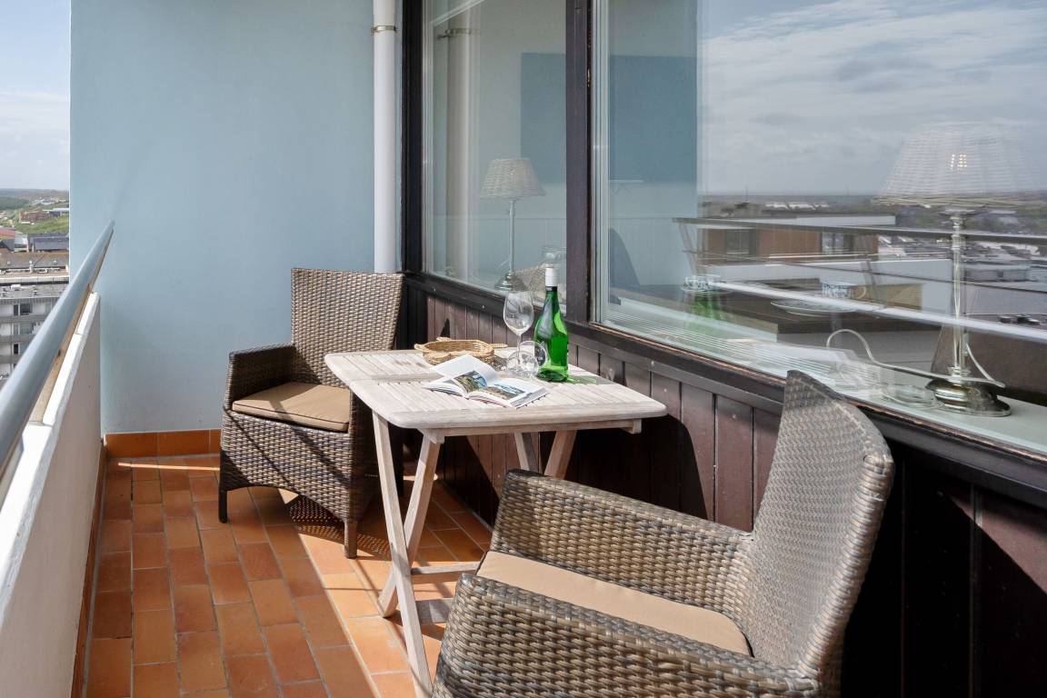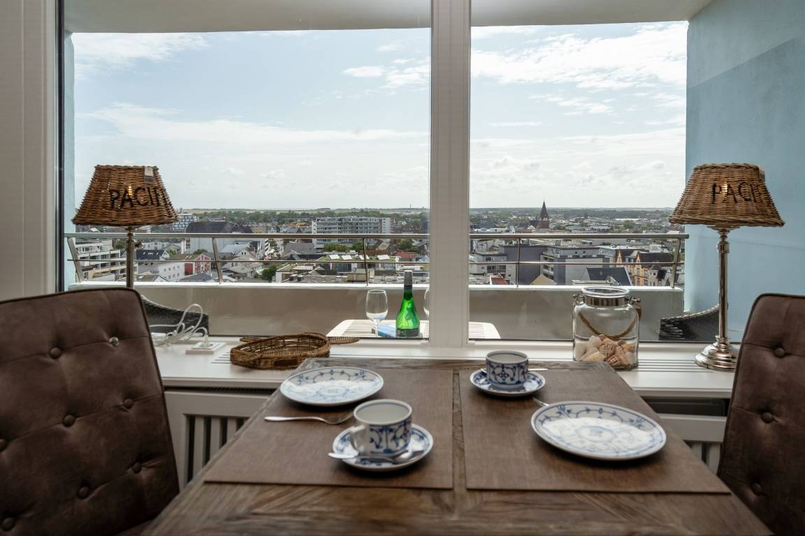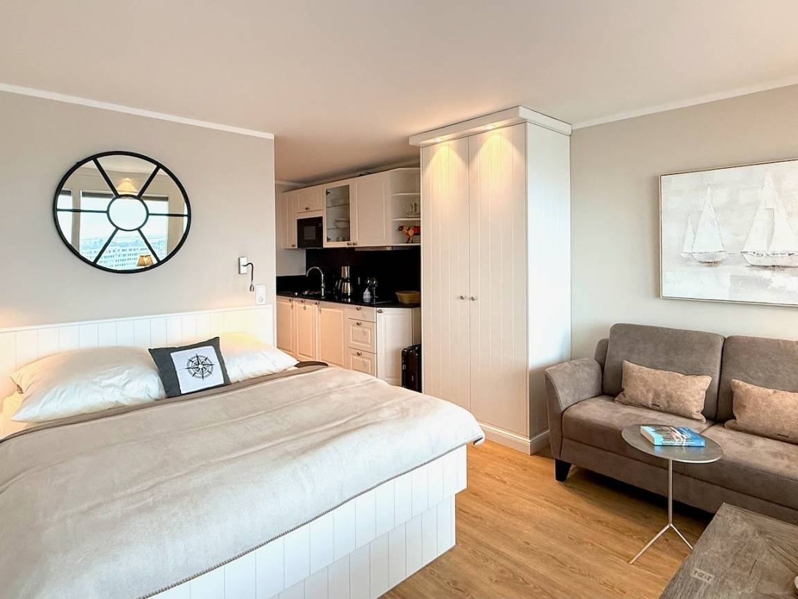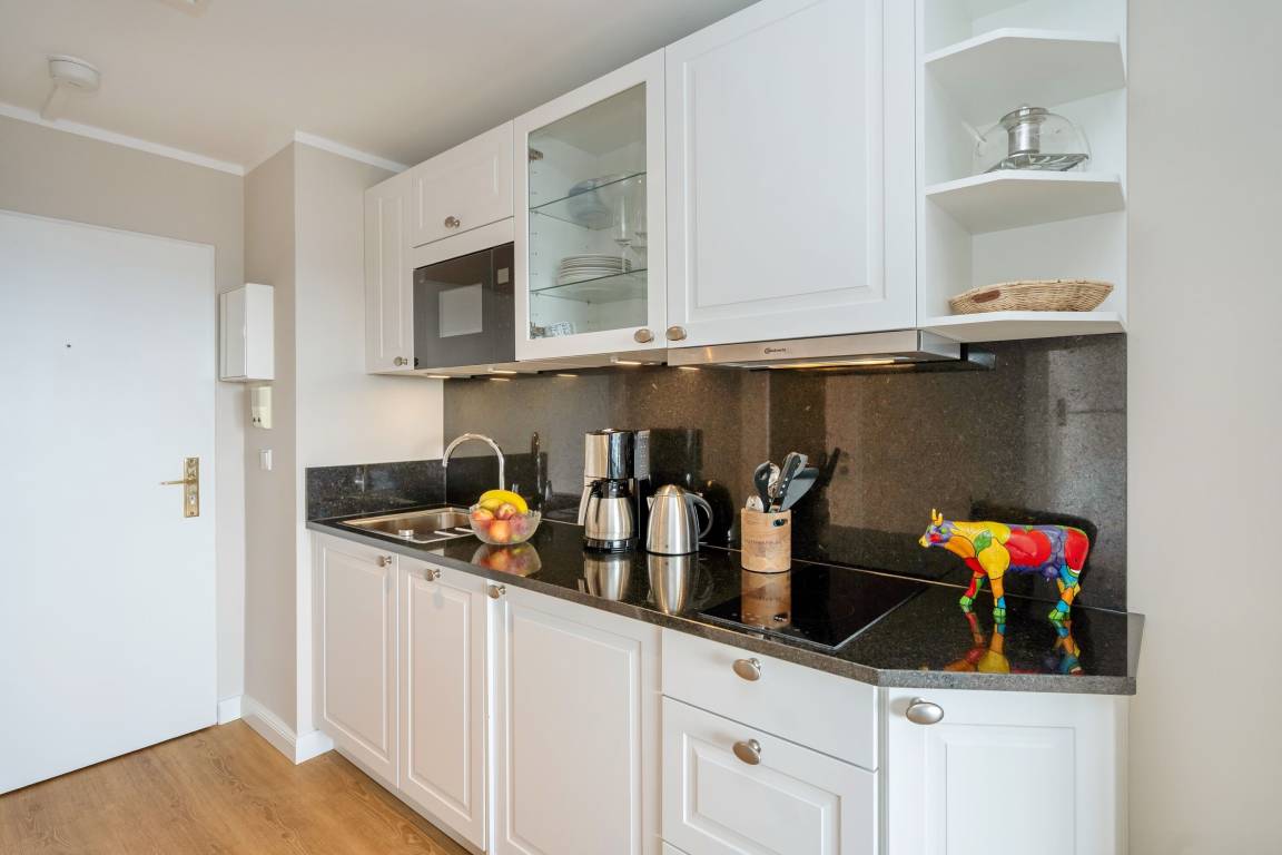 Die frisch renovierte 1-Zimmer-Wohnung ist ca. 30 m² groß und befindet sich im 9. OG[nbsp] des Haus "Metropol" zur Landseite. Sie besteht aus einem kombinierten Wohn- und Schlafzimer mit Doppelbett (160 x 200, 2 Matratzen), Kleiderschrank, 2-Sitzer-Sofa, Essplatz am Fenster, Flat-TV mit Radio, dazu 4 USB-Anschlüsse. Die moderne Küchenzeile mit Geschirrspüler, 2-Plattenherd, Mikrowelle und Kühlschrank mit Gefrierfach ist den Flur integriert. Das Badezimmer verfügt über ein große Dusche, WC sowie einen Waschtisch. Auf dem geschützten Ostbalkon lässt es sich hervorragend in der Sonne frühstücken und den herrlichen Blick über die Insel bis zum Rantum Becken genießen. Internet steht kostenfrei über die hausinterne Anlage zur Verfügung (ohne Gewähr) Tierhaltung und Rauchen sind in der Wohnung nicht gestattet. Ein PKW-Stellplatz kann kostenpflichtig zugebucht werden. Bettwäsche und Handtücher sind zur Anreise aufgezogen.