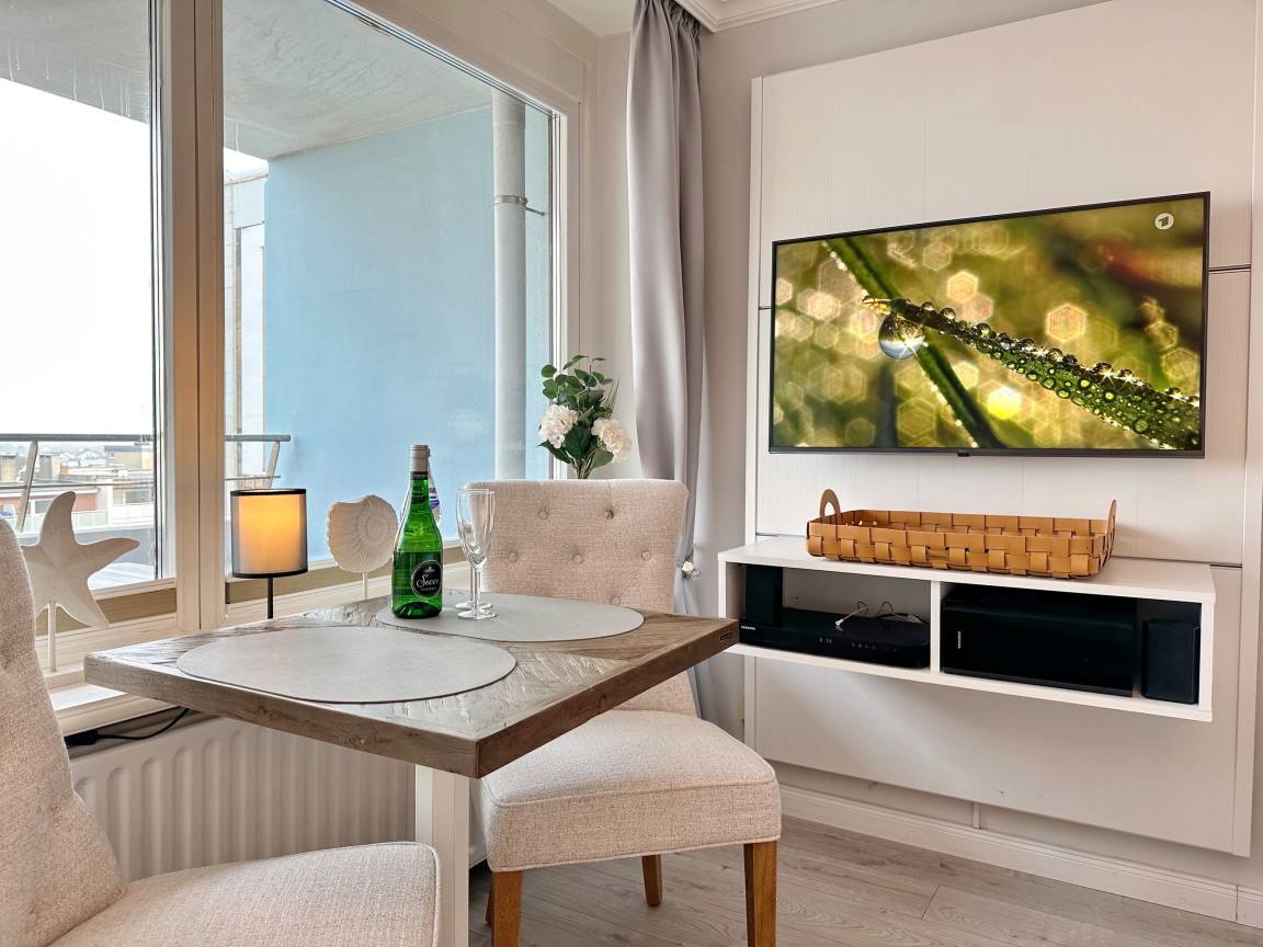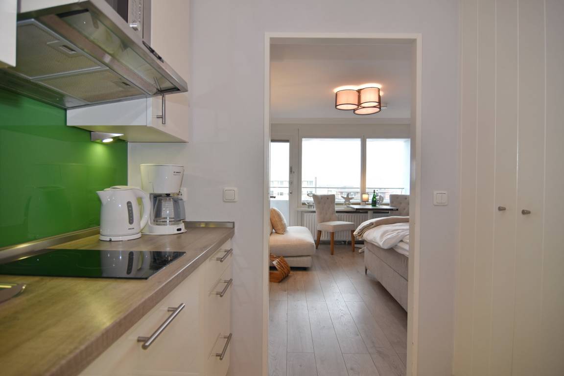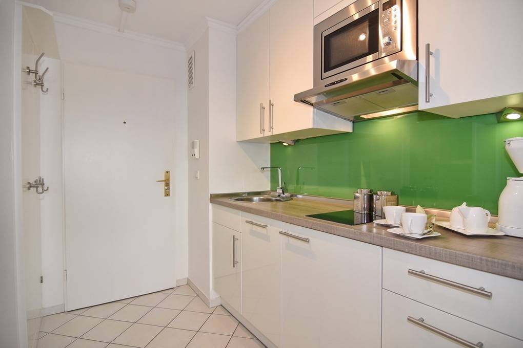 1-Zimmer-Apartment mit ca. 30qm im 4. OG des Hauses Metropol. Kombinierter Wohn-/Schlafraum mit Doppelbett (160x200), XXL-Sessel und Essplatz am Fenster. Smart-TV, hausinternes Internet. Im Flurbereich befindet sich die Küchenzeile mit 2er-Ceranfeld, Mikrowelle und Geschirrspüler. Der Kühlschrank verfügt über ein Gefrierfach. Garderobe und Putzschrank. Duschb/WC. Tierhaltung und Rauchen in der WOhnung verboten. Pkw-Stellplatz kann je nach Verfügbarket kostenpflichtig dazugebucht werden.