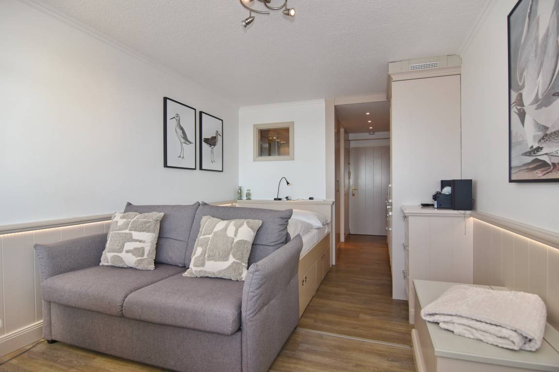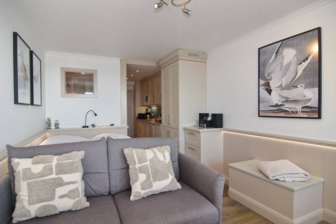 Exklusive 1-Zimmer-Ferienwohnung mit unverbauten Seeblick im 3. Obergeschoß des Haus "Metropol". Ca. 25m². Hübsches Wohn- und Schlafzimmer mit Doppelbett (1,40x2m). Essplatz für 2 Personen am Fenster (Achtung Stufe), Couch, Flachbild-TV, Stereoanlage mit CD. W-Lan (ohne Gewähr). Hübsche Küchenzeile mit Geschirrspüler, Mikrowelle und Cerankochfeld. Schickes Duschbad/WC. Nichtraucherwohnung. Tierhaltung ist nicht gestattet. Bettwäsche und Handtücher sind zur Anreise aufgezogen. Ein PKW-Stellplatz kann kostenpflichtig zugebucht werden.
