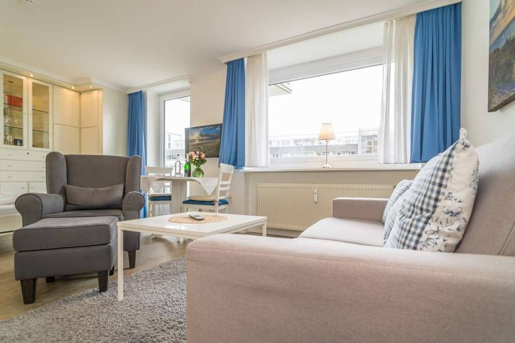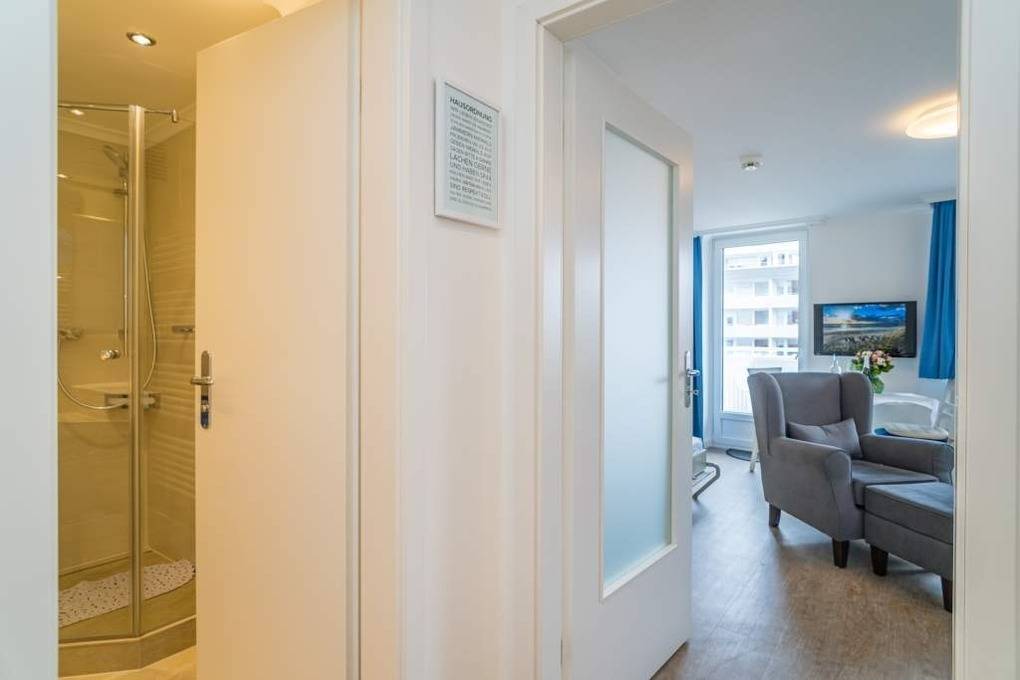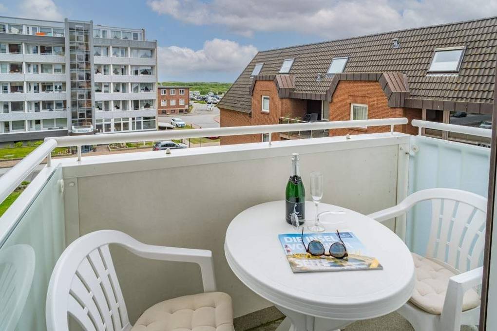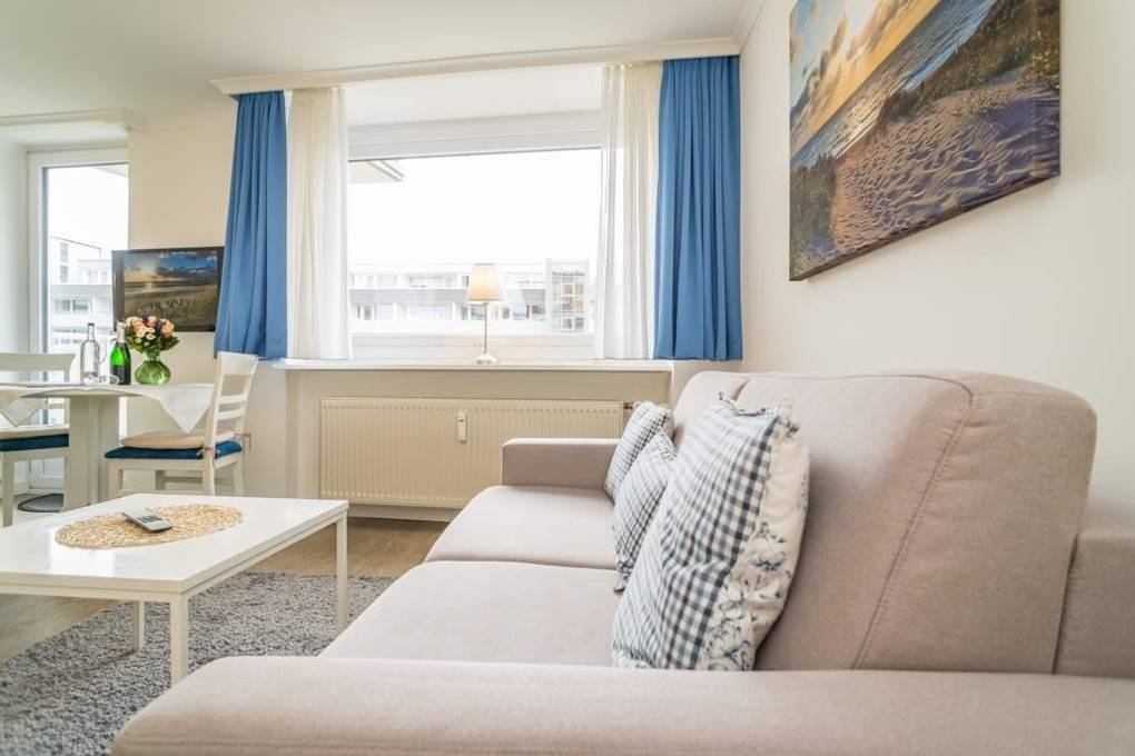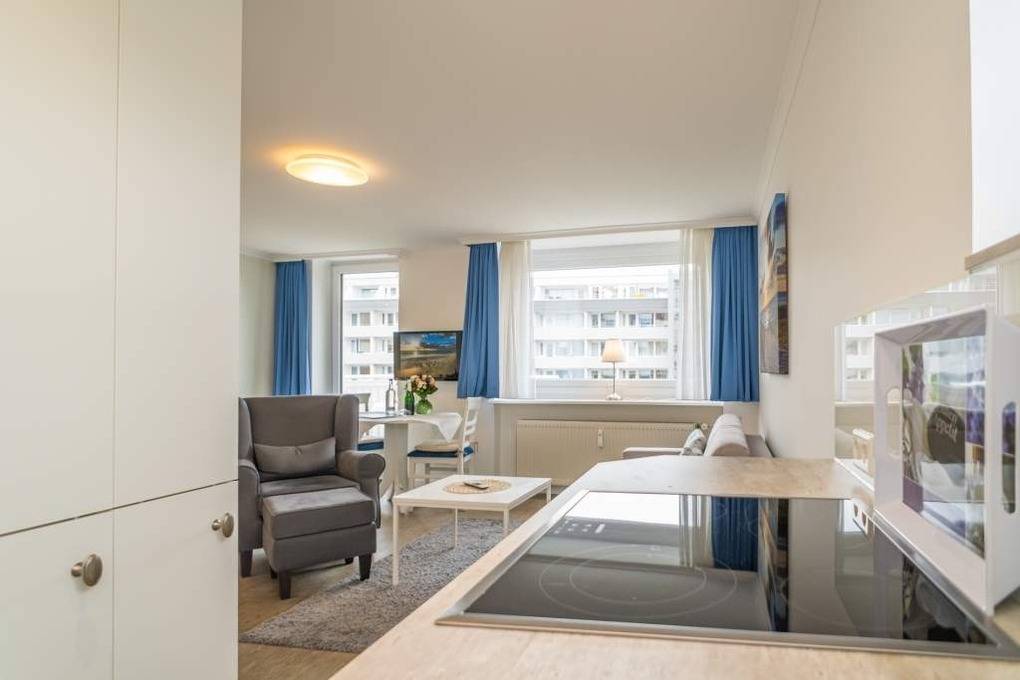 1-Zimmer-Nichtraucher-Ferienwohnung (ca. 32 qm) zur Westseite in der 3. Etage mit kleinem Meerblick und Westbalkon.