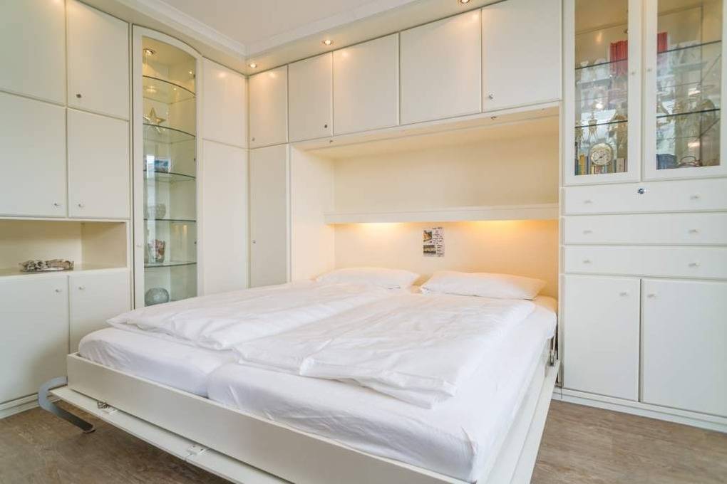 Das Wohn-/Schlafzimmer hat ein Doppelschrankbett (0,80 x 1,90 m), eine 2-Sitzer-Couch (bequeme 1,60 m Sitzfläche), einen Sessel, ein Kabel-Flachbild-TV.
