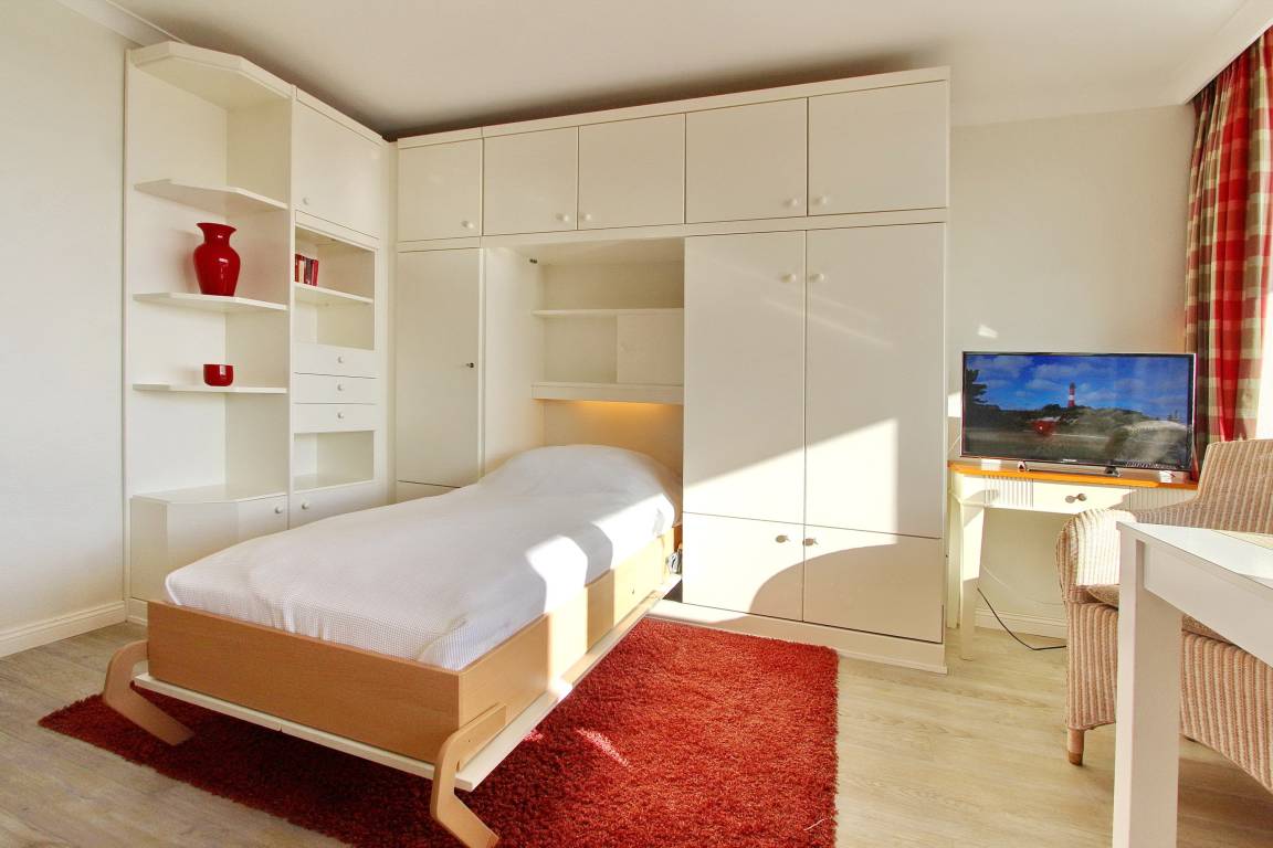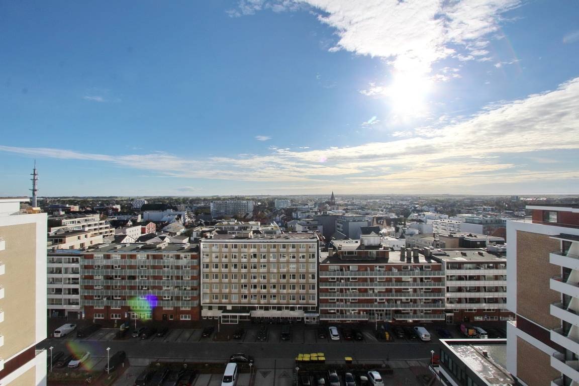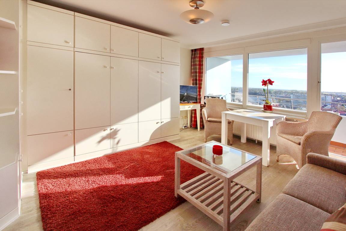 Schöne Einzimmerwohnung in der 9. Etage vom Haus Metropol mit einem traumhaften Weitblick über die Insel und die Stadt - bei klarem Wetter auf das nordfriesische Wattenmeer bis zum Festland. Der kombinierte Wohn-/Schlafraum mit vorgelagertem Ostbalkon verfügt über Einzelschrankbetten, einem Essplatz mit 2 Stühlen am Fenster und einer gemütlichen 2-Sitzer-Couch. Modernes Duschbad/WC. Die Einbauküche mit Flur ist mit einem Backofen, einem Cerankochfeld mit 4 Platten und einem Kühlschrank ausgestattet. Zur technischen Ausstattung gehört ein Flachbild-TV und ein Radio. Nichtraucherwohnung. Haustiere nicht gestattet. Ein freies WLAN Netz (WEG Haus Metropol - Passwortfrei - ohne Gewähr) steht Ihnen kostenfrei zur Verfügung. Wohnungsgröße ca. 30 m².