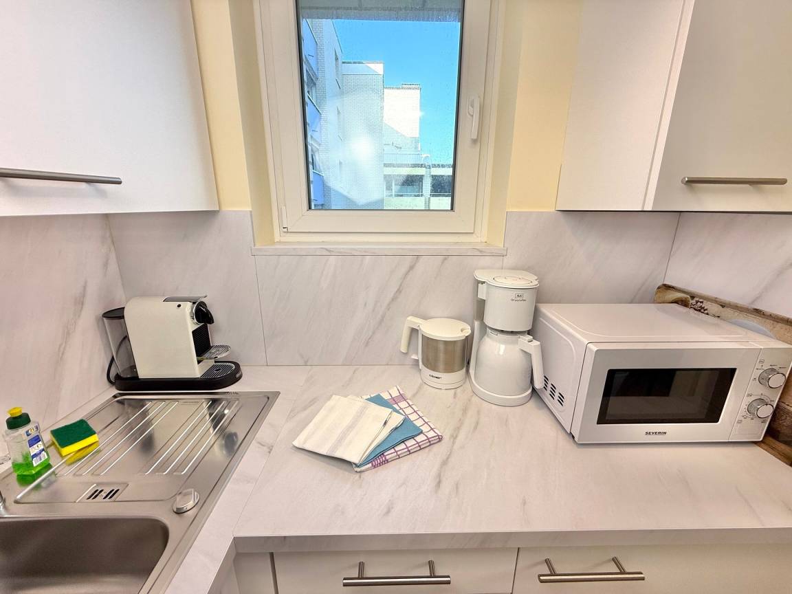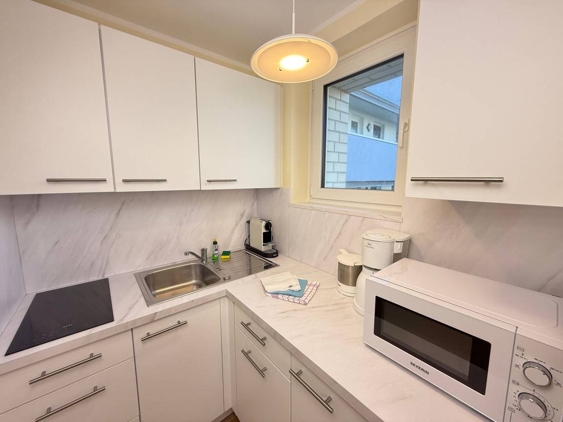 Die offene Einbauküche schließt an den Wohnbereich an und ist mit Mikrowelle und mit Ceranfeld (2 Kochfelder) ausgestattet. Kaffeemaschine, Wasserkocher und Toaster gehören zur Grundausstattung.