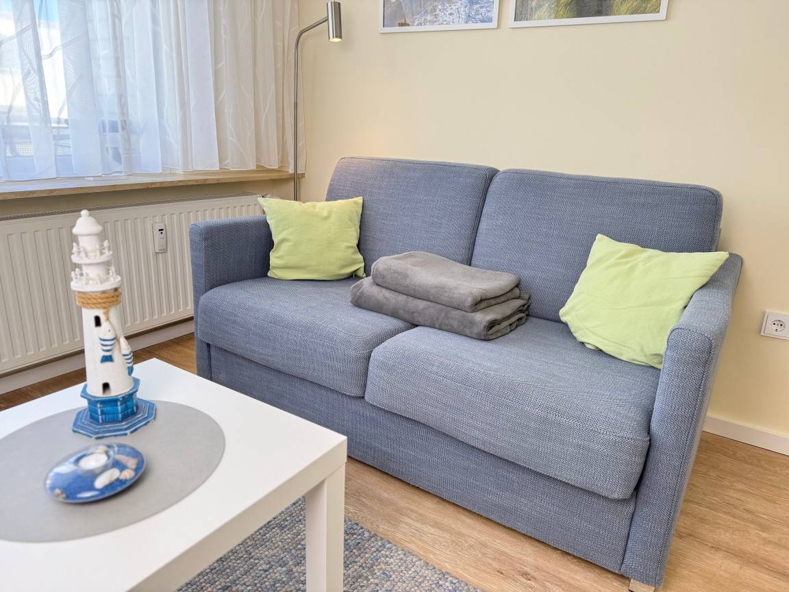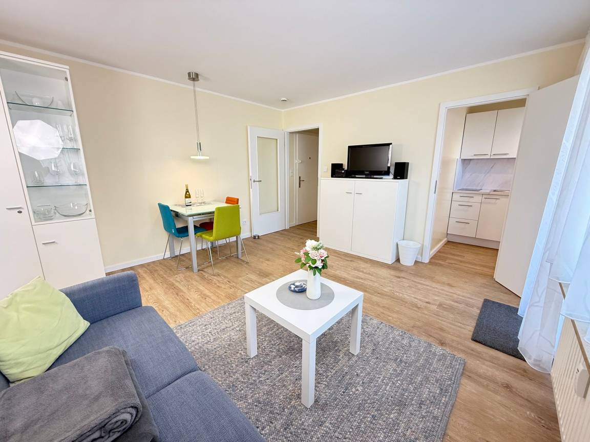 Vom kleinen Vorflur mit Garderoben-Schrank gelangen Sie direkt in das Wohnzimmer sowie in das Badezimmer mit WC. Das Wohnzimmer ist mit einem gemütlichen Sofa (mit Schlaffunktion, Liegefläche ca. 1,40 x 2,00 m), einem Essplatz und Flachbild-TV und Mikro-Soundsystem ausgestattet.