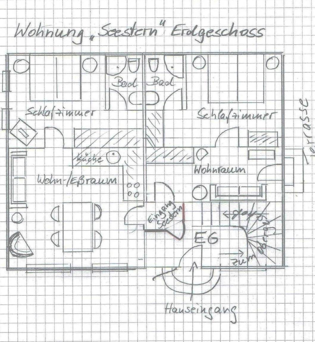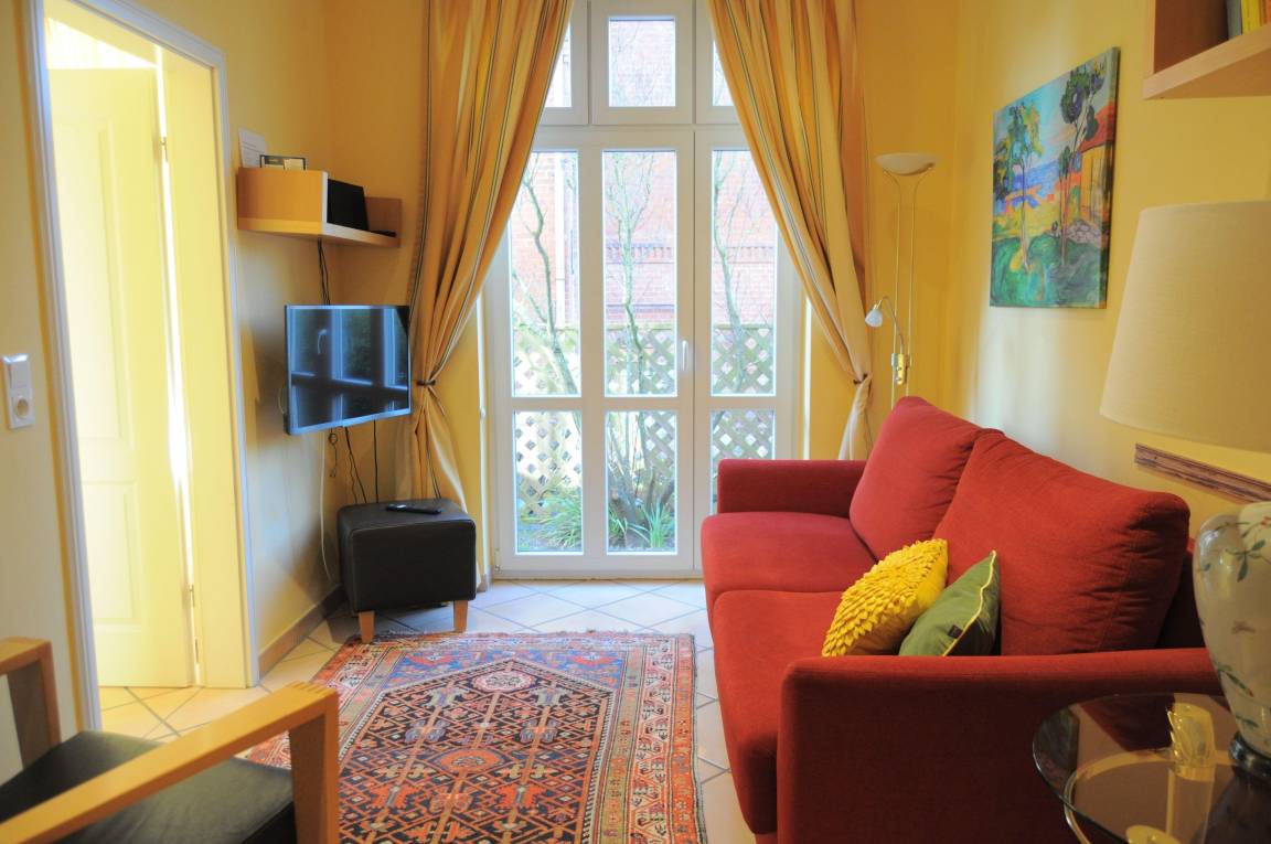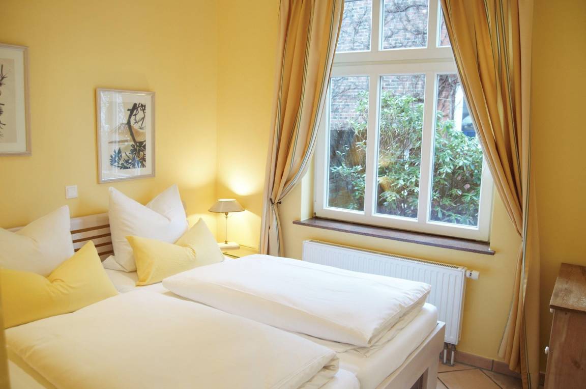 Das Appartement Seestern verfügt über ein Wohn-/Eßzimmer mit Küchenzeile, 2 Schlafzimmer mit Doppelbetten (separate Matratzen jeweils 90x200cm) 2 Duschbäder sowie einem kleineren, gemütlichen Wohnraum mit Schlafcouch und Ausgang zur Terrasse. Durch die im Altbau üblichen hohen Decken sowie die hochwertige Möblierung in hellen, kräftigen Farben mit klaren, modernen Formen ist der großzügige und wohnliche Charakter des Appartements entstanden.