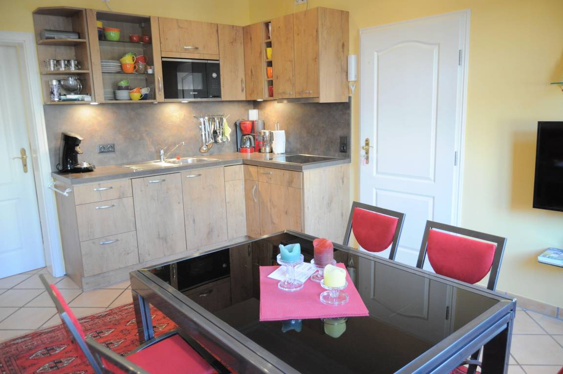 Die Küchenzeile verfügt über Geschirrspüler, Mikrowelle, 4er Cerankochfeld, Backofen + Dunstabzugshaube, Kühlschrank, Kaffeefiltermaschine, Senseo-Kaffeeautomat und was sonst noch so alles benötigt wird.