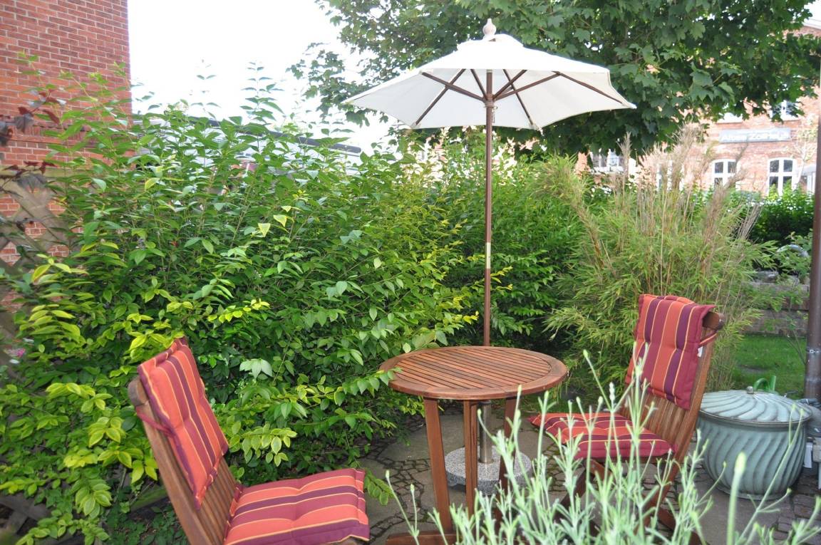 Parkplätze auf eigenem Grundstück kostenfrei und Fahrradständer ebenfalls. Im Vorgarten mit Brunnen und Strandkörben können Sie beim Glas Wein entspannen oder gemütlich eine Zigarette rauchen und die Abendsonne genießen.