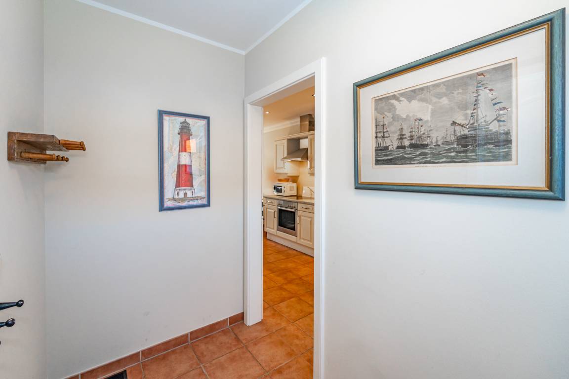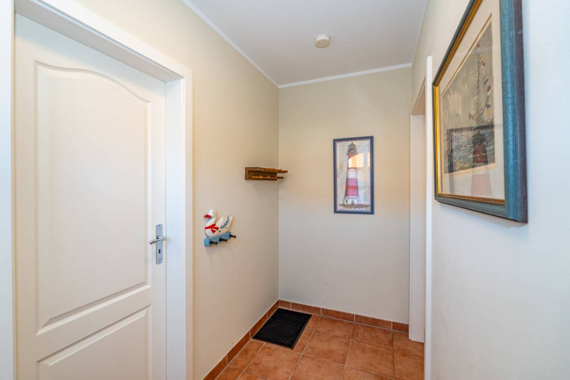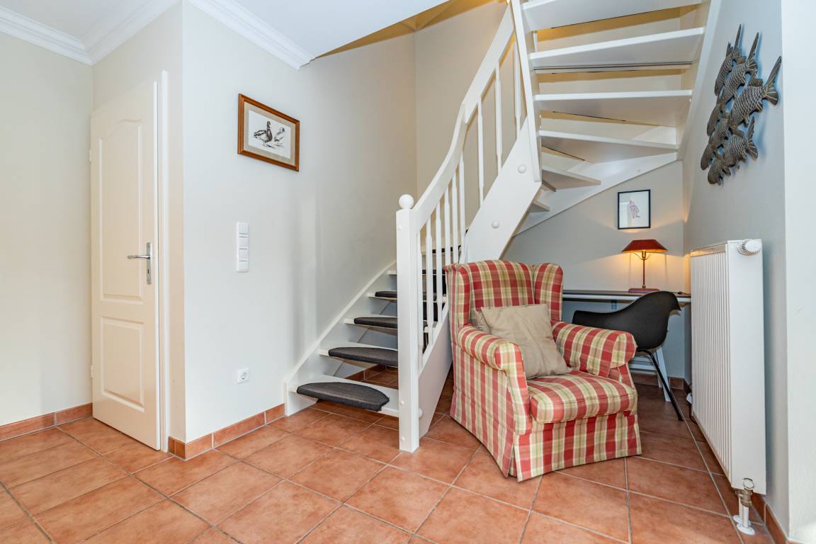Im Erdgeschoss gelangt man von der Diele in das exklusive Wohnzimmer mit offener Einbauküche, das Duschbad/WC und in den Hauswirtschaftsraum mit Waschmaschine und Trockner.