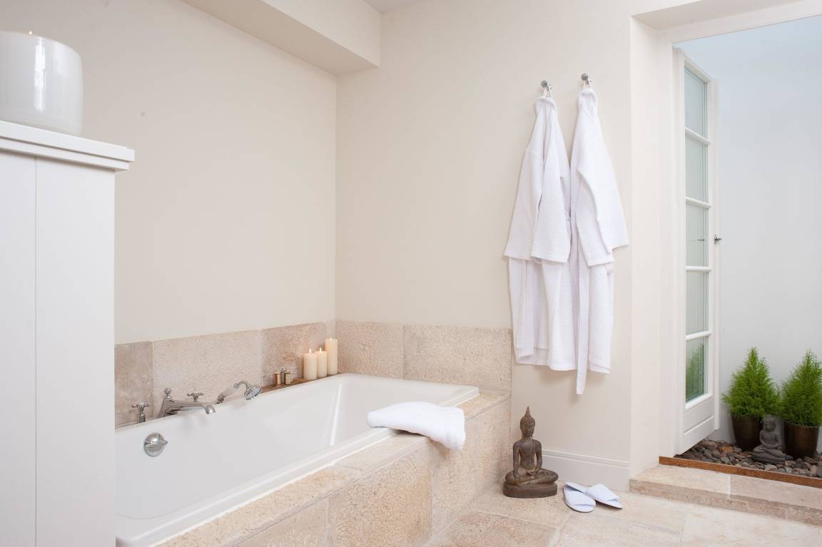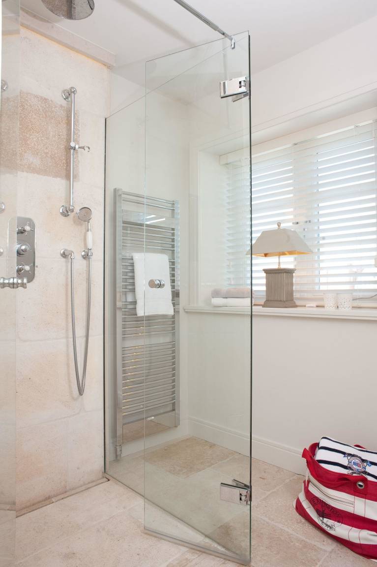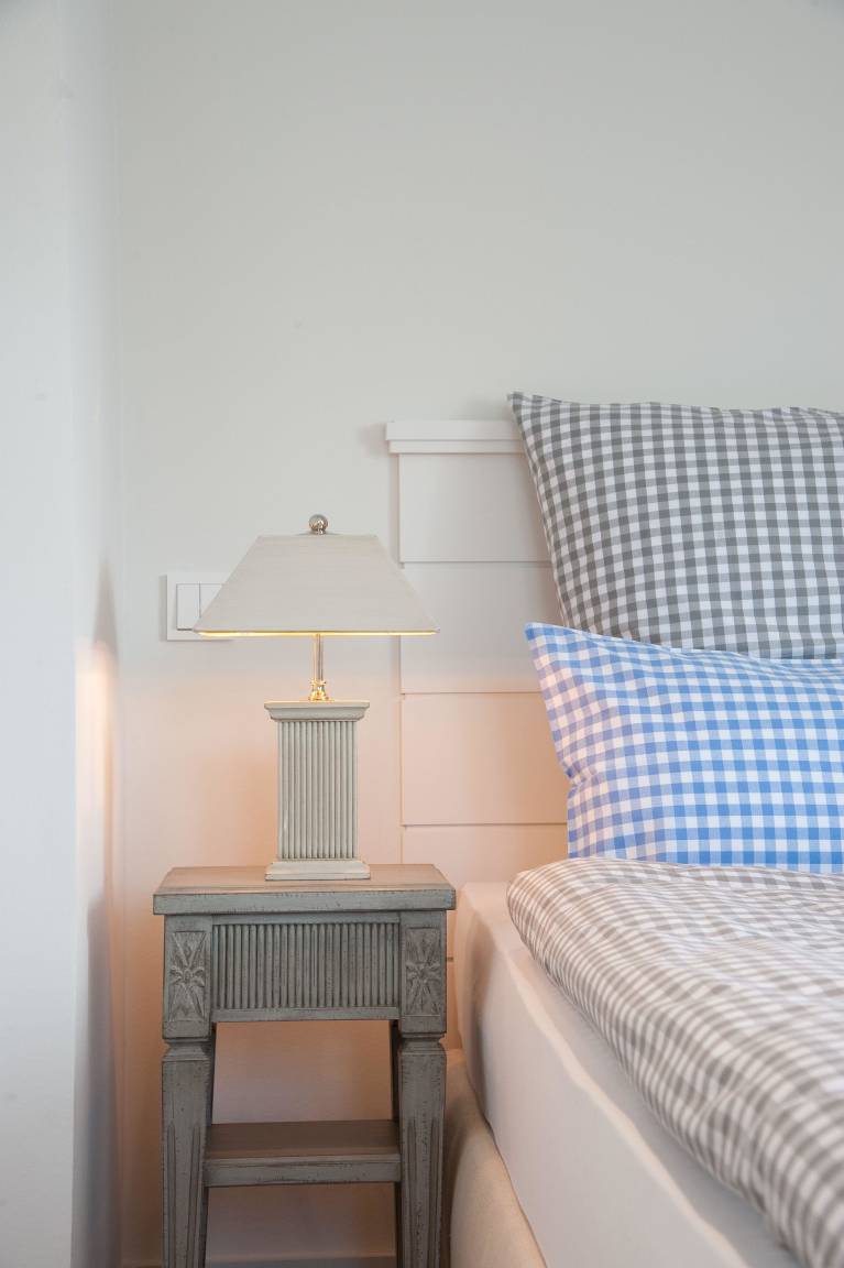 Die Ferienwohnung, die sich im westlichen Hausteil befindet, bietet eine stilvolle Einrichtung im hellen Design von Mylin Interieurs. Hochwertige Materialien wie beispielsweise Altholzfußboden und französischer Limestone, helle Raumfarben sowie geradlinige Tischlereinbauten sorgen für eine entspannte Atmosphäre.