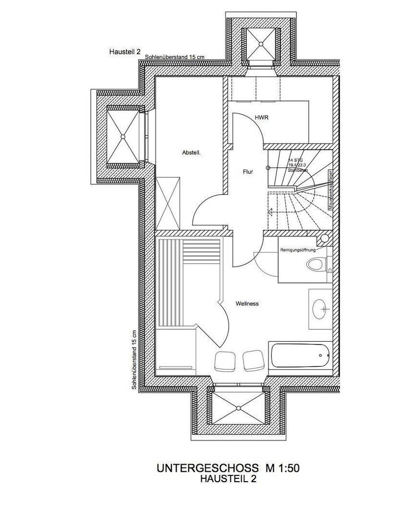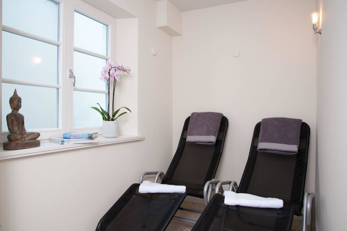 Im Untergeschoss finden Sie den privaten Wellnessbereich mit Sauna, Regendusche, Badewanne sowie einen separaten Ruheraum mit TV. Außerdem steht Ihnen hier ein Hauswirtschaftsraum ist mit Waschmaschine, Trockner und Bügelbrett zur Verfügung.