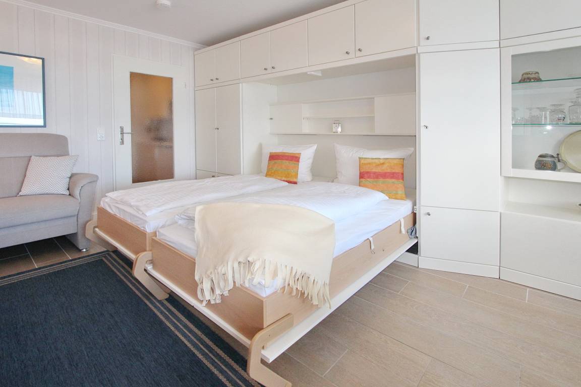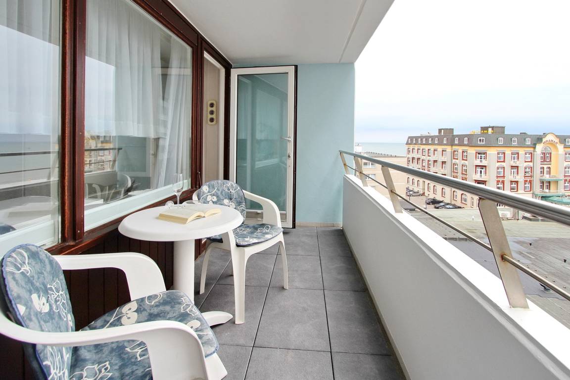 Einzimmerwohnung der 4. Etage im Haus am Meer mit Blick auf die Nordsee. Der kombinierte Wohn-/Schlafraum mit vorgelagertem Westbalkon (Balkonmöbel und Auflagen sind vorhanden), verfügt über Einzelschrankbetten (mit Besucherritze), einen Essplatz am Fenster mit 2 Stühlen und einer Sitzgruppe mit Sofa und Relaxsessel. Das Badezimmer hat einen Handtuchtrockner, Fön und eine Dusche mit einem flachen Einstieg. In der Küchenzeile mit Backofen und Ceranfeld können sie kleine Mahlzeiten zubereiten. Zur technischen Ausstattung gehört: ein Flachbildfernseher und ein Nostalgieradio. Ein kostenfreier Zugang zum WLAN Hot Spot (WEG Haus am Meer - Passwortfrei - ohne Gewähr) kann genutzt werden. Wohnungsgröße: ca. 34 m².