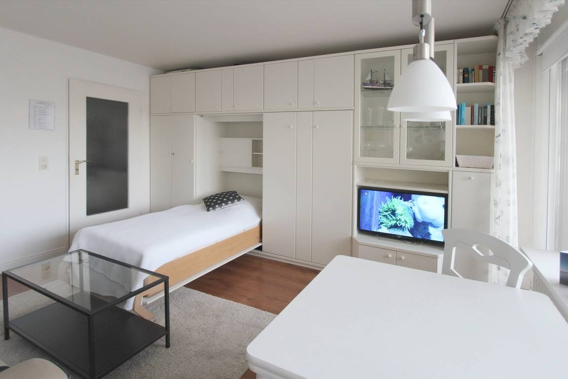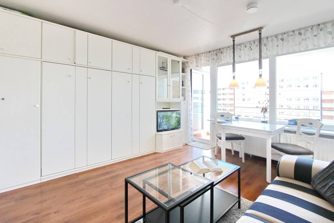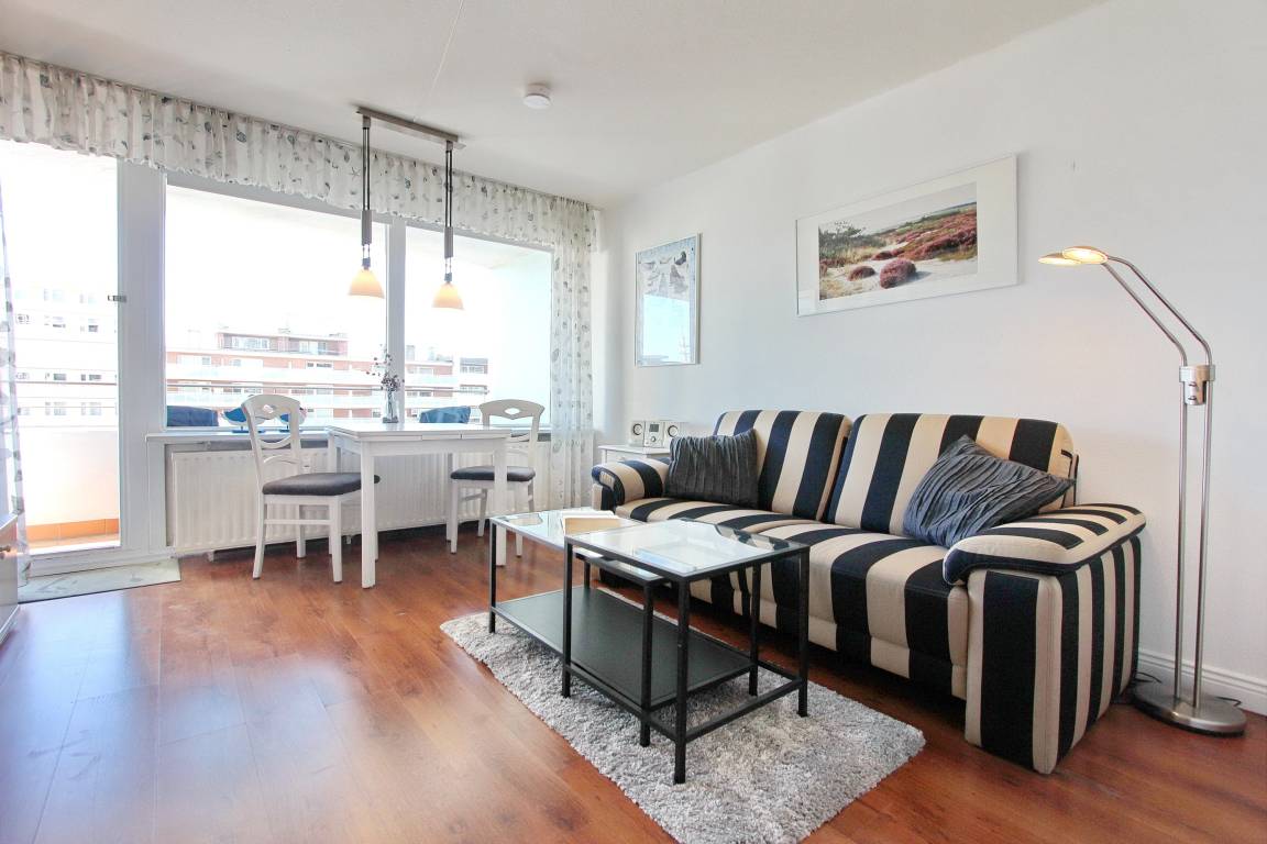 Diese hell und freundlich eingerichtete Nichtraucherwohnung befindet sich in der 1. Etage des Haus Metropol. Der kombinierte Wohn-/Schlafraum hat einen Ostbalkon mit Balkonmöbeln und Sitzauflagen. Sie können hier schon in den Morgenstunden die Sonne genießen. Das Appartement ist mit Einzelschrankbetten, einem Essplatz mit 2 Stühlen und einer Couch ausgestattet. Der Laminatfußboden verleiht dem Raum Wärme und Gemütlichkeit und macht die Wohnung auch für Allergiker geeignet. Das helle Badezimmer hat eine Dusche mit flachem Einstieg. In der Einbauküche mit Geschirrspüler und Mikrowelle können sie bequem kleine Mahlzeiten zubereiten. Zur technischen Ausstattung der Wohnung gehört: ein Flachbildfernseher von Sony, ein Radio mit CD Player sowie ein freier Zugang zum WLAN Netzwerk des Hauses (WEG Haus Metropol - Passwortfrei - ohne Gewähr). Wohnungsgröße: ca.30 m².