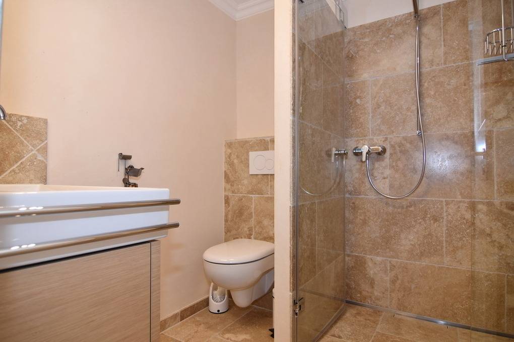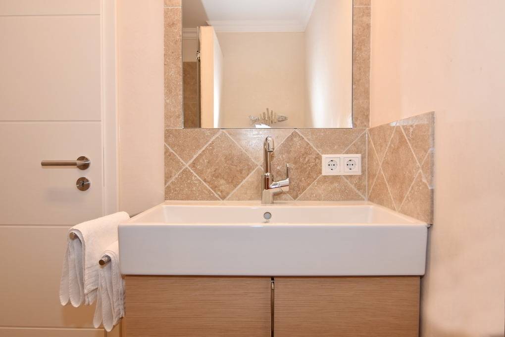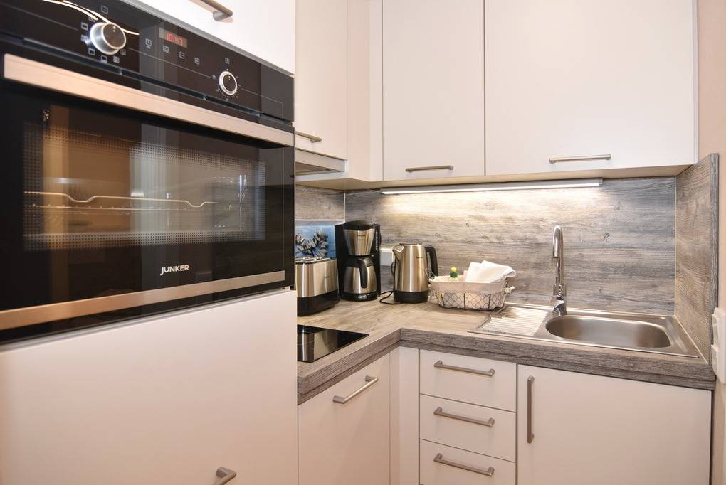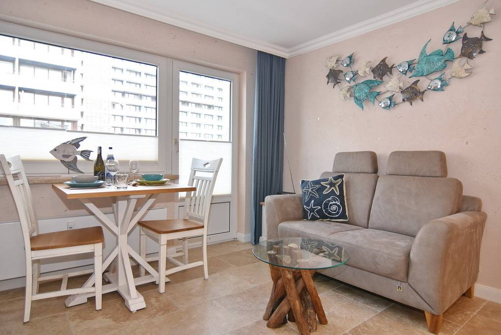 Schönes 1-Zimmer-Apartment mit moderner Einbauküche mit Geschirrspüler, Backofen und Ceranfeld. Im Wohnbereich lädt ein gemütliches Sofa sowie ein Boxspringbett (160x200) zum Relaxen und Träumen ein. Einbauschrank, Esstisch, Flat-TV, Verdunkelungsvorhänge und Sichtschutzplissees runden die liebevolle Einrichtung des Appartements ab. Das neue, moderne Badezimmer verfügt über eine Dusche, Waschtisch, WC sowie einen Handtuchheizkörper. Die Böden des Apartments sind mit Naturstein gefliest und die Wände haben einen hochwertigen Antikputz. An schönen Tagen können Sie den Tag und den Abend auf dem großzügigen, möblierten Westbalkon mit einem kleinen Ausblick auch aufs Meer genießen. Im Haus befindet sich eine kostenpflichtige Waschküche. Bettwäsche und Handtücher sind zur Anreise aufgezogen. Ein PKW-Stellplatz kann kostenpflichtig zugebucht werden. Tierhaltung und Rauchen sind nicht gestattet.