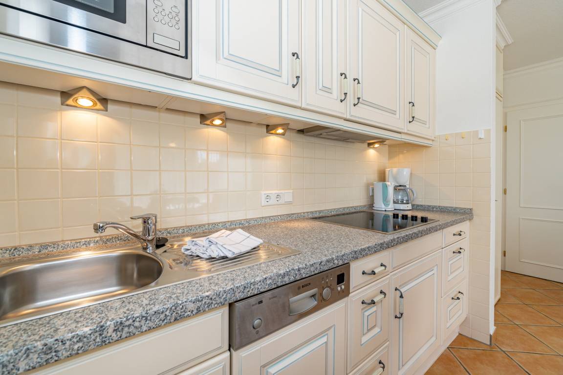 Die Küchenzeile hat einen Geschirrspüler, eine Mikrowelle, ein Ceranfeld und einen Kühlschrank mit 3*-Gefrierfach. Kaffeemaschine, Wasserkocher und Toaster gehören zur Grundausstattung.