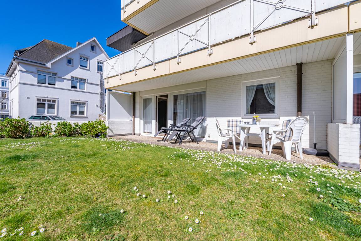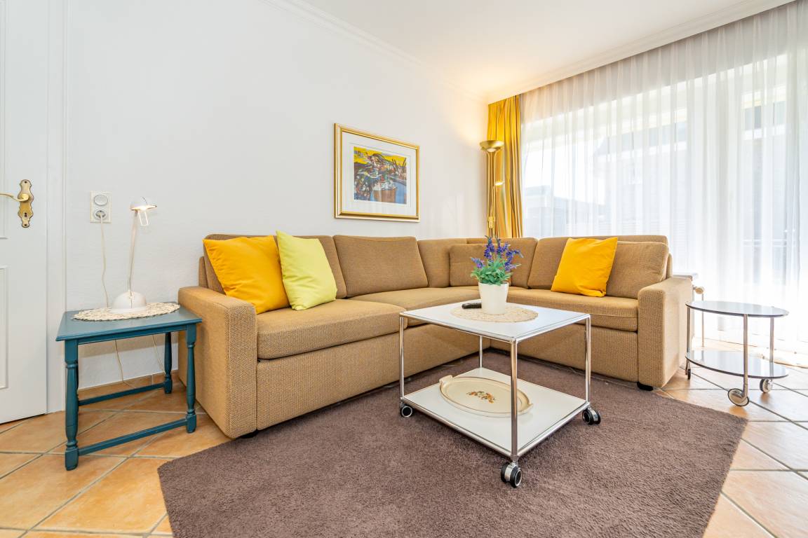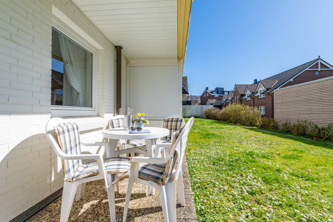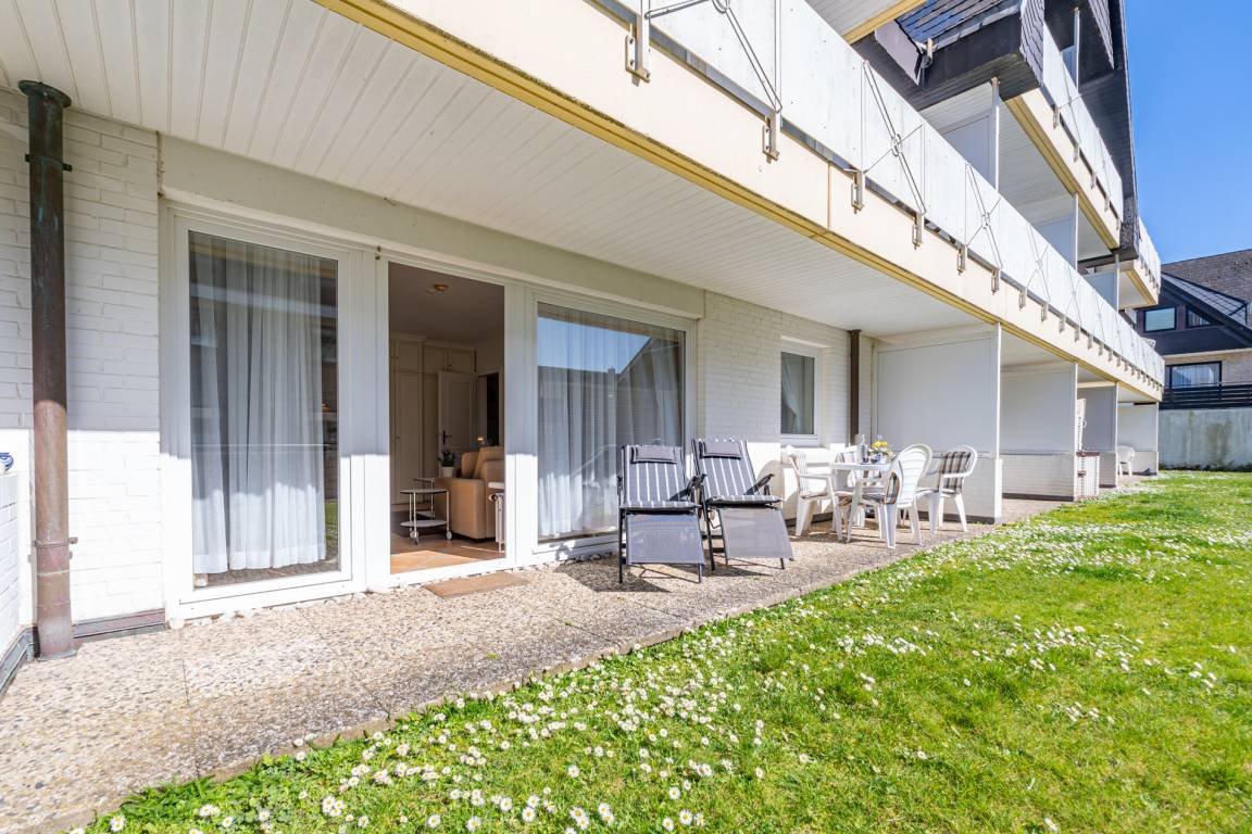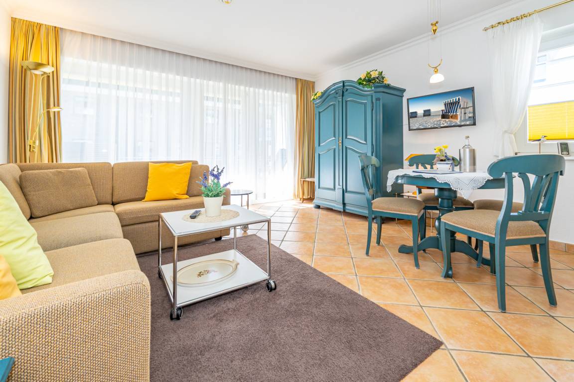 Gemütliche 2-Zimmer-Nichtraucher-Ferienwohnung ca. 50 qm im Parterre zur Südseite mit Südterrasse (mit Balkonmöbeln und Auflagen) für max. 3 Personen.