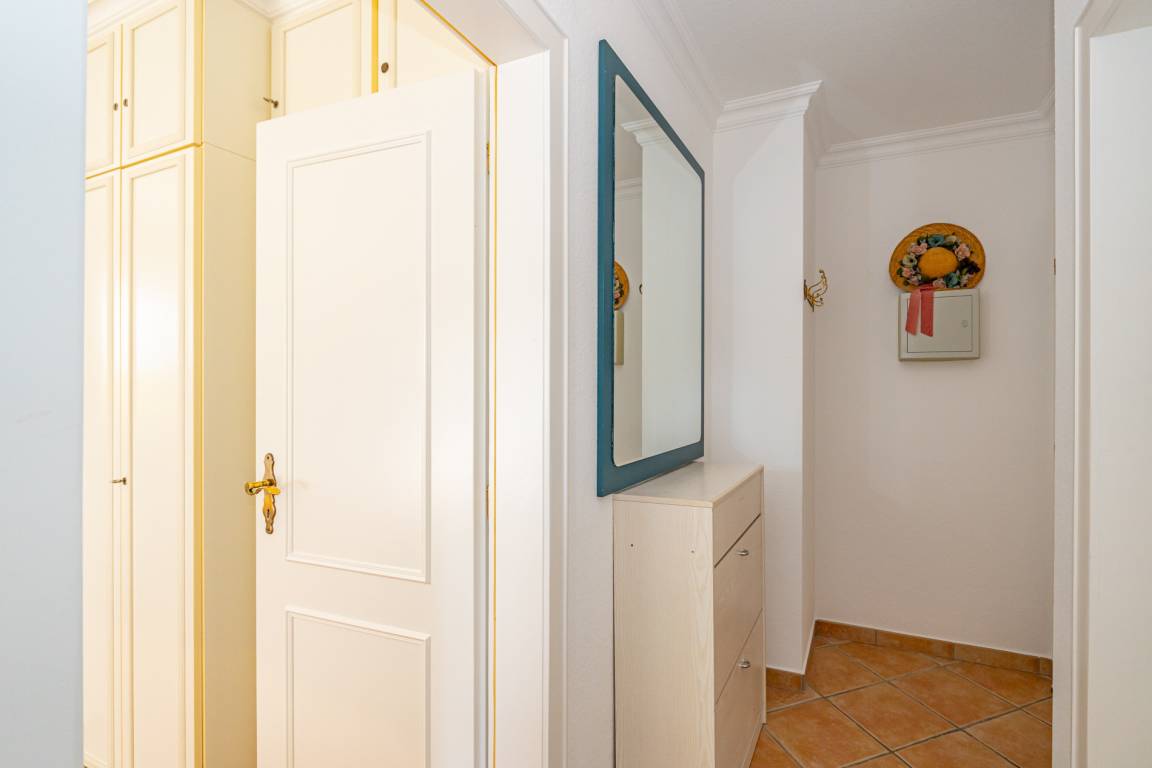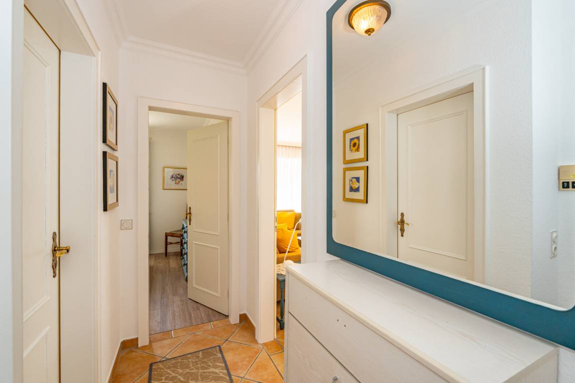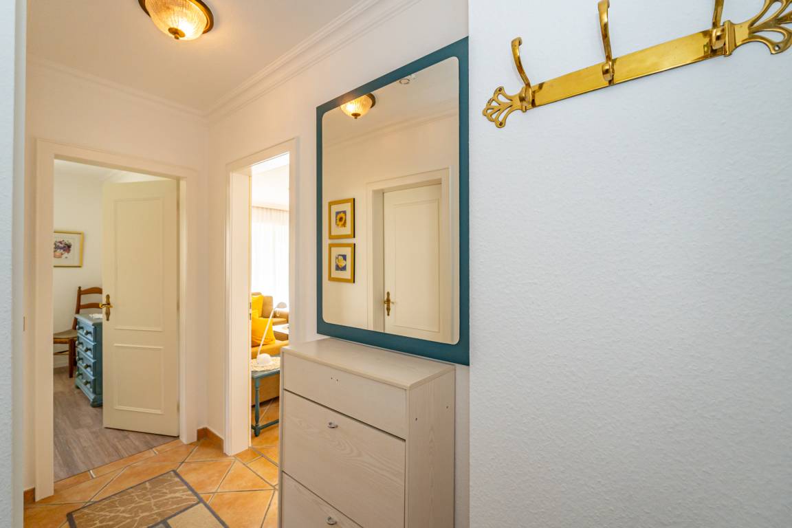 Vom Vorflur mit Garderobe gelangt man in das Wohnzimmer (mit Austritt zum Balkon), das Schlafzimmer und das Duschbad/WC.