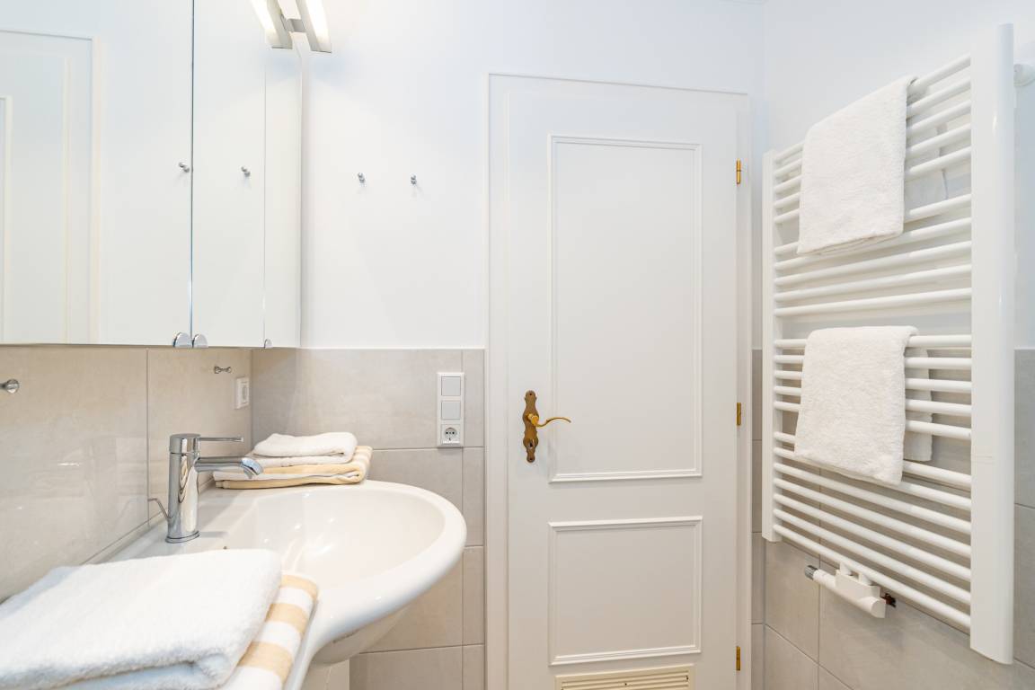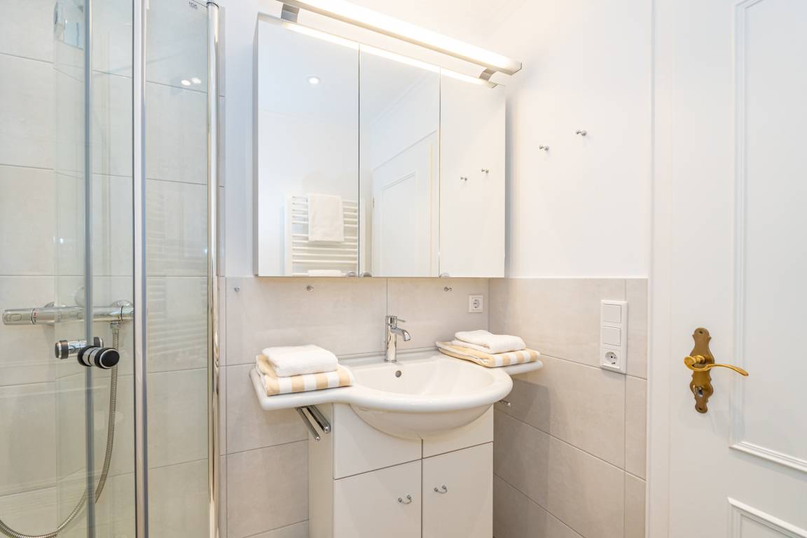 Das Badezimmer ist mit einer Dusche, einem Waschtisch und einem WC ausgestattet.