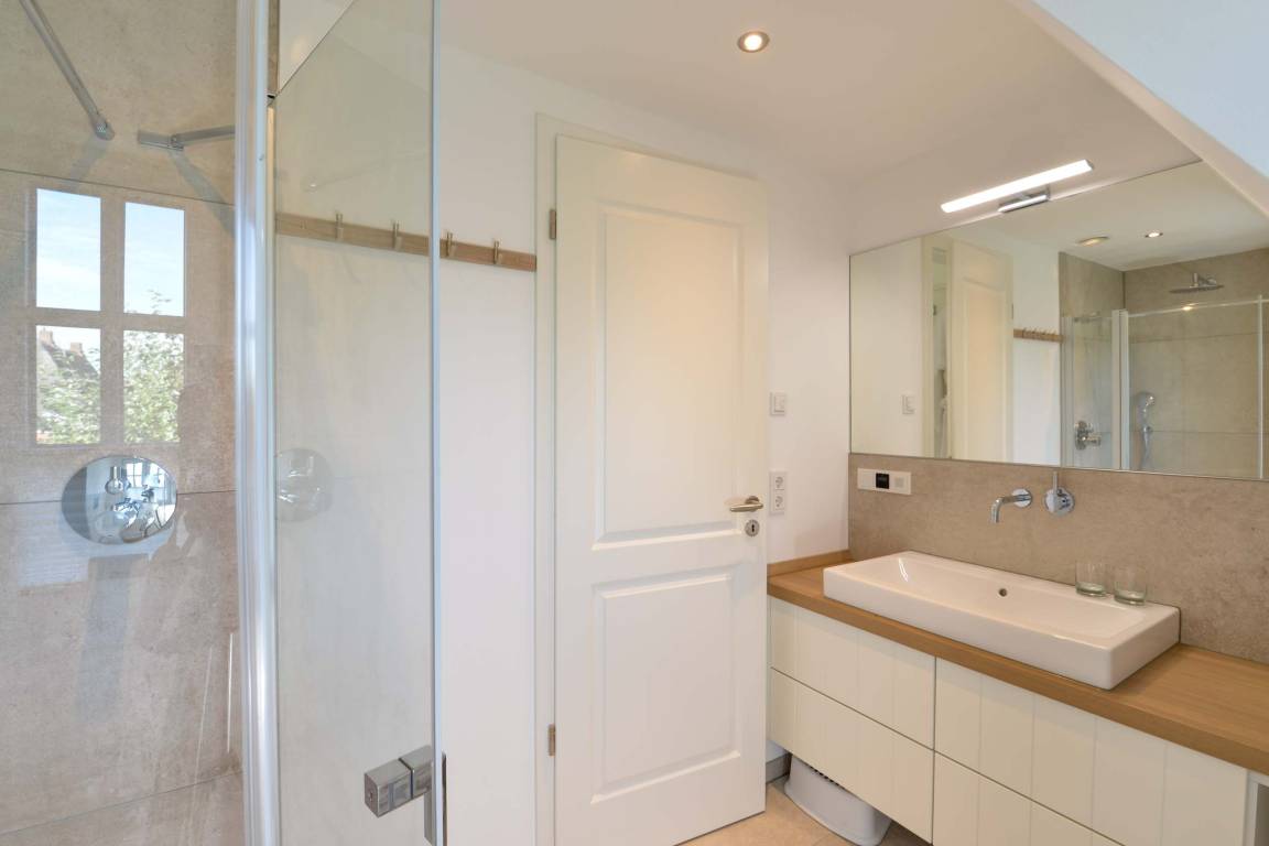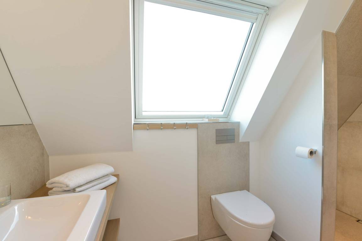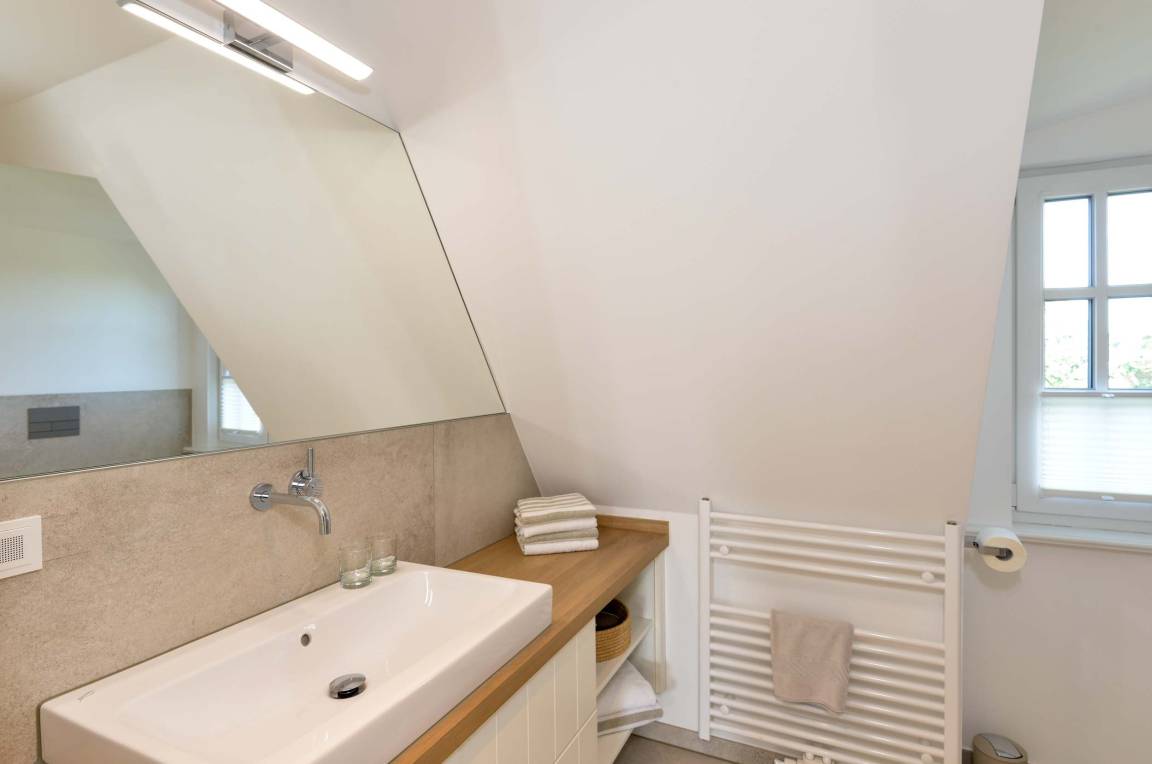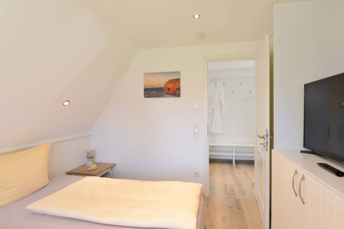 Im Spitzboden gibt es ein weiteres Schlafzimmer mit zwei Einzel-Boxspringbetten, die auf Wunsch zusammengestellt werden können. Auch hier gibt es ein Duschbad sowie eine Sauna.