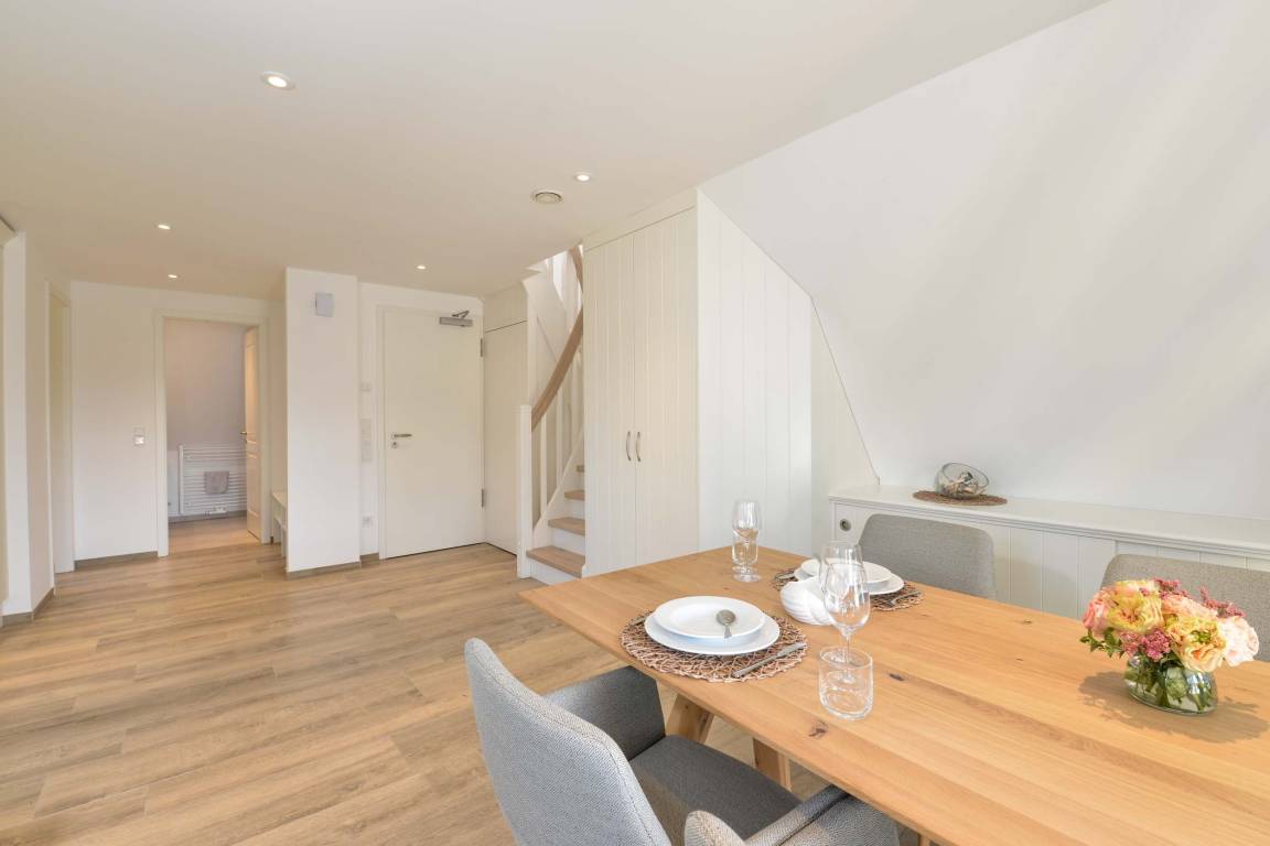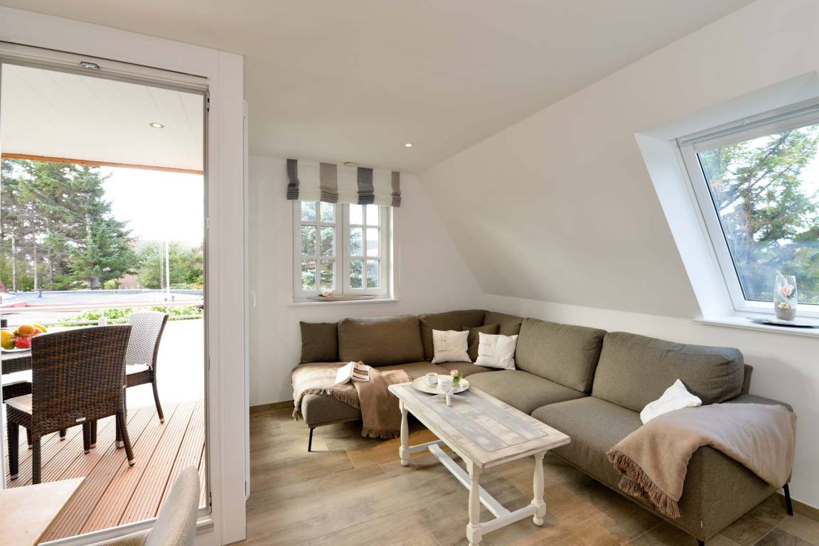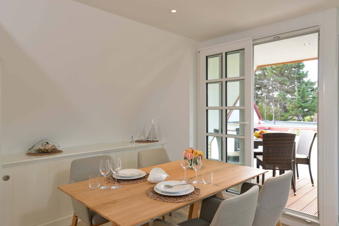 Im ersten Obergeschoss befindet sich ein Schlafzimmer mit einem komfortablen Boxspringdoppelbett und Morgensonne. Zudem gibt es ein Duschbad und einen hellen Wohnbereich mit integrierter Küche und Zugang zum überdachten und windgeschützten Südbalkon.
