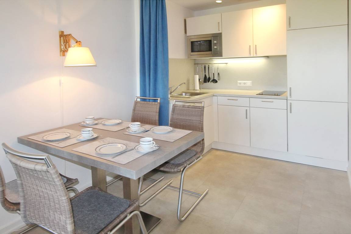Hell und freundlich eingerichtete Zweizimmerwohnung in der 1. Etage im Haus Eydum mit Balkon zur Westseite. Das Wohnzimmer verfügt über eine Ledercouch und einen Sessel mit Fußhocker, einen Essplatz mit 4 Stühlen , eine Schrankwand mit viel Stauraum und zwei Einzelschrankbetten. Im Schlafzimmer gibt es ein Boxspringbett. In der offenen Küchenzeile mit Mikrowelle und Geschirrspüle können sie sich selbst verpflegen. Das Badezimmer hat eine Dusche. Zur technischen Ausstattung dieser Wohnung gehört: ein Flachbildfernseher, ein Radio mit CD Spieler, sowie ein kostenfreier WLAN Internetzugang (Passwort steht auf der Rückseite des Routers). Nichtraucherwohnung. Wohnungsgröße ca. 45 m².