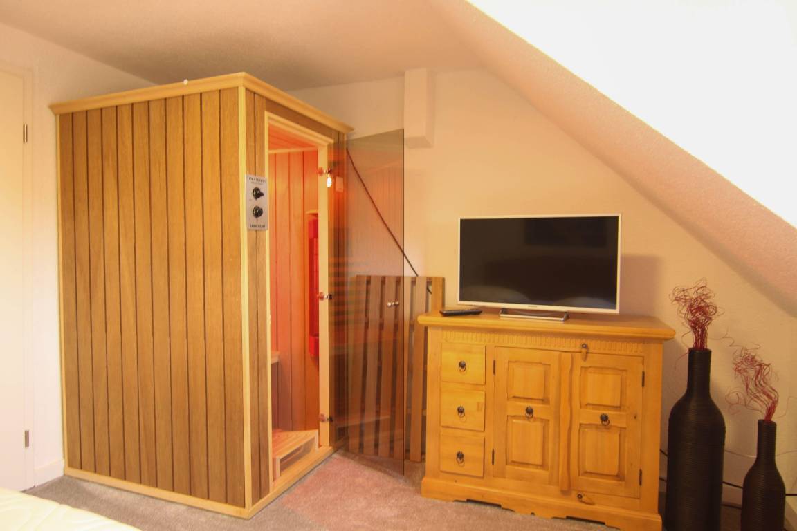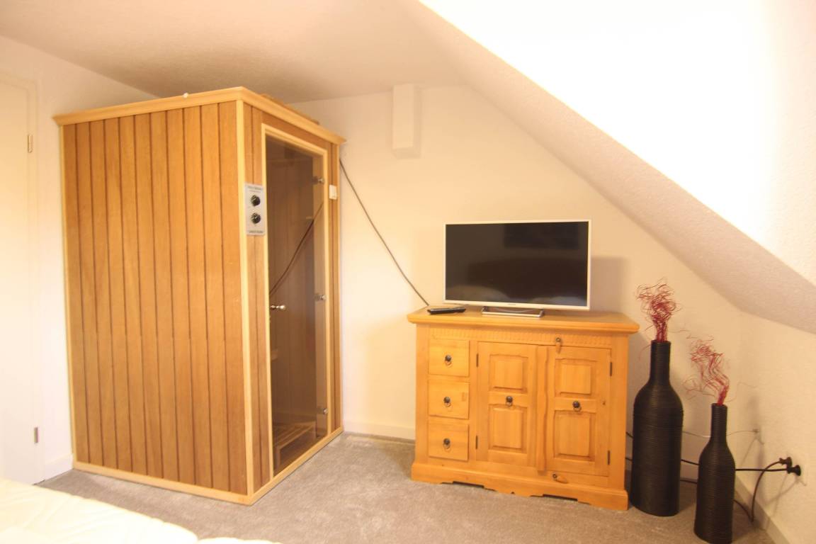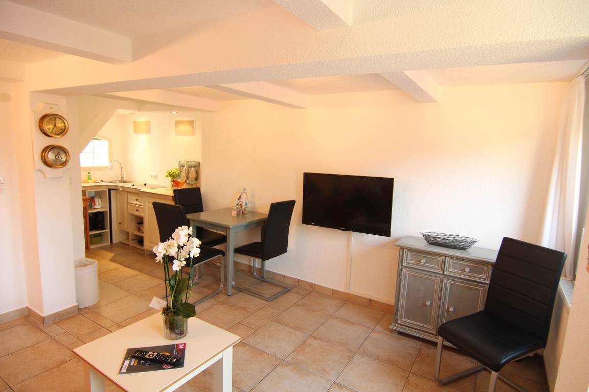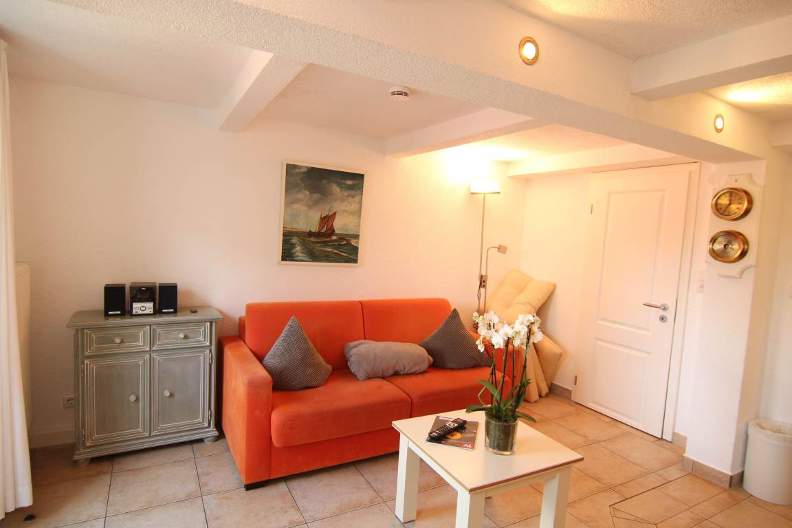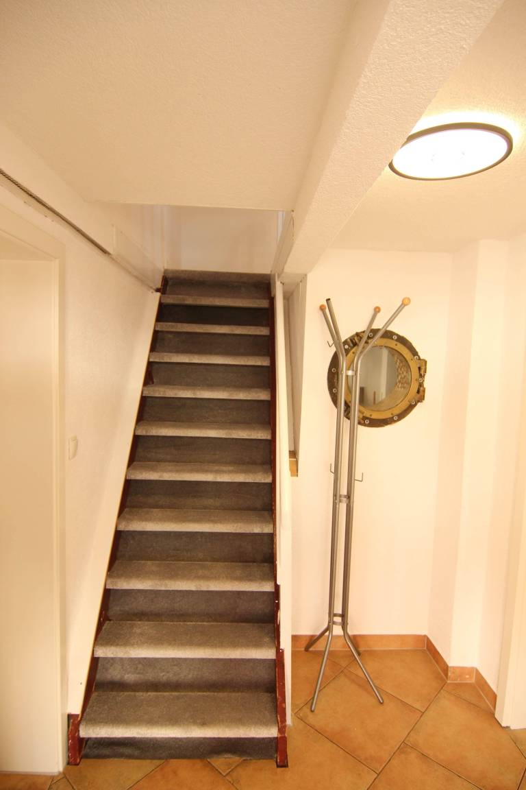 Im unteren Bereich befindet sich der Wohn/Essbereich. Die Küche ist ausgestattet für bis zu 4 Personen. Eine Schlafcouch befindet sich im Wohnzimmer und bietet für weitere 2 Personen Platz. TV / DvDPlayer / Radio / WLAN vorhanden. Von der Wohnstube erreichen Sie die Terrasse mit Strandkorb. Im Unteren Bereich befindet sich das moderne Duschbad mit Fenster, sowie mit Waschmaschine. Im oberen Stock befindet sich das großzügige Schlafzimmer mit TV. Im Flur befindet sich ein Kleiderschrank.