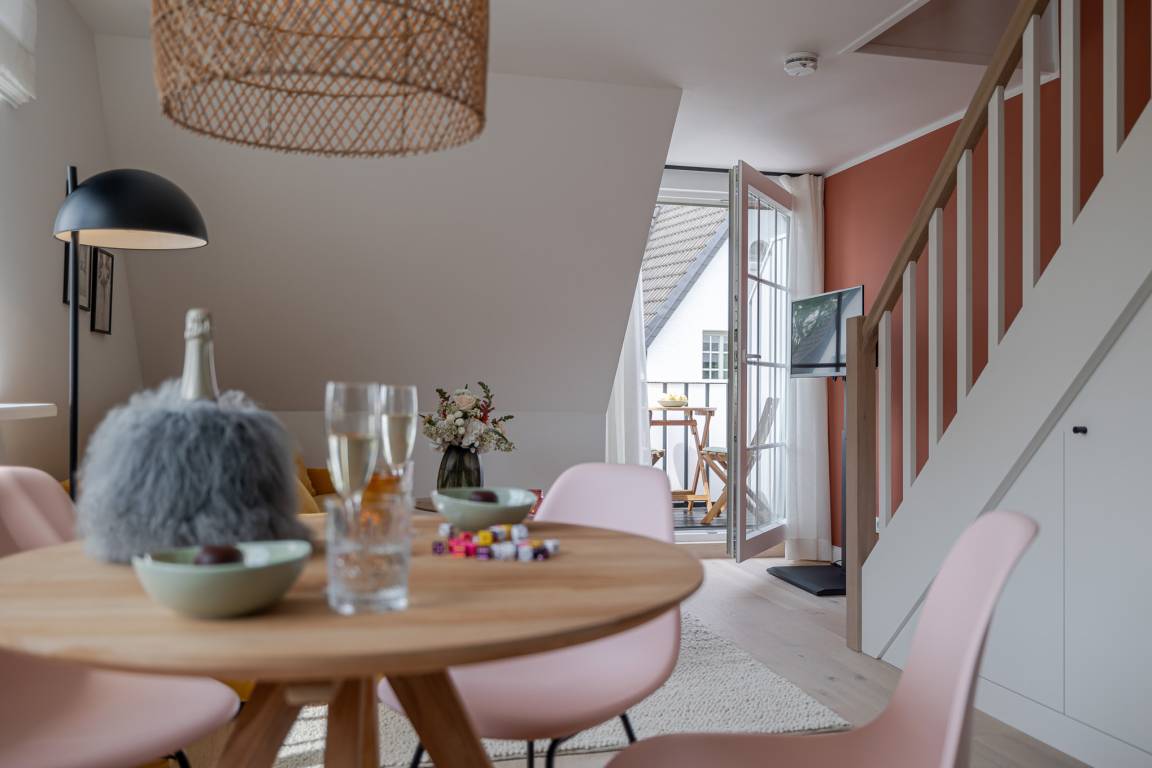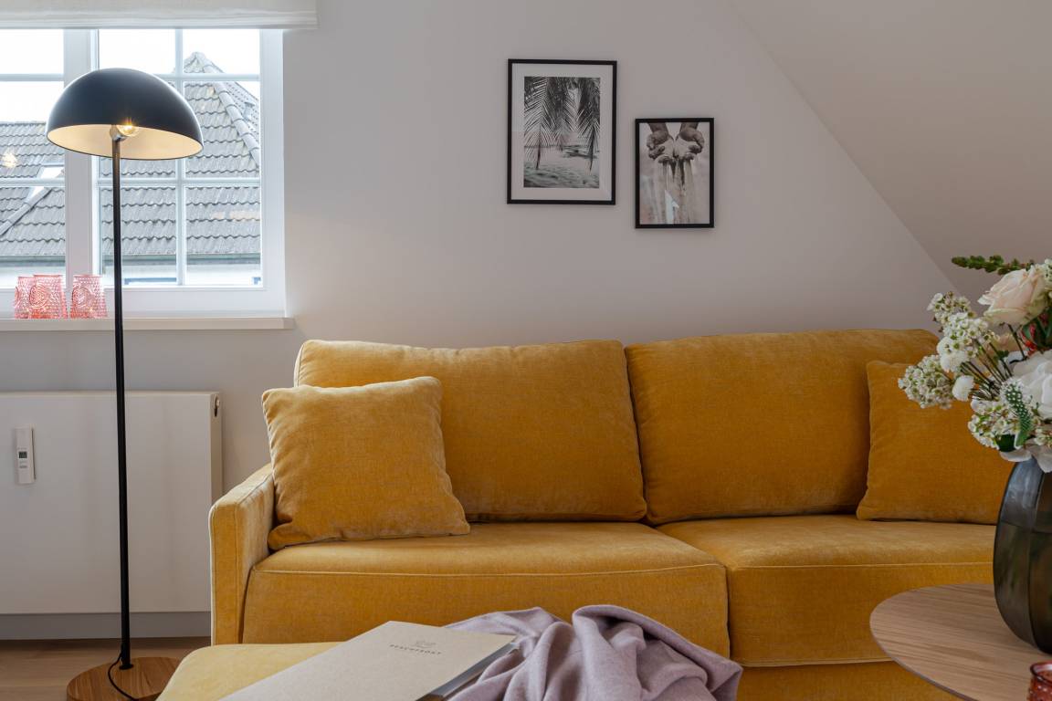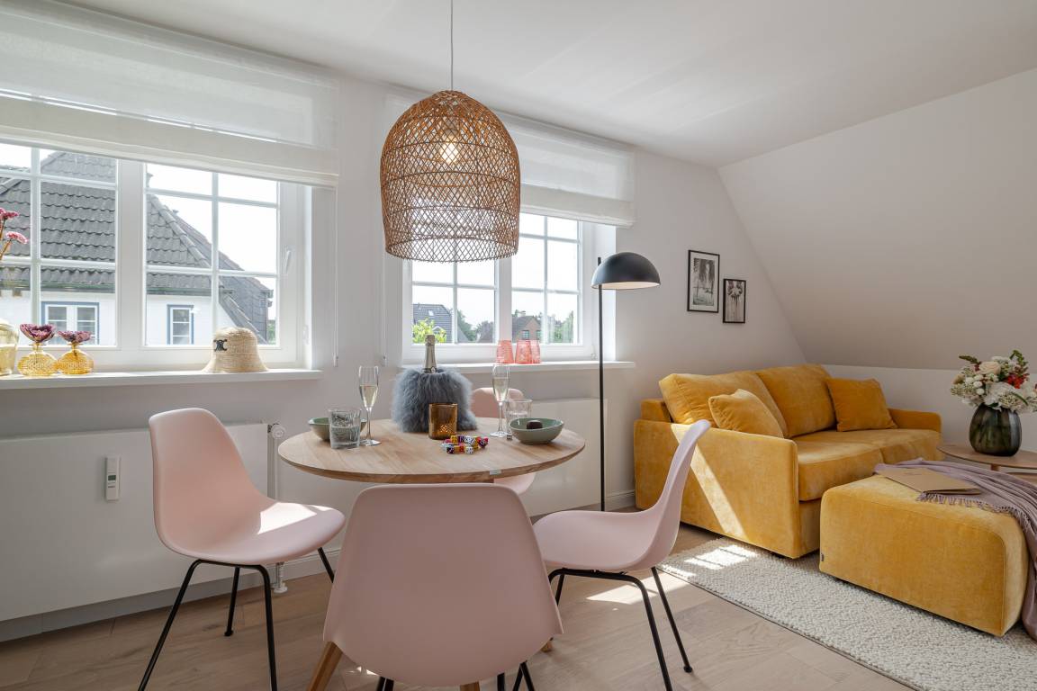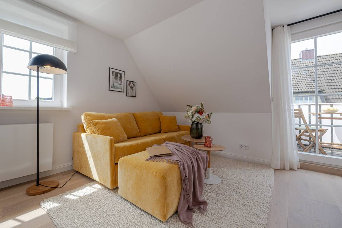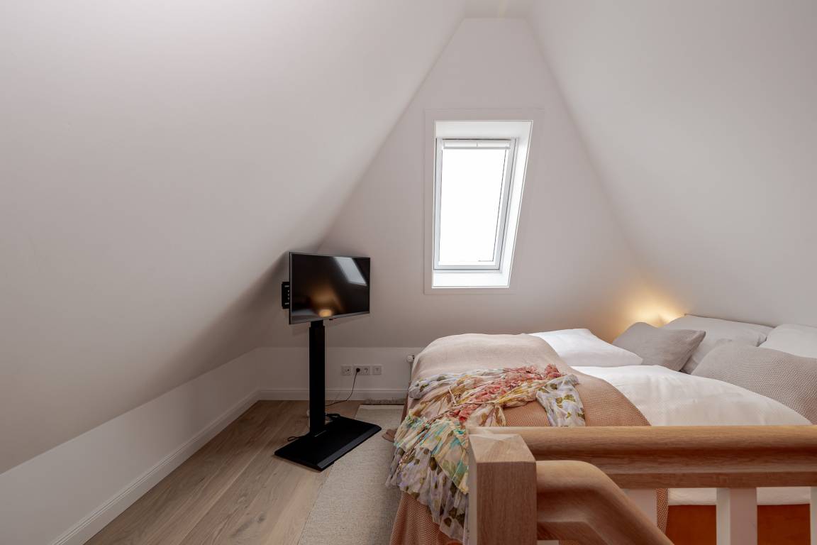 Runter vom Festland und rauf auf die Insel. Im neuen CPTN Nicolai Resort beginnt Ihr Sylt Urlaub genau dort, wo Ankommen leichtfällt. Mitten in Westerland erwartet Sie unsere frisch renovierte Kajüte #12 im Dock 6a. Auf 50 Quadratmetern im Obergeschoss bietet sie viel Raum für bis zu vier Personen und verbindet modernes Design mit nordischer Gemütlichkeit. Schon beim Eintreten spüren Sie die besondere Atmosphäre. Helle lichtdurchflutete Räume, warmes Eichenparkett und liebevoll ausgewählte Details schaffen ein Zuhause auf Zeit, das Ruhe und Inselgefühl vereint. Auf dem Mitteldeck befinden sich der großzügige Wohn und Essbereich sowie die offene Küche. Das moderne Sofa lässt sich bei Bedarf in eine zusätzliche Schlafmöglichkeit verwandeln. Die Küche ist mit Markengeräten unter anderem von Siemens ausgestattet und bietet alles, was Sie für ein entspanntes Frühstück oder ein gemeinsames Abendessen benötigen. Das Bad mit Regendusche, Fußbodenheizung und Handtuchwärmer wird schnell zu Ihrer kleinen Wellnessoase. Über die Treppe gelangen Sie auf das gemütliche Oberdeck mit hochwertigem Schramm Boxspringbett, maßgefertigten Einbauschränken und einer kleinen Sitzecke mit weiterem Schlafsofa. Von Mai bis Oktober lädt der möblierte Balkon dazu ein, den Tag an der frischen Nordseeluft zu beginnen oder ausklingen zu lassen. Als Gast nutzen Sie den 200 Quadratmeter großen Pool und Saunabereich in Dock 6d kostenfrei. Ein 12 mal 4 Meter Pool, eine moderne Sauna, ein Loungebereich und Fitnessgeräte stehen Ihnen zur Verfügung. Hunde sind herzlich willkommen. Ein kostenfreier Parkplatz gehört ebenfalls zu Ihrer Kajüte.