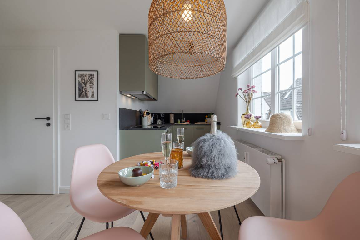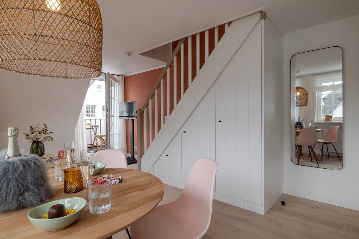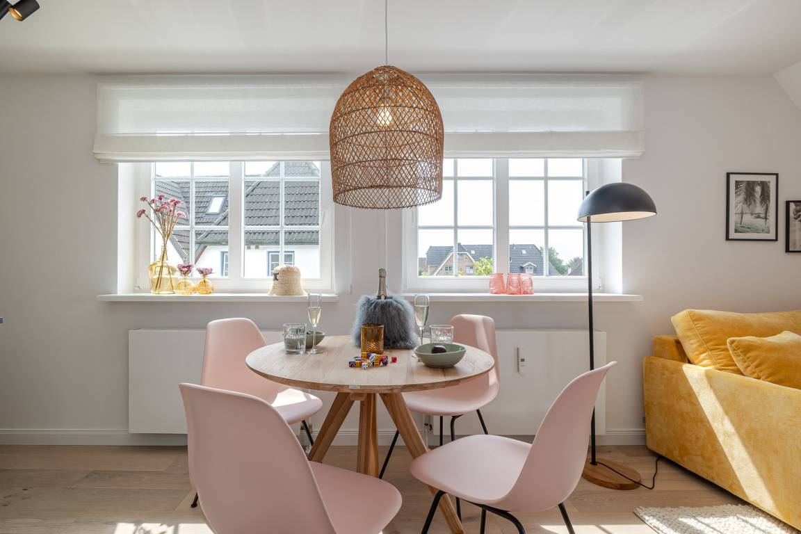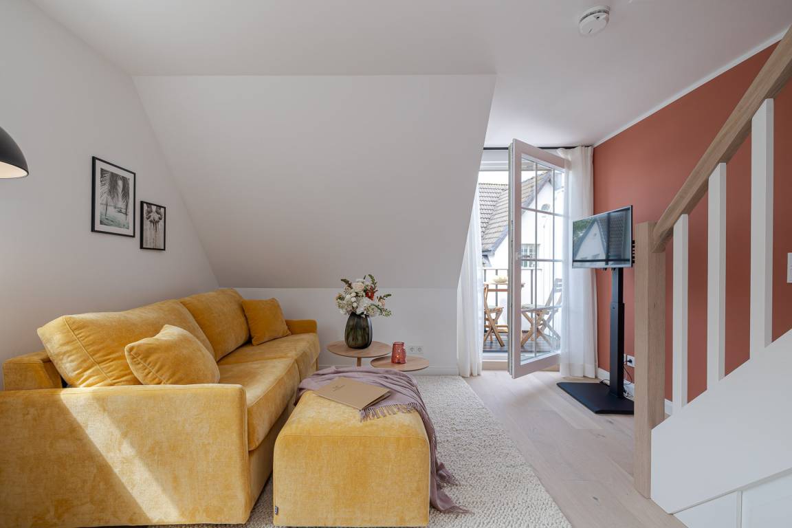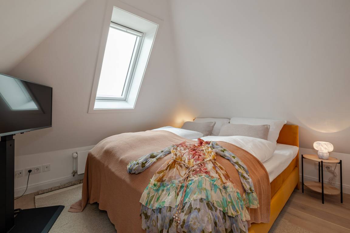 Runter vom Festland und rauf auf die Insel. Im neuen CPTN Nicolai Resort beginnt Ihr Sylt Urlaub genau dort, wo Ankommen leichtfällt. Mitten in Westerland erwartet Sie unsere frisch renovierte Kajüte #12 im Dock 6a. Auf 50 Quadratmetern im Obergeschoss bietet sie viel Raum für bis zu vier Personen und verbindet modernes Design mit nordischer Gemütlichkeit. Schon beim Eintreten spüren Sie die besondere Atmosphäre. Helle lichtdurchflutete Räume, warmes Eichenparkett und liebevoll ausgewählte Details schaffen ein Zuhause auf Zeit, das Ruhe und Inselgefühl vereint. Auf dem Mitteldeck befinden sich der großzügige Wohn und Essbereich sowie die offene Küche. Das moderne Sofa lässt sich bei Bedarf in eine zusätzliche Schlafmöglichkeit verwandeln. Die Küche ist mit Markengeräten unter anderem von Siemens ausgestattet und bietet alles, was Sie für ein entspanntes Frühstück oder ein gemeinsames Abendessen benötigen. Das Bad mit Regendusche, Fußbodenheizung und Handtuchwärmer wird schnell zu Ihrer kleinen Wellnessoase. Über die Treppe gelangen Sie auf das gemütliche Oberdeck mit hochwertigem Schramm Boxspringbett, maßgefertigten Einbauschränken und einer kleinen Sitzecke mit weiterem Schlafsofa. Von Mai bis Oktober lädt der möblierte Balkon dazu ein, den Tag an der frischen Nordseeluft zu beginnen oder ausklingen zu lassen. Als Gast nutzen Sie den 200 Quadratmeter großen Pool und Saunabereich in Dock 6d kostenfrei. Ein 12 mal 4 Meter Pool, eine moderne Sauna, ein Loungebereich und Fitnessgeräte stehen Ihnen zur Verfügung. Hunde sind herzlich willkommen. Ein kostenfreier Parkplatz gehört ebenfalls zu Ihrer Kajüte.
